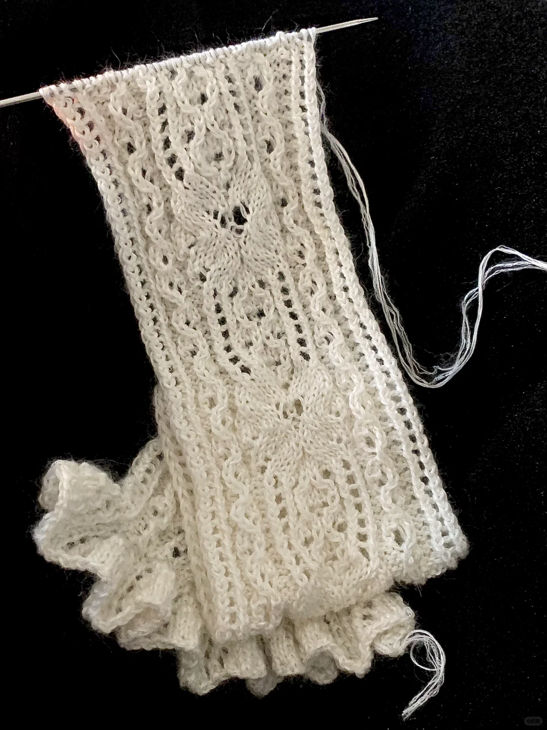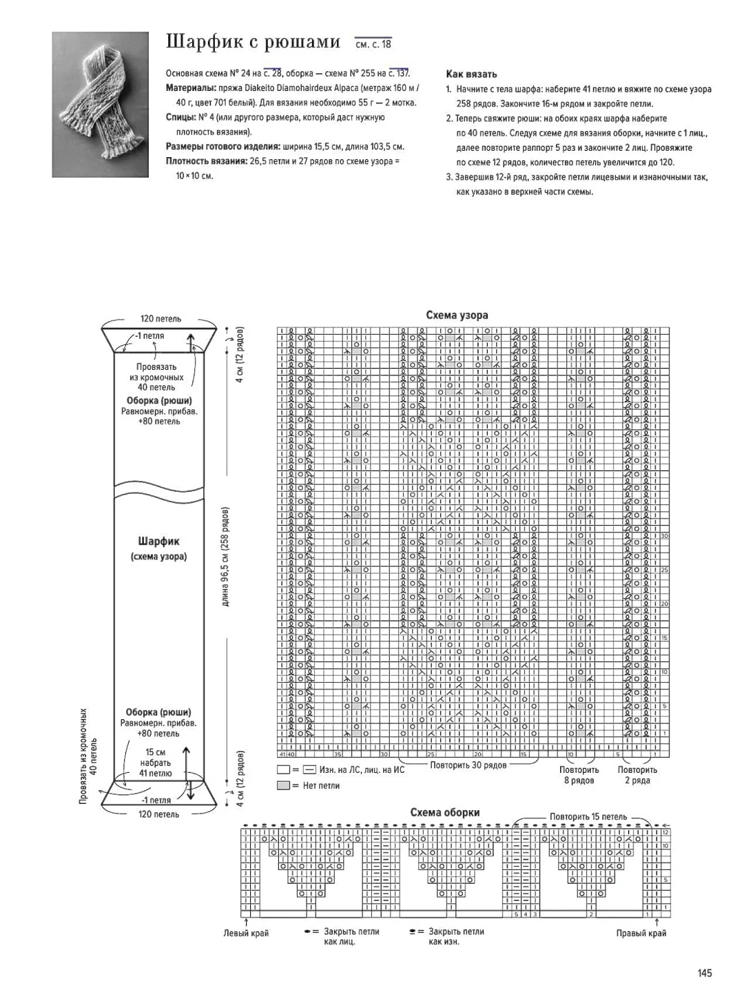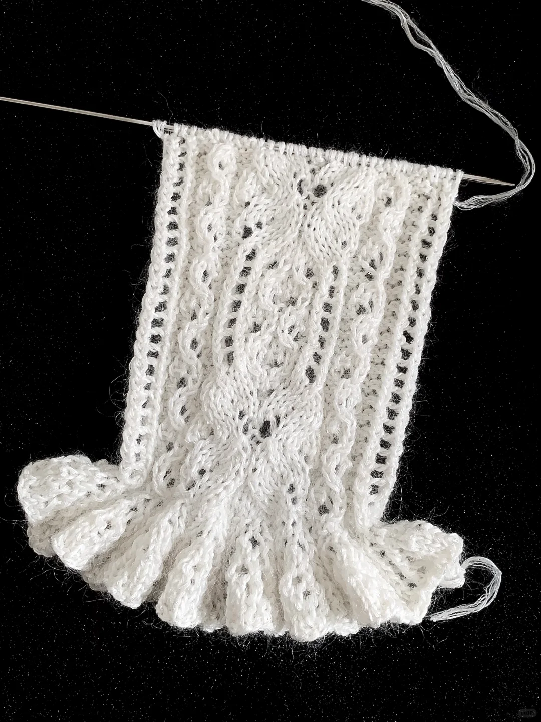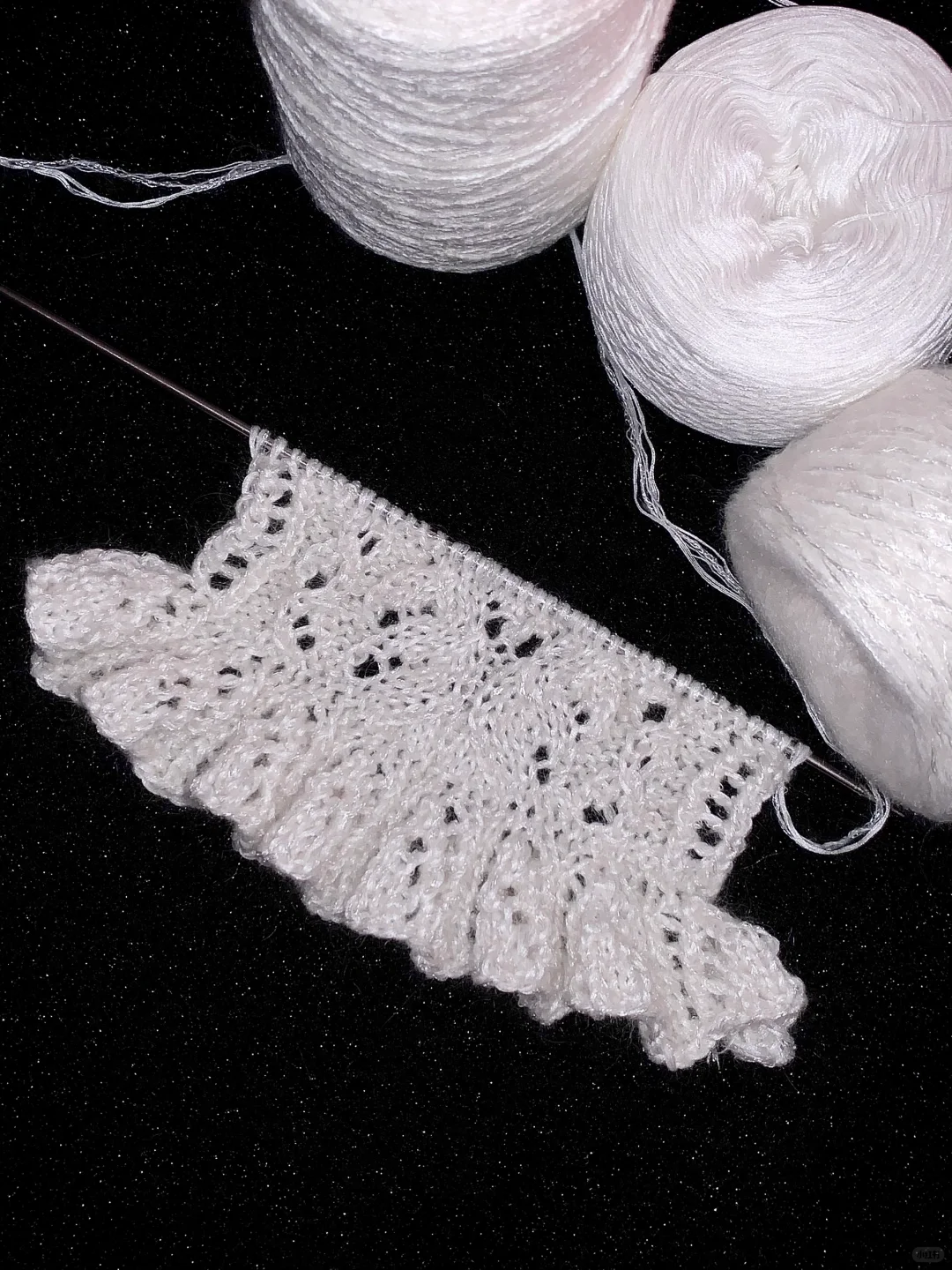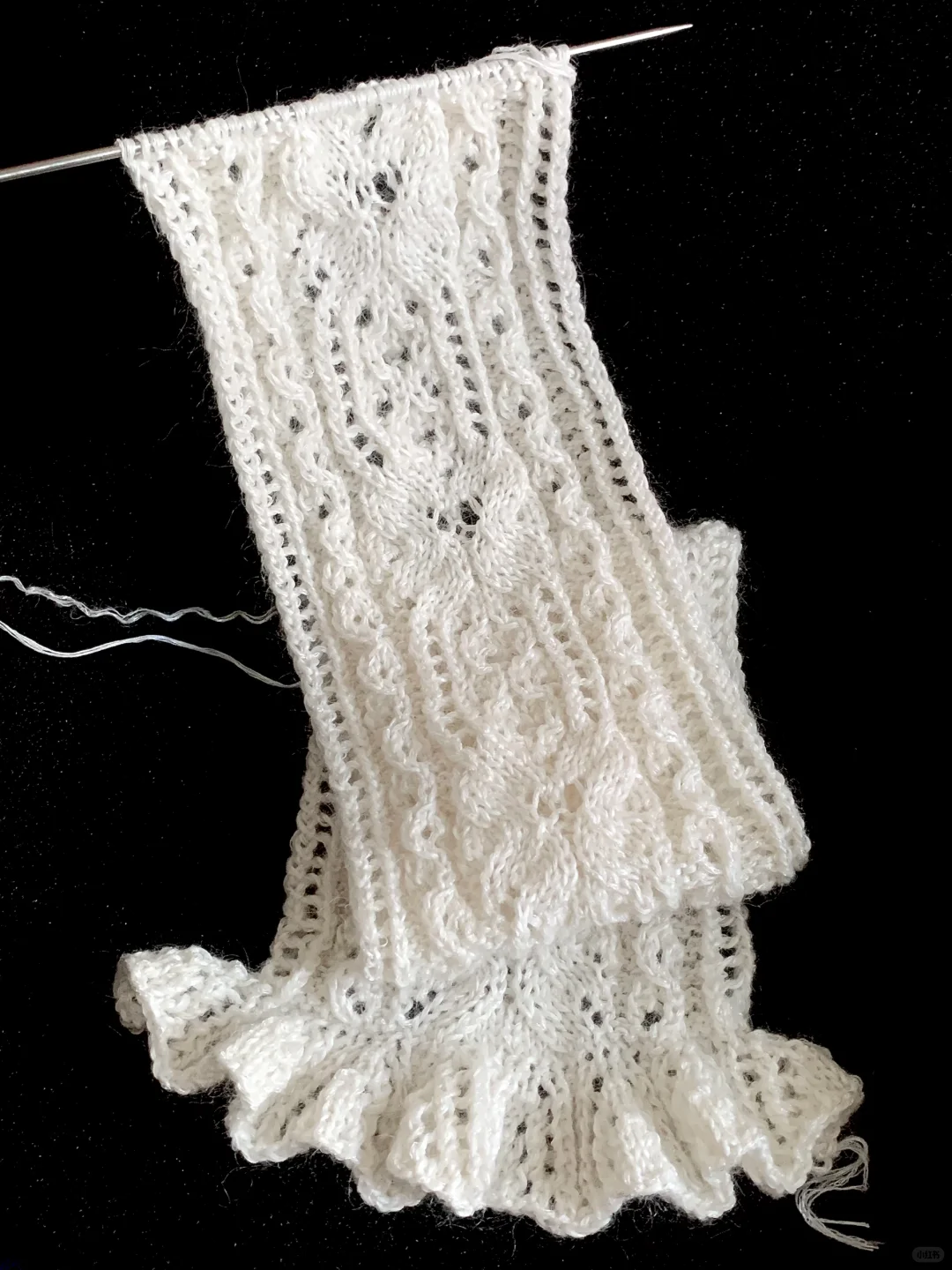 初春时节,我就织到了自己的年度围巾~\n蕾丝般带褶皱的镂空花围巾,美到窒息\n \n法式~浪漫~精致…~\n \n我用多股团子编织,围巾会偏柔和厚实些\n春寒天气,就越是想要温暖,与柔软为伴\n \n【围巾图解注解】\n单数行为正面行,图解从右往左看\n双数行即反面行,图解从左往右看(织相反符号)\n \n符号\nI:正针|o:加针|空白处:反针|黑空白:无针目\n人:左上2并1|入:右上2并1(多了尾巴是3并1)\nR: 左上2并1扭针|反方向的R: 右上2并1扭针\nΩ:扭针|收针方式:上套针、下套交替着收针\n \n底边起针40,围巾起针41\n \n单股编织的话,围巾显得迷你秀气\n志田瞳的书本里,围巾是迷你款型\n \nTips: 30行作一个循环,先织主体还是尾巴看自己\n边针的第一针正挑,最后一针反针,不容易出错\n \n如果有其它问题的话我会后期补充\n编织新手大胆尝试,手工就是探索\n \n#我的手工日常 @手工薯 @生活薯 @生活研究所\n#织围巾 #围巾 #棒针编织 #编织教程 #手工编织\n#棒针教程 #棒针编织 #棒针图解 #棒针 #教程\n#棒针花样 #手作日常 #围巾教程 #一起玩毛线\n#毛线 #毛线编织 #志田瞳花样 #手工编织围巾