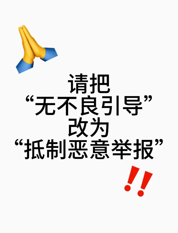发现好多正常的笔记都因为有人恶意举报而被误判,然后写无不良引导,这些人是清白的,是受害者,而不是因为有错才删除笔记。审核有的时候误判是可以理解的,作者们发布正常的笔记也是应该支持的,但恶意举报不能容忍。一些人因为过于情绪化,或者抱着试一试的心态去举报,给作者们带来了很大的麻烦,无论是在实际操作上还是在情绪价值上。因为恶意举报,才有本不必要的自证,才有本不必要的失落和本不必要的影响观感。正是因为我们是清白的,我们才不必自证,要回击伤害我们的人,使恶意举报被重视、抵制和禁止。所以请把“无不良引导”改为“抵制恶意举报”,不必向没有正常逻辑和正常态度的人自证,要坚决抵制恶意举报,让敌人不敢再作恶。\n还有,再强调一下,①政史、时政等客观信息的发布不等于宣传不良价值观(怎么可能说一两个人物或国家就是不良价值观了呢是不是??以正常人的逻辑都能想清楚)我们也知道历史,明白和平的可贵,在实践中已经知道了应该珍爱和平,怎么可能因为客观信息或娱乐就改变立场呢?(太扯了对吧。)所以某些情绪化、抠字眼乱断句挑毛病的人注意点。不止政史,无论什么信息,如果只是字眼或其他没有表明立场的,都不可能有不良引导!!!拒绝词汇污名化、敏感化②谈论他人带来的问题不等于引战。引战是无缘无故挑起矛盾,就说个问题还能叫引战??(太扯了吧)如果这样都叫引战的话,你们遇到的问题什么时候能被看见?(指那些恶意举报的)③二创不等于抄袭。没有标明出处就用别人作品才叫抄袭,二创只用人物画个画或剪个视频,就算截了图也是打了tag的呀,有些人二创还要举报,说是“严重抄袭”,太扯了吧?!纯粹是无聊或者不理智宣泄的。\n#整治社会不良风气 #维护社会公平正义 #拒绝网络戾气 #想让更多人看到 #谁主张谁举证 #抵制恶意举报 #必须严惩坏人 #勿以恶小而为之 #净化网络环境靠大家#恶意举报可耻