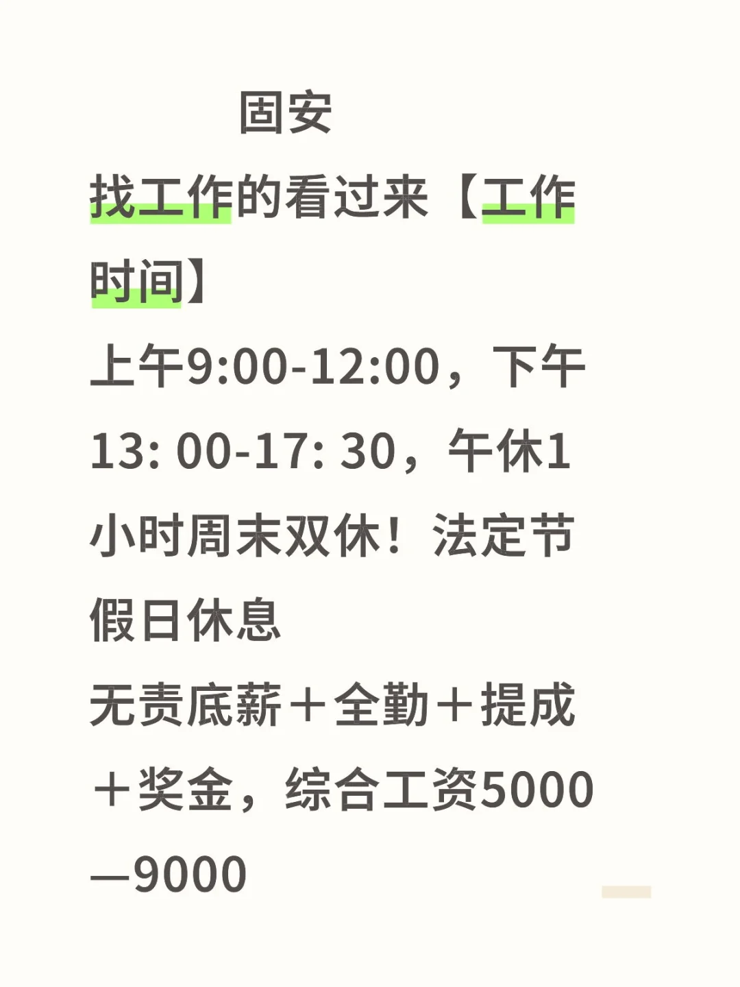 招 客户经理 客服 两个岗位\n#初创公司 互联网金融(18—35岁)\n \n找工作的看过来【工作时间】\n上午9:00-12:00,下午13: 00-17: 30,午休1小时周末双休!法定节假日休息\n无责底薪+全勤+提成+奖金,综合工资5000—9000\n有需要私聊(询问前请仔细阅读文案)\n地址: 赛米大厦西门二楼榕合咨询\n \n#轻松工作氛围 #早九晚五双休的工作 #招不到人啊谁懂啊 #推荐好的工作