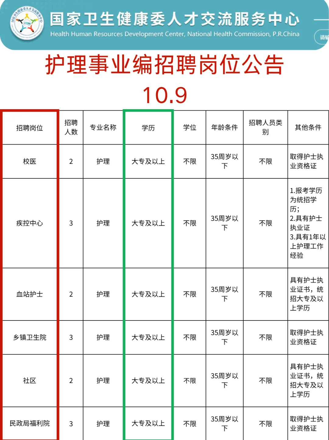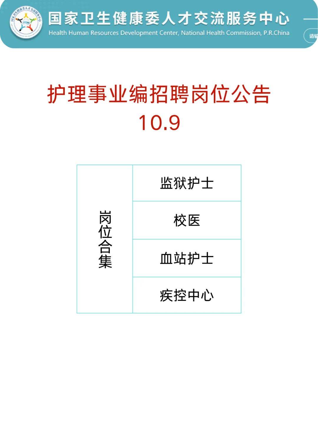 10月9日护理事业编招聘岗位(校医 监狱 血