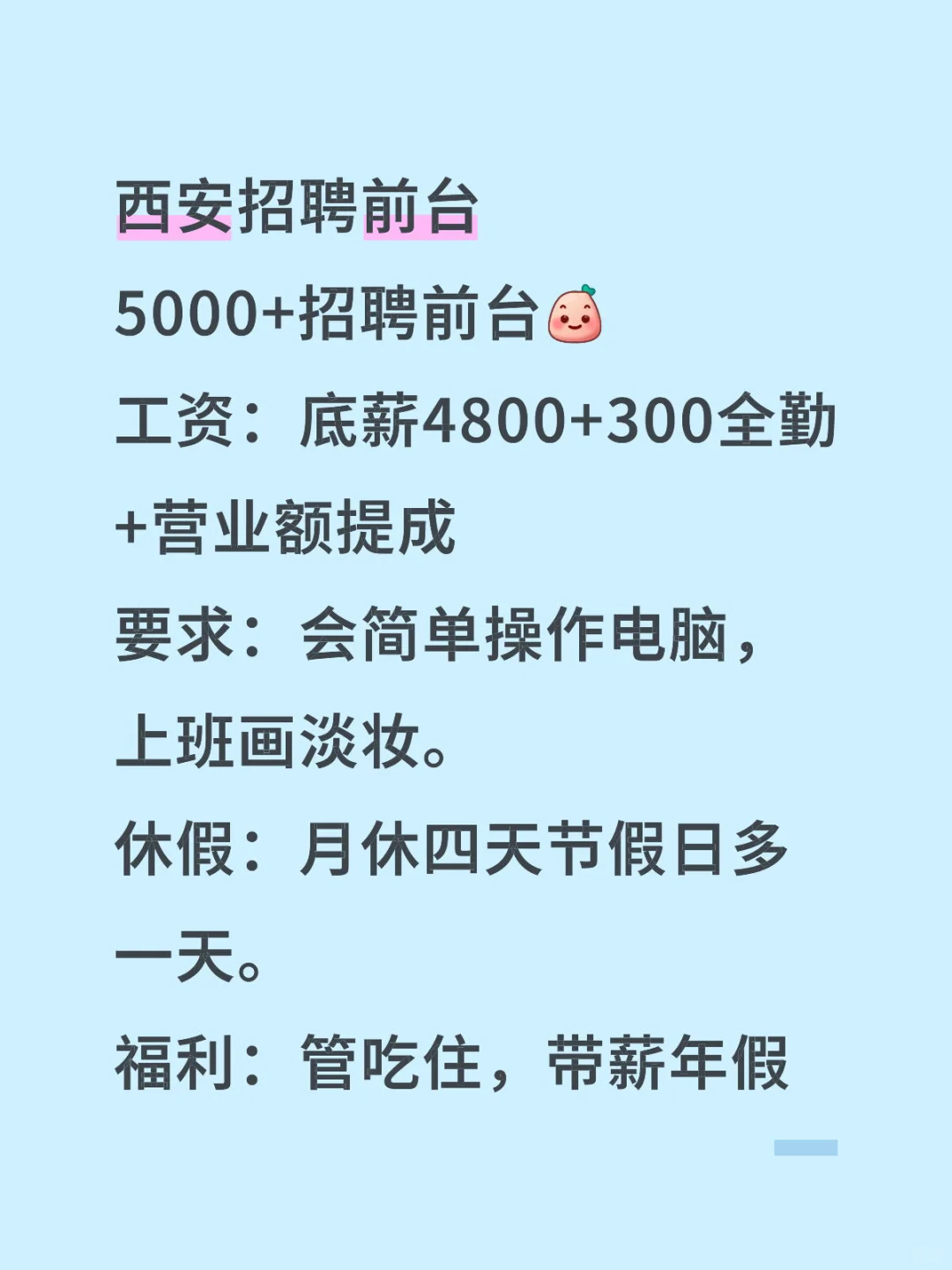 \n工资:底薪4800+300全勤+营业额提成\n要求:会简单操作电脑,上班画淡妆。\n休假:月休四天节假日多一天。\n福利:管吃住,带薪年假