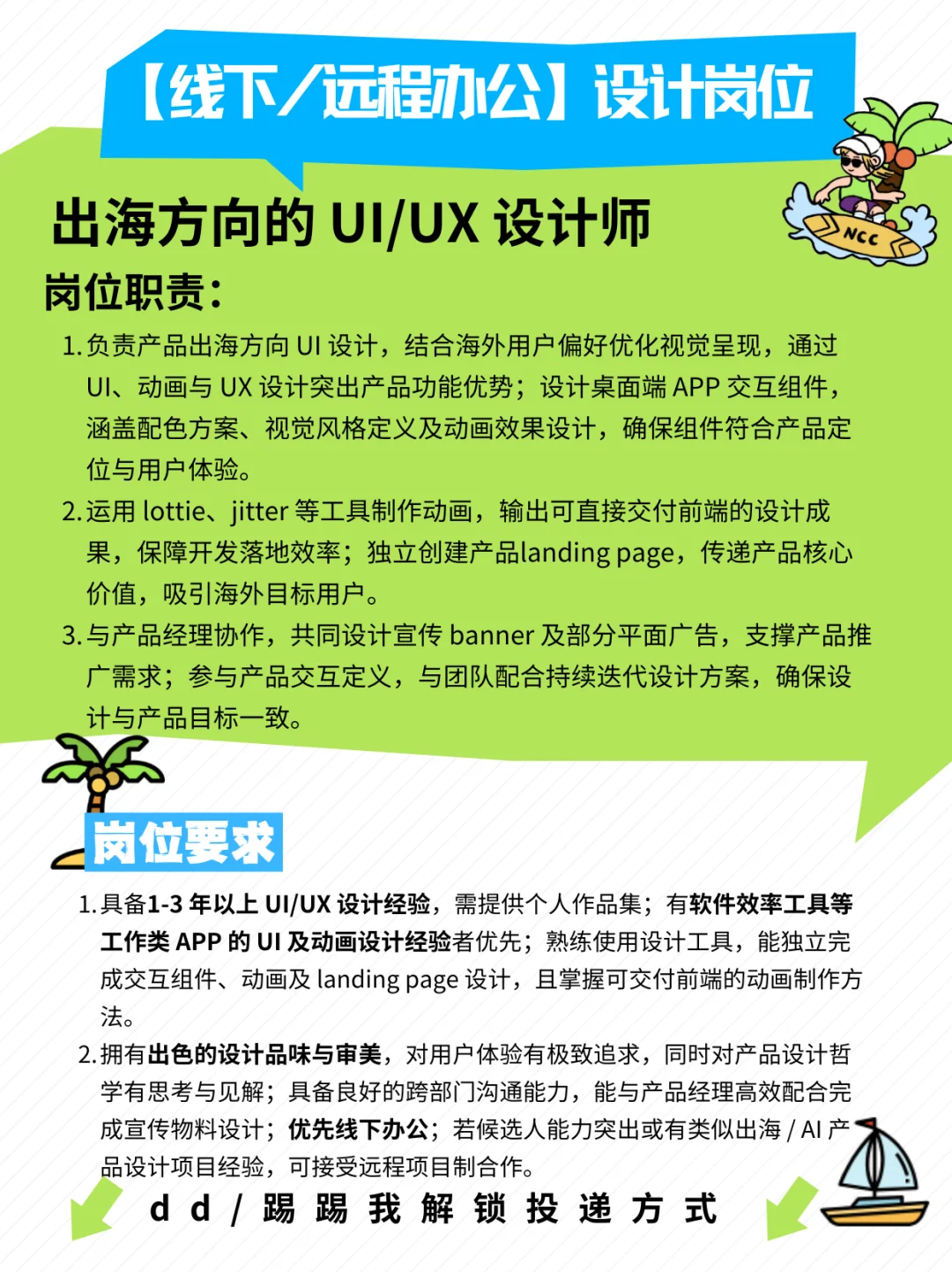 岗位职责:\n负责产品出海方向 UI 设计,结合海外用户偏好优化视觉呈现,通过 UI、动画与 UX 设计突出产品功能优势。\n设计桌面端 APP 交互组件,涵盖配色方案、视觉风格定义及动画效果设计,确保组件符合产品定位与用户体验。\n运用 lottie、jitter 等工具制作动画,输出可直接交付前端的设计成果,保障开发落地效率。\n独立创建产品landing page,传递产品核心价值,吸引海外目标用户。\n与产品经理协作,共同设计宣传 banner 及部分平面广告,支撑产品推广需求。\n参与产品交互定义,与团队配合持续迭代设计方案,确保设计与产品目标一致。\n \n岗位需求:\n经验要求:具备1-3 年以上 UI/UX 设计经验,需提供个人作品集;有软件效率工具等工作类 APP 的 UI 及动画设计经验者优先。\n技能要求:熟练使用设计工具,能独立完成交互组件、动画及 landing page 设计,且掌握可交付前端的动画制作方法。\n能力要求:拥有出色的设计品味与审美,对用户体验有极致追求,同时对产品设计哲学有思考与见解。\n协作要求:具备良好的跨部门沟通能力,能与产品经理高效配合完成宣传物料设计。\n工作方式:优先线下办公;若候选人能力突出或有类似出海 / AI 产品设计项目经验,可接受远程项目制合作。\n#数字游民生活方式 #只工作不上班 #数字游民社区 #UI设计师 #远程工作 #交互设计 #NCC社区 #如何成为数字游民 #远程办公 #游牧岛