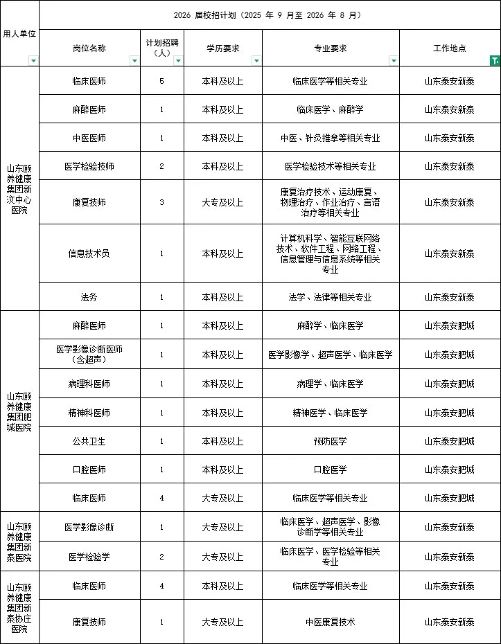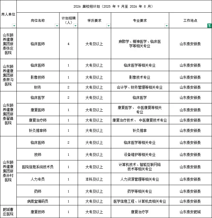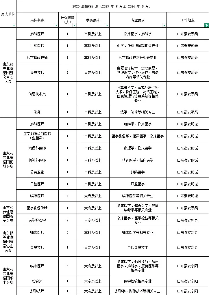 山东颐养健康产业发展集团有限公司招聘463人\n其中泰安岗位招聘58人,集中在新泰肥城宁阳地区\n \n招聘对象:\n2026年应届毕业生+择业期内(毕业两年内)未落实工作单位的毕业生\n \n专业对口。专科及以上学历,具体岗位要求查看岗位表\n \n根据岗位类别组织的笔试面试,具体考试时间和地点另行通知\n \n#医疗工作者 #医疗卫生招聘考试 #泰安医疗卫生招聘考试 #泰安医疗卫生招聘 #泰安中公