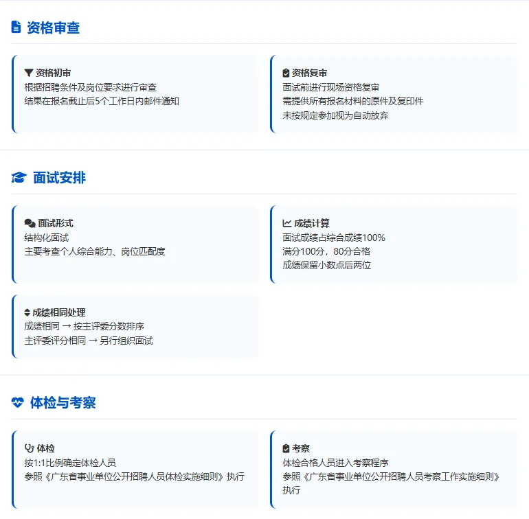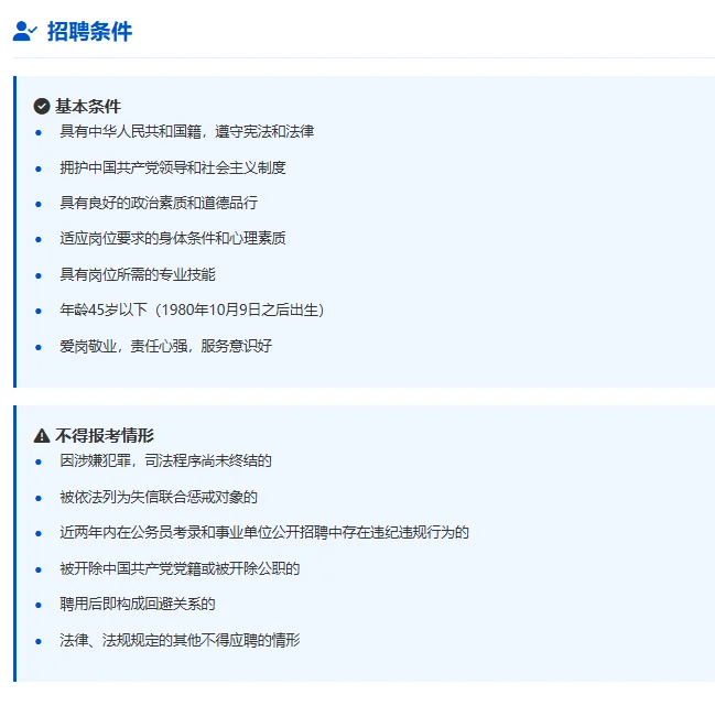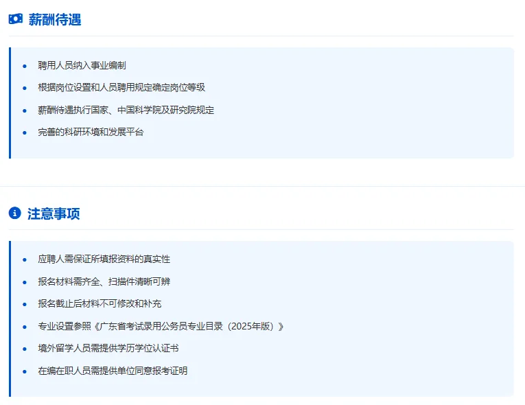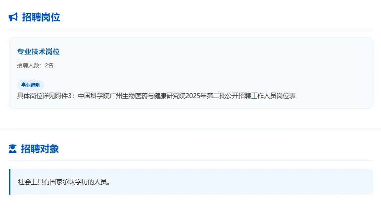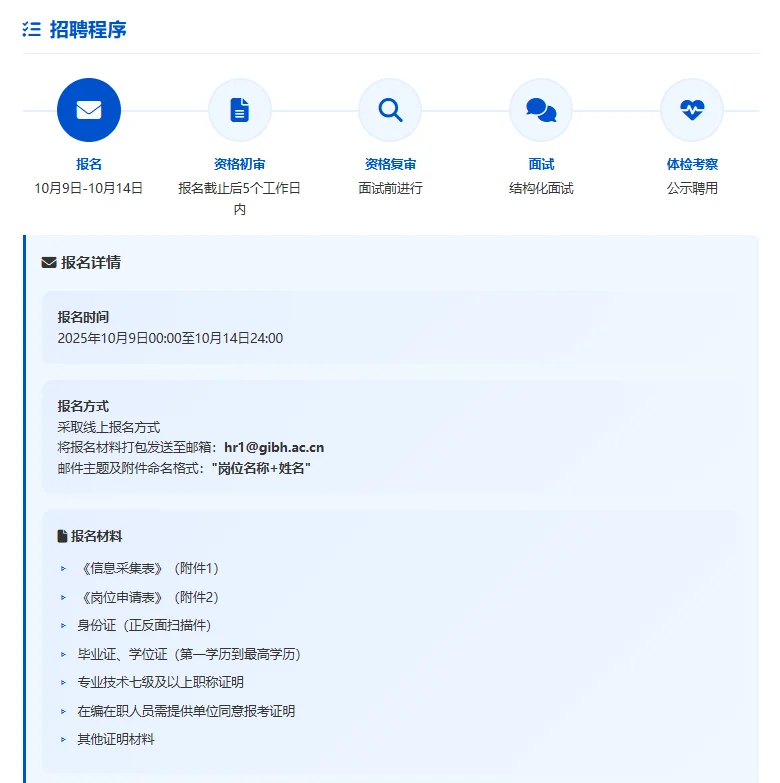 2个事业编岗位,科研人的宝藏机会!🔬\n2025年第二批公开招聘2名事业编制工作人员\n🏛️ 单位背景\n国家级科研平台:中科院、广东省、广州市三方共建,2006年正式成立\n💼 招聘详情\n岗位类型:专业技术岗位\n招聘人数:2名\n编制性质:事业编制(公益一类事业单位)\n工作地点:广州市黄埔区\n🎯 招聘对象\n社会上具有国家承认学历的人员\n港澳台及国外留学人员需提供教育部学历认证\n📋 基本条件\n中国国籍,遵纪守法,政治素质好\n年龄45岁以下(1980年10月9日后出生)\n具备岗位所需的专业技能和身体条件\n爱岗敬业,责任心强,服务意识好\n❌ 不得报考情形\n涉嫌犯罪司法程序未终结的\n失信联合惩戒对象\n近两年内有考试违纪行为的\n被开除党籍或公职的\n存在回避关系情形的\n⏰ 招聘流程\n网上报名:10月9日-10月14日(抓紧时间!)\n资格初审:报名后5个工作日内邮件通知\n资格复审:面试前现场审核材料\n结构化面试:主要考察综合能力和岗位匹配度\n体检考察:合格后公示聘用\n📝 报名方式\n纯线上报名:将材料打包发送至邮箱 hr1@gibh.ac.cn\n邮件标题:\"岗位名称+姓名\"\n需准备材料:\n信息采集表、岗位申请表\n身份证、学历学位证书扫描件\n专业技术七级及以上职称证明\n在编人员需单位同意报考证明\n💰 薪酬待遇\n事业编制:纳入正式事业编制\n完善福利:执行国家、中科院及研究院规定\n科研环境:顶尖实验室平台和职业发展通道\n稳定保障:完善的薪酬体系和福利待遇\n🔬 研究院平台亮点\n细胞谱系研究中心、数字生物医学研究中心等5大科研单元\n广东省干细胞与再生医学重点实验室等多个省部级平台\n呼吸疾病全国重点实验室(与广医大共建)\n免疫治疗全国重点实验室(与中科大大共建)\n💡 适合人群\n想在国家级科研平台发展的科研人员\n追求事业编制稳定性的高学历人才\n具备生物医药相关专业背景的求职者\n能接受科研工作强度和要求的专业人士\n#事业单位备考 #中科院招聘 #科研岗位 #事业编制 #广州工作