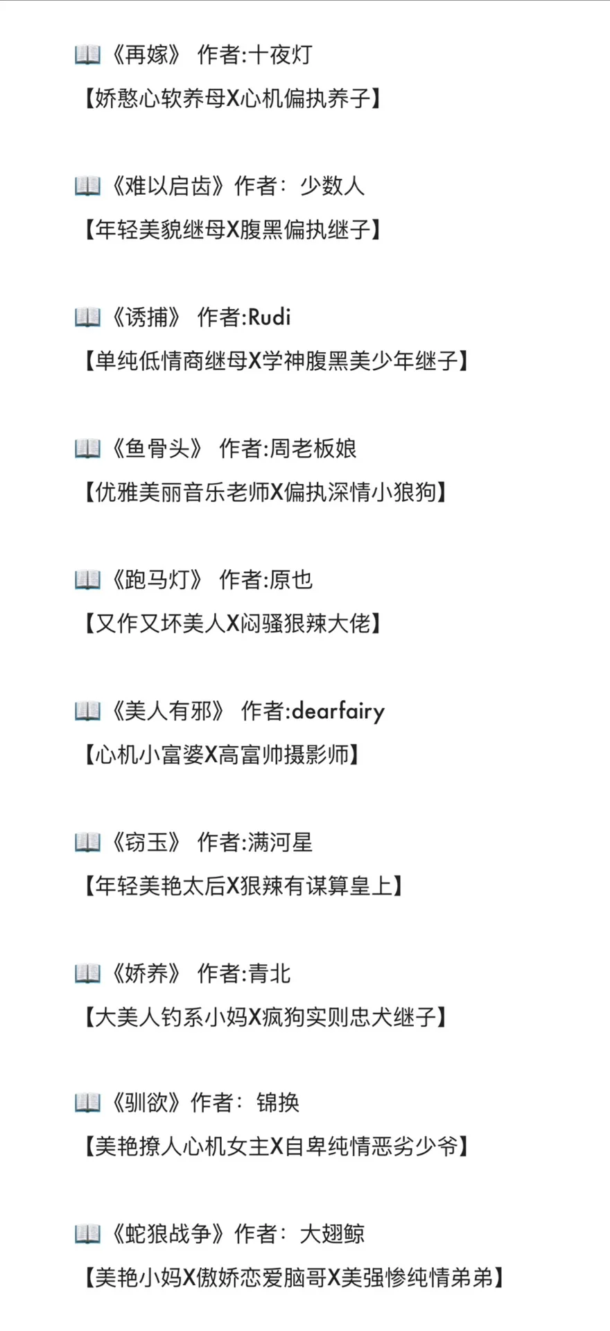 📖《再嫁》 作者:十夜灯\n【娇憨心软养母X心机偏执养子】\n \n📖《难以启齿》作者:少数人\n【年轻美貌继母X腹黑偏执继子】\n \n📖《诱捕》 作者:Rudi\n【单纯低情商继母X学神腹黑美少年继子】\n \n📖《鱼骨头》 作者:周老板娘\n【优雅美丽音乐老师X偏执深情小狼狗】\n \n📖《跑马灯》 作者:原也\n【又作又坏美人X闷骚狠辣大佬】\n \n📖《美人有邪》 作者:dearfairy\n【心机小富婆X高富帅摄影师】\n \n📖《窃玉》 作者:满河星\n【年轻美艳太后X狠辣有谋算皇上】\n \n📖《娇养》 作者:青北\n【大美人钓系小妈X疯狗实则忠犬继子】\n \n📖《驯欲》作者:锦换\n【美艳撩人心机女主X自卑纯情恶劣少爷】\n \n📖《蛇狼战争》作者:大翅鲸\n【美艳小妈X傲娇恋爱脑哥哥X美强惨纯情弟弟】\n#白切黑男主 #小说代入感 #推文
