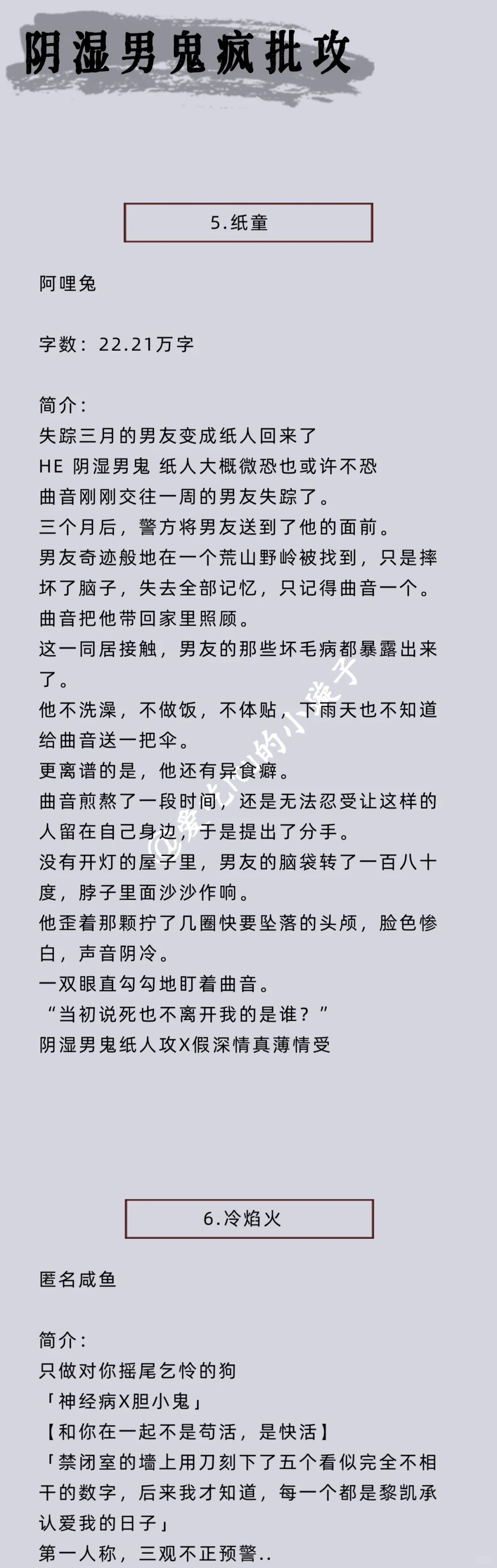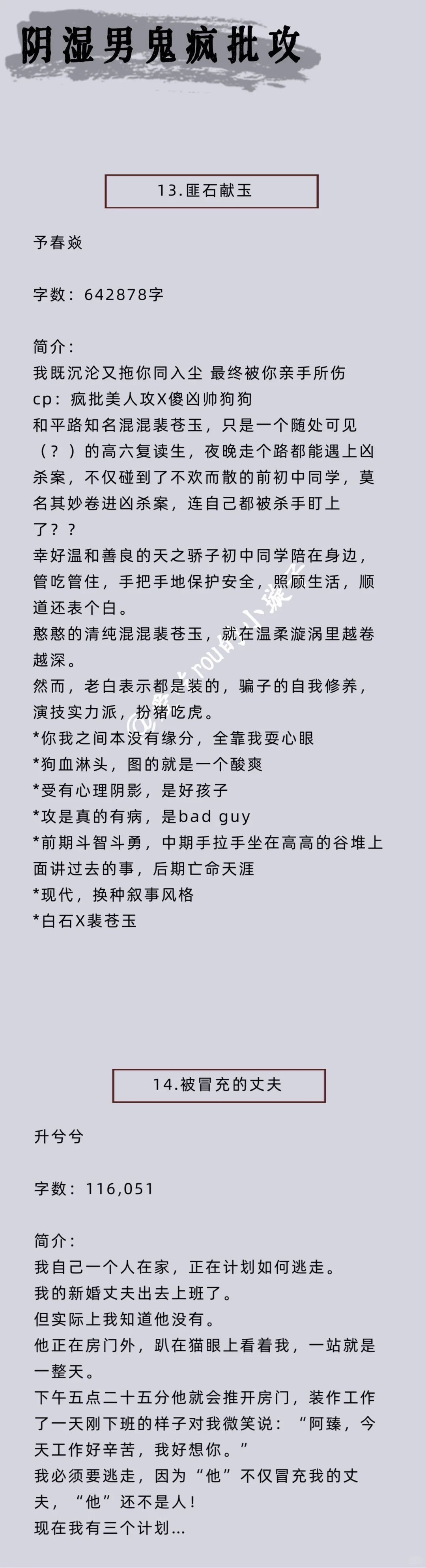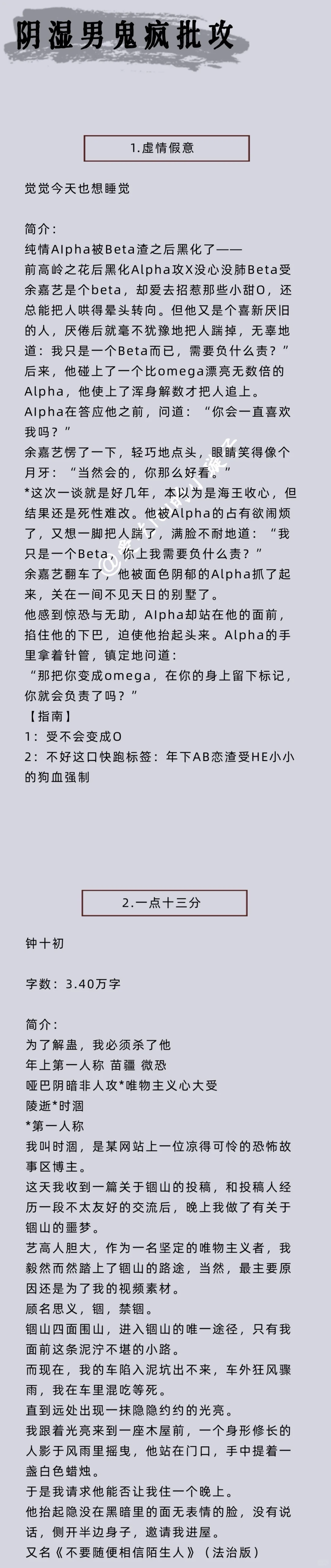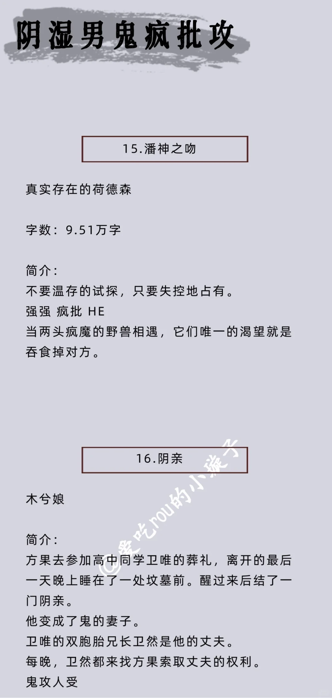 1.《虚情假意》作者:觉觉今天也想睡觉\n2.《一点十三分》作者:钟十初\n3.《可怜的社畜》作者:东度日\n4.《他死之后我开始撞鬼》作者:阿哩兔\n5.《纸童》作者:阿哩兔\n6.《冷焰火》作者:匿名咸鱼\n7.《我的专属跟踪狂》作者:桃白百\n8.《道德沦丧》作者:困崽\n9.《鬼夫人》作者:w山罔\n10.《恶魔的本性》作者:苏甫白\n11.《这该死的求生欲》作者:望三山\n12.《今日无恙》作者:折周\n13.《匪石献玉》作者:予春焱\n14.《被冒充的丈夫》作者:升兮兮\n15.《潘神之吻》作者:真实存在的荷德森\n16.《阴亲》作者:木兮娘\n#我的私人书单 #纯爱小说 #阴湿男鬼攻 #阴湿男鬼1 #小说合集#疯批攻 #病娇攻 #阴湿攻
