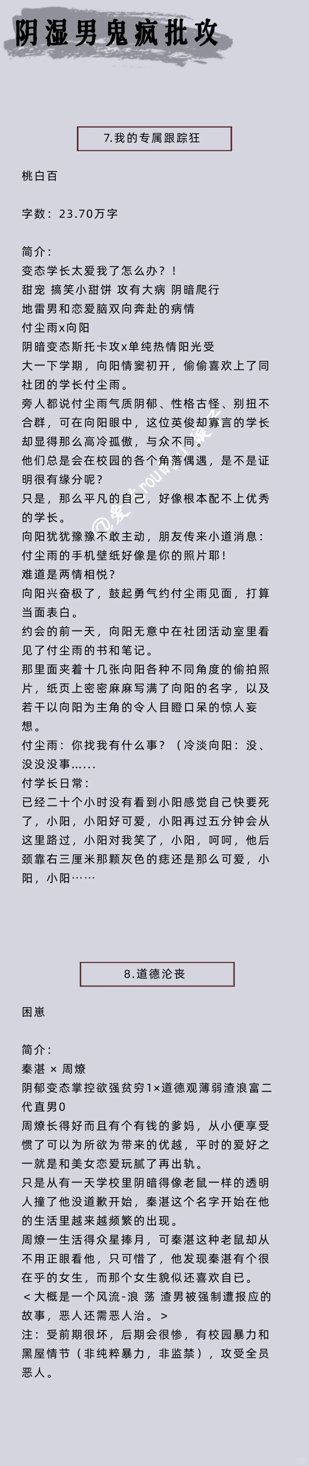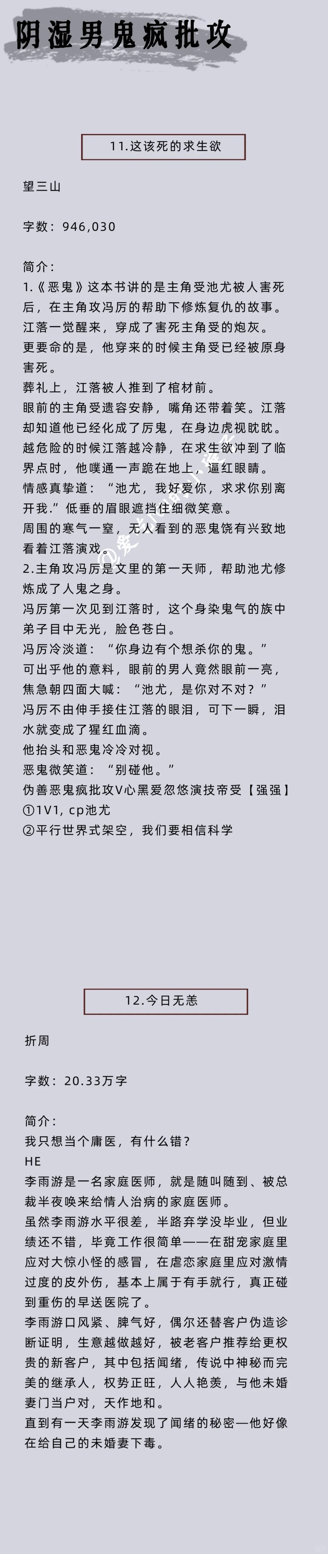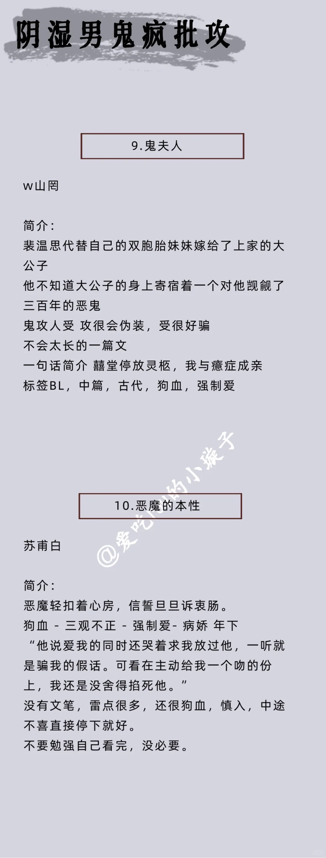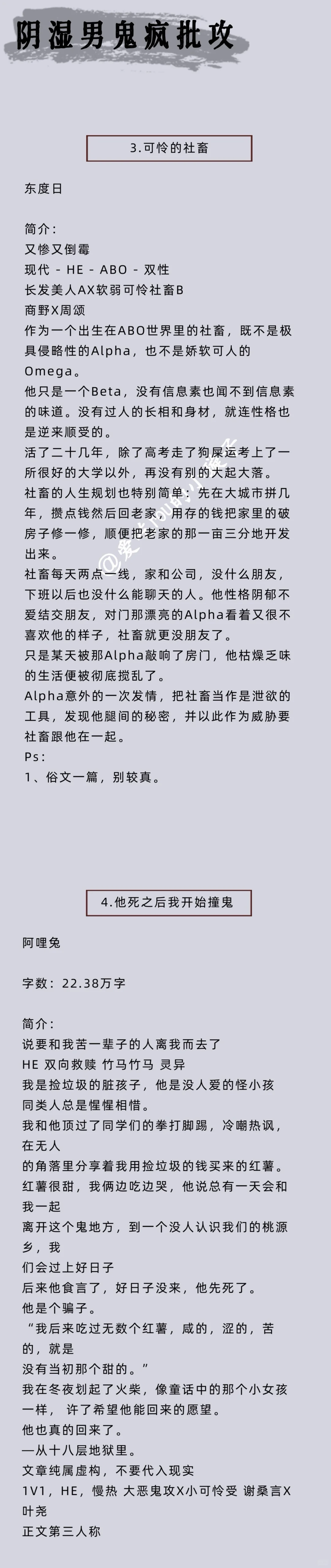 1.《虚情假意》作者:觉觉今天也想睡觉\n2.《一点十三分》作者:钟十初\n3.《可怜的社畜》作者:东度日\n4.《他死之后我开始撞鬼》作者:阿哩兔\n5.《纸童》作者:阿哩兔\n6.《冷焰火》作者:匿名咸鱼\n7.《我的专属跟踪狂》作者:桃白百\n8.《道德沦丧》作者:困崽\n9.《鬼夫人》作者:w山罔\n10.《恶魔的本性》作者:苏甫白\n11.《这该死的求生欲》作者:望三山\n12.《今日无恙》作者:折周\n13.《匪石献玉》作者:予春焱\n14.《被冒充的丈夫》作者:升兮兮\n15.《潘神之吻》作者:真实存在的荷德森\n16.《阴亲》作者:木兮娘\n#我的私人书单 #纯爱小说 #阴湿男鬼攻 #阴湿男鬼1 #小说合集#疯批攻 #病娇攻 #阴湿攻