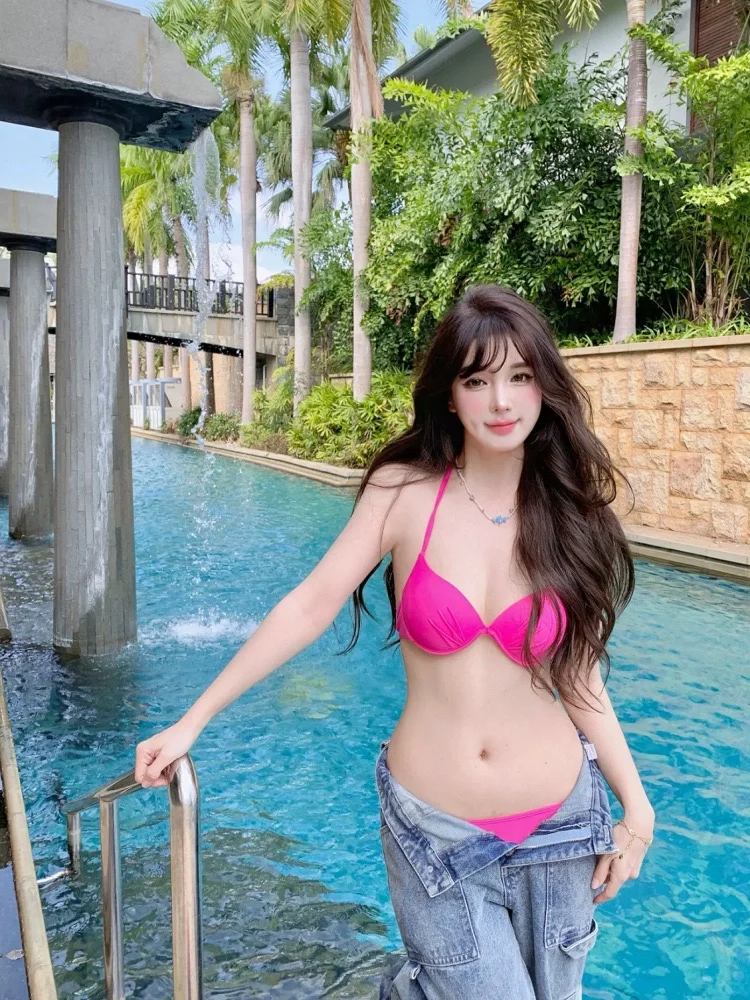 2024最新沙滩度假PINK粉玫红钢托聚拢大小胸性感辣妹比基尼👙