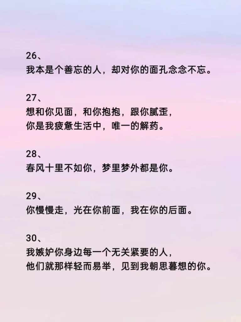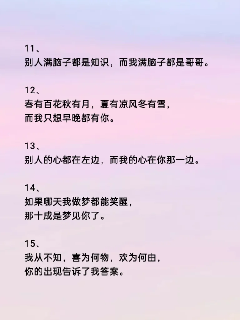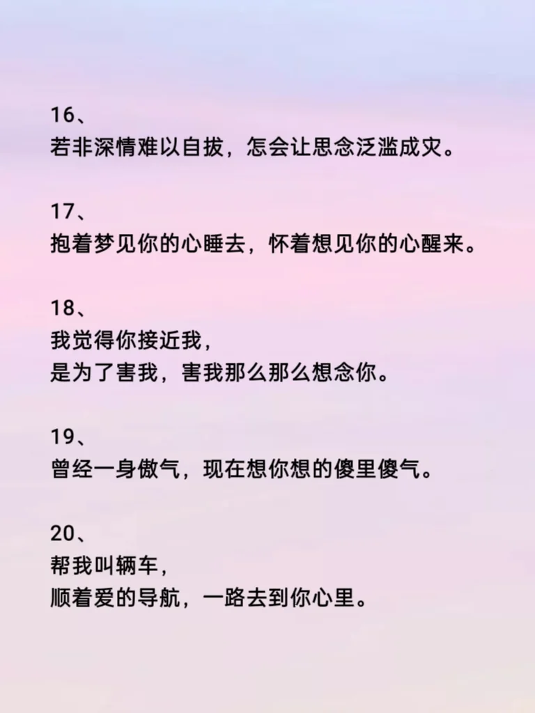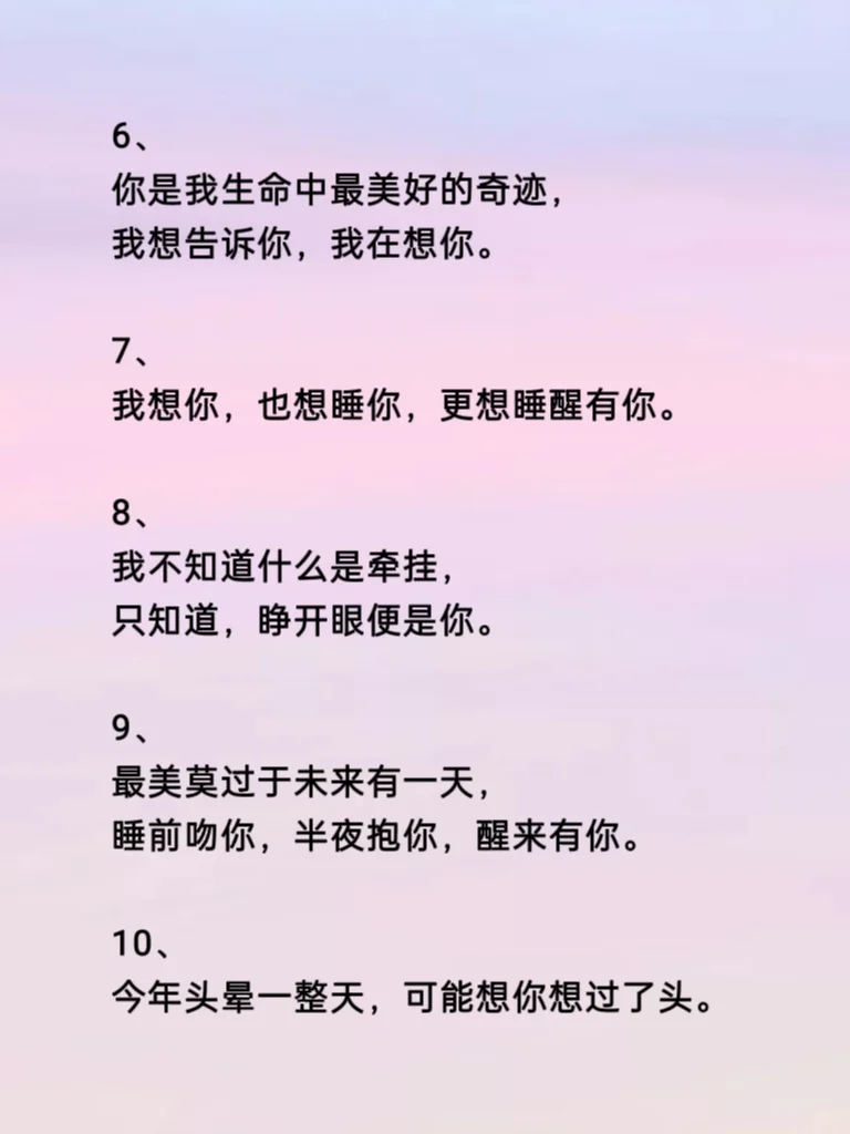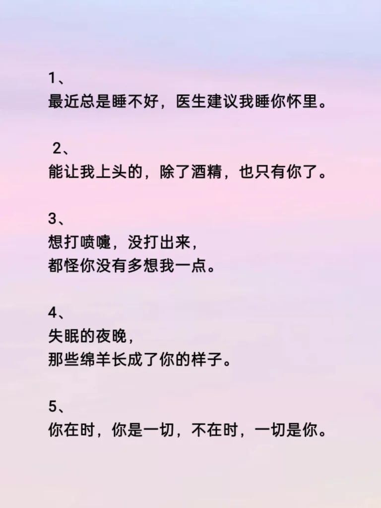 1、\n最近总是睡不好,\n医生建议我睡你怀里。\n \n2、\n能让我上头的,\n除了酒精,也只有你了。\n \n3、\n想打喷嚏,没打出来,\n都怪你没有多想我一点。\n \n4、\n失眠的夜晚,\n那些绵羊长成了你的样子。\n \n5、\n你在时,你是一切,\n不在时,一切是你。\n \n6、\n你是我生命中最美好的奇迹,\n我想告诉你,我在想你。\n \n7、\n我想你,\n也想睡你,更想睡醒有你。\n \n8、\n我不知道什么是牵挂,\n只知道,睁开眼便是你。\n \n9、\n最美莫过于未来有一天,\n睡前吻你,半夜抱你,醒来有你。\n \n10、\n今年头晕一整天,\n可能想你想过了头。\n \n11、\n别人满脑子都是知识,\n而我满脑子都是哥哥。\n \n12、\n春有百花秋有月,夏有凉风冬有雪,\n而我只想早晚都有你。\n \n13、\n别人的心都在左边,\n而我的心在你那一边。\n \n14、\n如果哪天我做梦都能笑醒,\n那十成是梦见你了。\n \n15、\n我从不知,\n喜为何物,欢为何由,\n你的出现告诉了我答案。\n \n16、\n若非深情难以自拔,\n怎会让思念泛滥成灾。\n \n17、\n抱着梦见你的心睡去,\n怀着想见你的心醒来。\n \n18、\n我觉得你接近我,\n是为了害我,害我那么那么想念你。\n \n19、\n曾经一身傲气,\n现在想你想的傻里傻气。\n \n20、\n帮我叫辆车,\n顺着爱的导航,一路去到你心里。\n#女性觉醒 #女性智慧 #情感共鸣 #浪漫情话 #爱情语录 #情话 #浪漫文案 #撩人情话 #走心文案 #每日情话