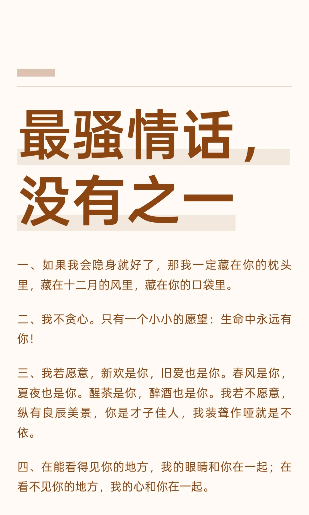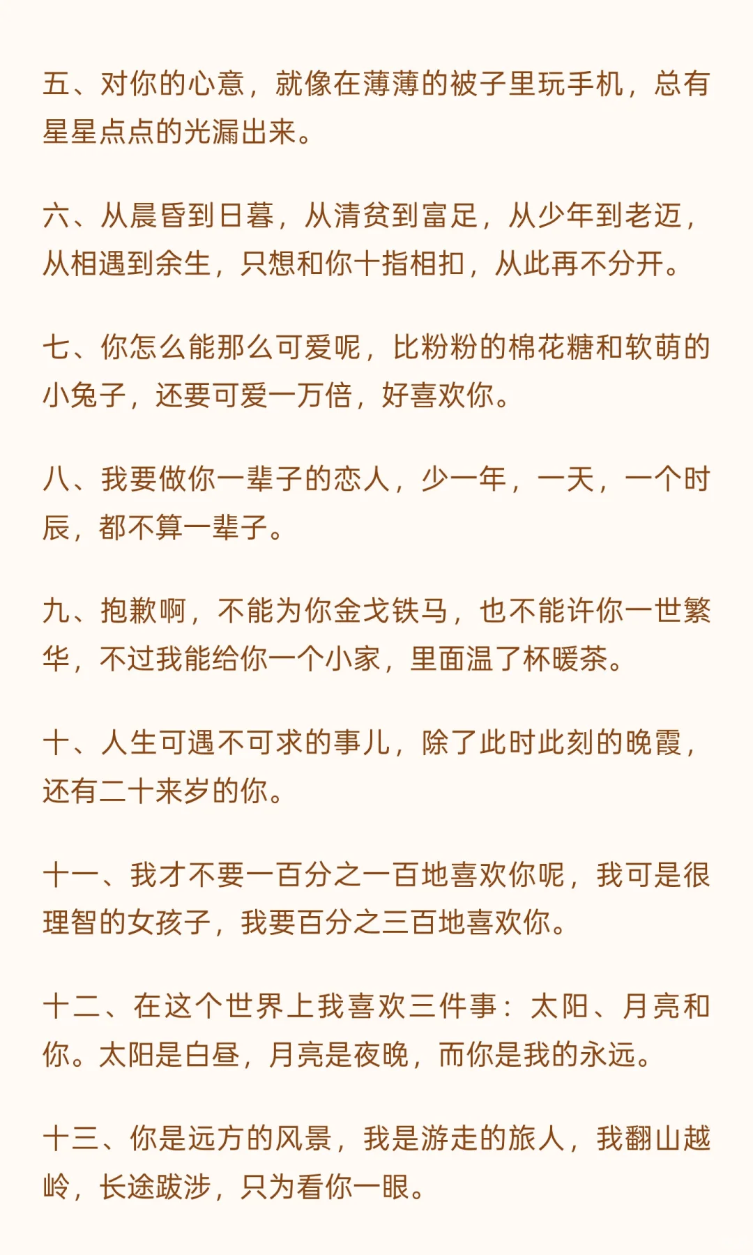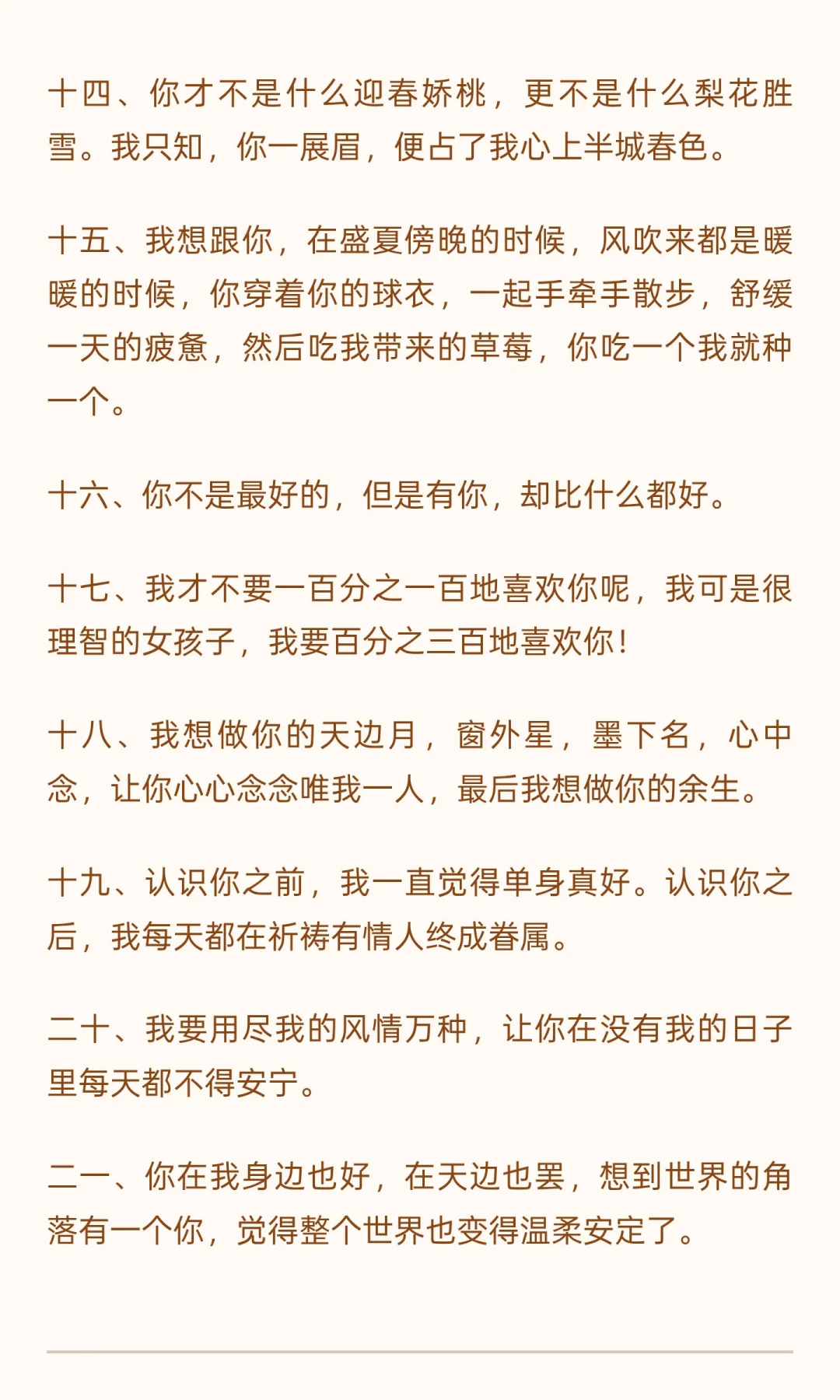 一、如果我会隐身就好了,那我一定藏在你的枕头里,藏在十二月的风里,藏在你的口袋里。\n二、我不贪心。只有一个小小的愿望:生命中永远有你!\n三、我若愿意,新欢是你,旧爱也是你。春风是你,夏夜也是你。醒茶是你,醉酒也是你。我若不愿意,纵有良辰美景,你是才子佳人,我装聋作哑就是不依。\n四、在能看得见你的地方,我的眼睛和你在一起;在看不见你的地方,我的心和你在一起。\n五、对你的心意,就像在薄薄的被子里玩手机,总有星星点点的光漏出来。\n六、从晨昏到日暮,从清贫到富足,从少年到老迈,从相遇到余生,只想和你十指相扣,从此再不分开。\n七、你怎么能那么可爱呢,比粉粉的棉花糖和软萌的小兔子,还要可爱一万倍,好喜欢你。\n八、我要做你一辈子的恋人,少一年,一天,一个时辰,都不算一辈子。\n九、抱歉啊,不能为你金戈铁马,也不能许你一世繁华,不过我能给你一个小家,里面温了杯暖茶。\n十、人生可遇不可求的事儿,除了此时此刻的晚霞,还有二十来岁的你。\n十一、我才不要一百分之一百地喜欢你呢,我可是很理智的女孩子,我要百分之三百地喜欢你。\n十二、在这个世界上我喜欢三件事:太阳、月亮和你。太阳是白昼,月亮是夜晚,而你是我的永远。\n十三、你是远方的风景,我是游走的旅人,我翻山越岭,长途跋涉,只为看你一眼。\n十四、你才不是什么迎春娇桃,更不是什么梨花胜雪。我只知,你一展眉,便占了我心上半城春色。\n十五、我想跟你,在盛夏傍晚的时候,风吹来都是暖暖的时候,你穿着你的球衣,一起手牵手散步,舒缓一天的疲惫,然后吃我带来的草莓,你吃一个我就种一个。\n十六、你不是最好的,但是有你,却比什么都好。\n十七、我才不要一百分之一百地喜欢你呢,我可是很理智的女孩子,我要百分之三百地喜欢你!\n十八、我想做你的天边月,窗外星,墨下名,心中念,让你心心念念唯我一人,最后我想做你的余生。\n十九、认识你之前,我一直觉得单身真好。认识你之后,我每天都在祈祷有情人终成眷属。\n二十、我要用尽我的风情万种,让你在没有我的日子里每天都不得安宁。\n二一、你在我身边也好,在天边也罢,想到世界的角落有一个你,觉得整个世界也变得温柔安定了。