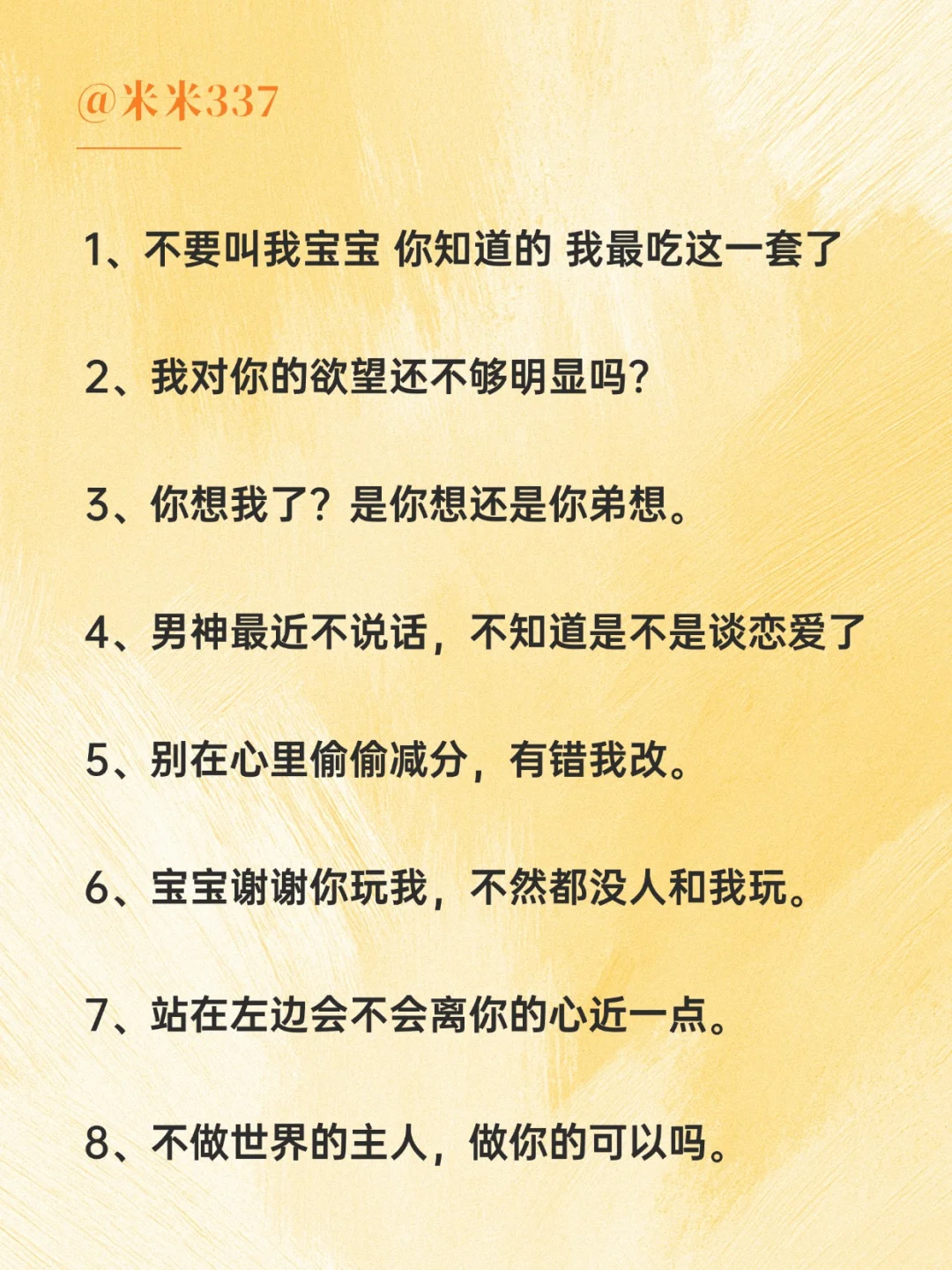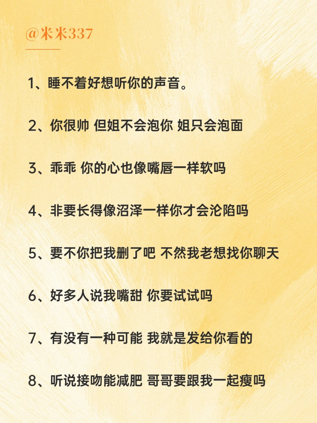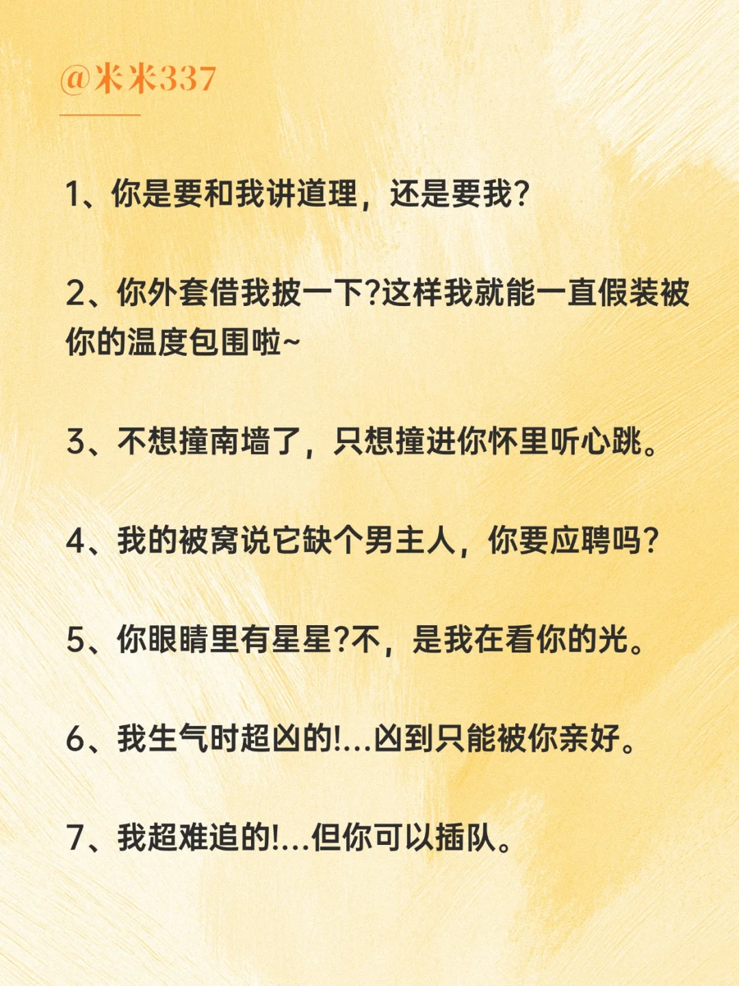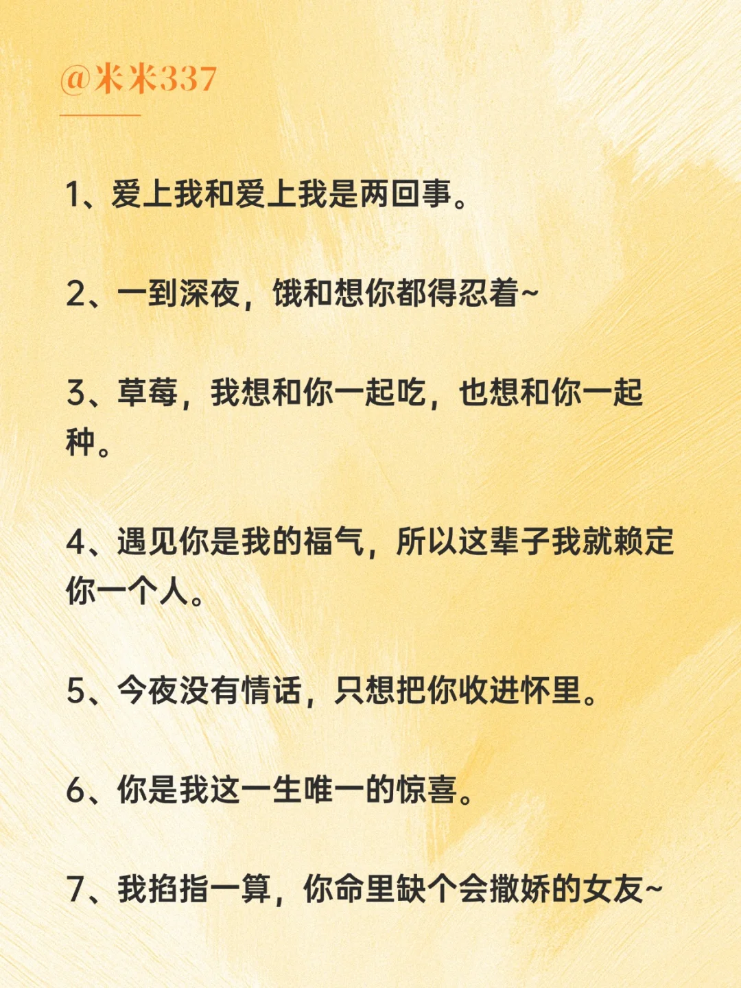 1、爱上我和爱上我是两回事。\n2、一到深夜,饿和想你都得忍着~\n3、草莓,我想和你一起吃,也想和你一起种。\n4、别人再好也是别人的,但我不一样,我哥哥是属于你的。\n5、以前不懂事,随便就喜欢上你了,现在成熟了,经过深思熟虑,依然喜欢你,晚安!\n6、你是我这一生唯一的惊喜。\n7、今夜没有情话,只想把你收进怀里。\n8、听说可爱会传染,所以你要靠我近点哦。\n9、遇见你是我的福气,所以这辈子我就赖定你一个人。\n10、想问你现在几点了,没别的意思,只是想提醒你,夜深了,是时候喜欢我了。\n#恋爱技巧 #恋爱指南 #暧昧 #让男人瞬间上头 #狐媚子 #女生必看 #情感语录 #撩人情话 #撩汉