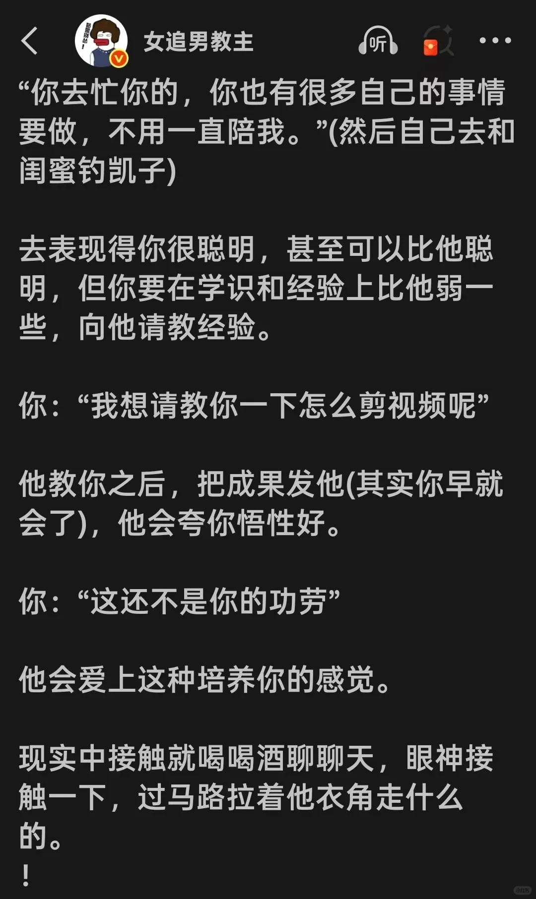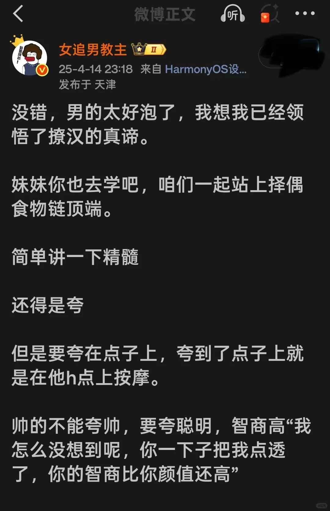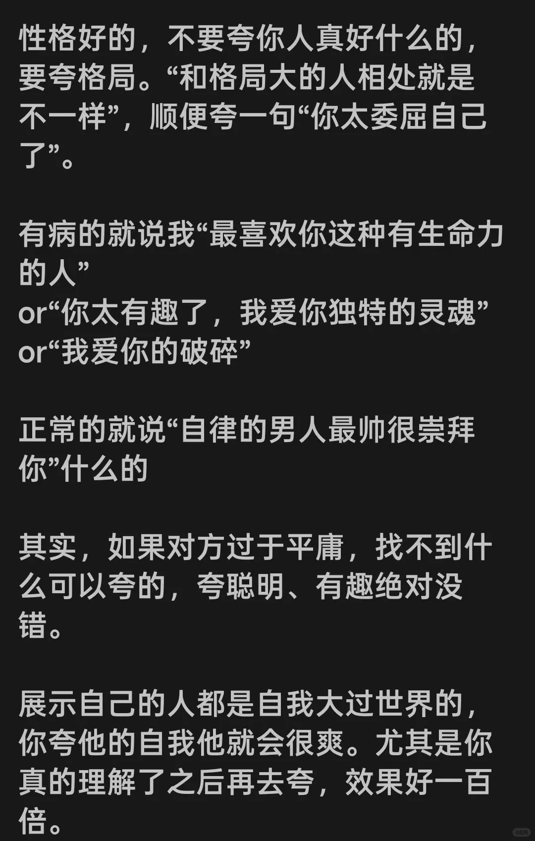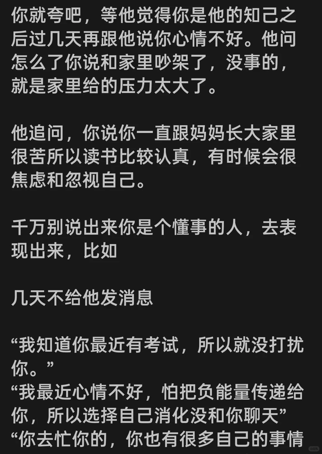 没错,男的太好泡了,我想我已经领悟了撩汉的真谛。\n妹妹你也去学吧,咱们一起站上择偶食物链顶端。\n简单讲一下精髓\n还得是夸\n但是要夸在点子上,夸到了点子上就是在他h点上按摩。\n帅的不能夸帅,要夸聪明,智商高“我怎么没想到呢,你一下子把我点透了,你的智商比你颜值还高”\n性格好的,不要夸你人真好什么的,要夸格局。“和格局大的人相处就是不一样”,顺便夸一句“你太委屈自己了”。\n有病的就说我“最喜欢你这种有生命力的人”\nor“你太有趣了,我爱你独特的灵魂”\nor“我爱你的破碎”\n正常的就说“自律的男人最帅很崇拜你”什么的\n其实,如果对方过于平庸,找不到什么可以夸的,夸聪明、有趣绝对没错。\n展示自己的人都是自我大过世界的,你夸他的自我他就会很爽。尤其是你真的理解了之后再去夸,效果好一百倍。\n你就夸吧,等他觉得你是他的知己之后过几天再跟他说你心情不好。他问怎么了你说和家里吵架了,没事的,就是家里给的压力太大了。\n他追问,你说你一直跟妈妈长大家里很苦所以读书比较认真,有时候会很焦虑和忽视自己。\n千万别说出来你是个懂事的人,去表现出来,比如\n几天不给他发消息\n“我知道你最近有考试,所以就没打扰你。”\n“我最近心情不好,怕把负能量传递给你,所以选择自己消化没和你聊天”\n“你去忙你的,你也有很多自己的事情要做,不用一直陪我。”(然后自己去和闺蜜钓凯子)\n去表现得你很聪明,甚至可以比他聪明,但你要在学识和经验上比他弱一些,向他请教经验。\n你:“我想请教你一下怎么剪视频呢”\n他教你之后,把成果发他(其实你早就会了),他会夸你悟性好。\n你:“这还不是你的功劳”\n他会爱上这种培养你的感觉。\n现实中接触就喝喝酒聊聊天,眼神接触一下,过马路拉着他衣角走什么的。\n!