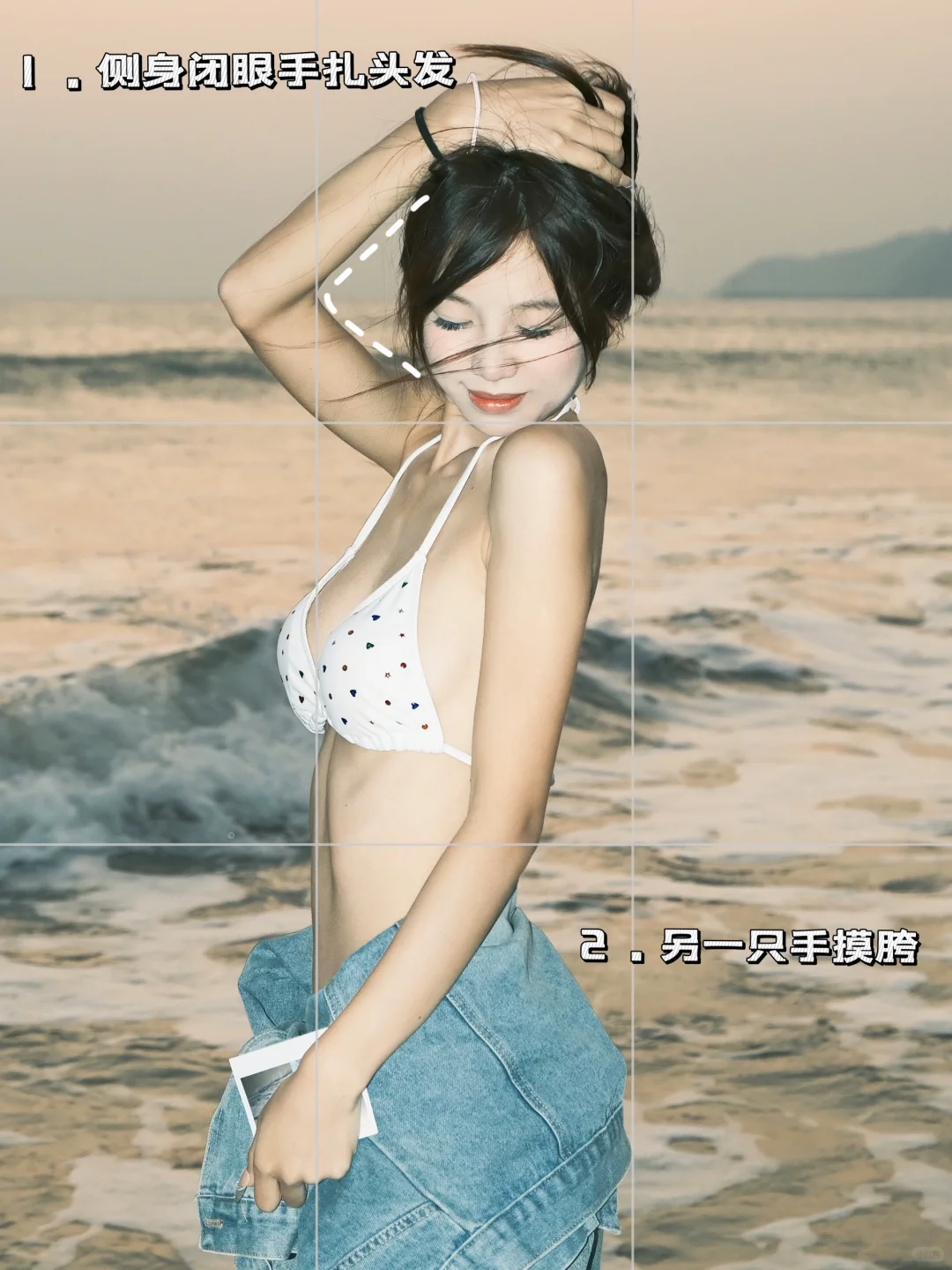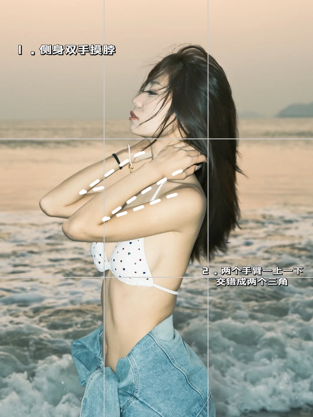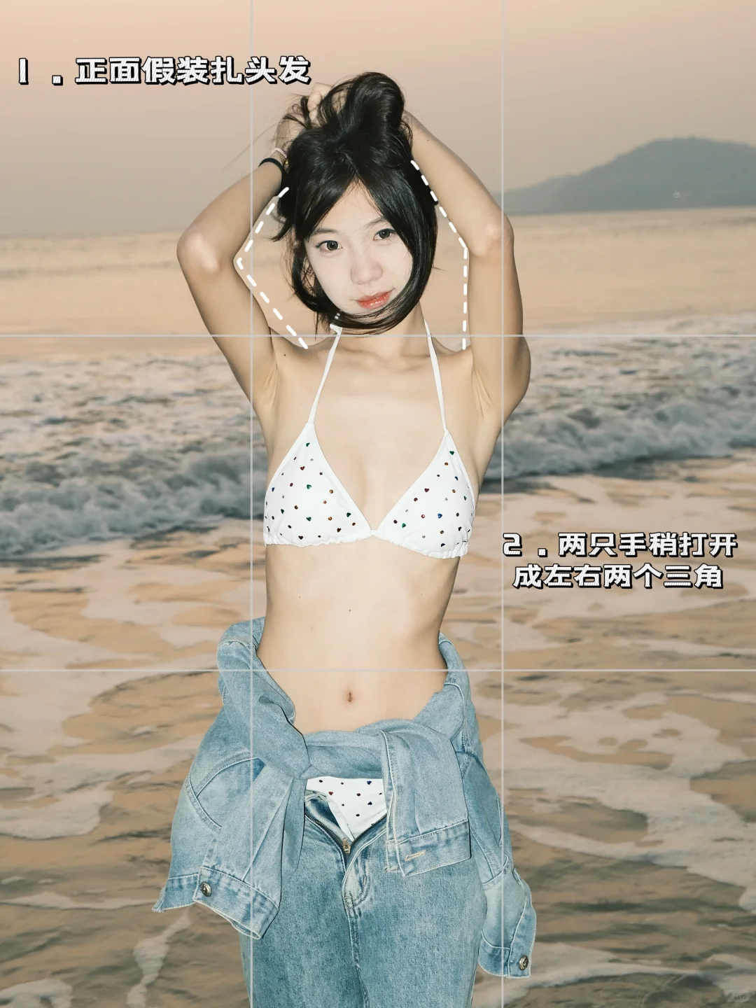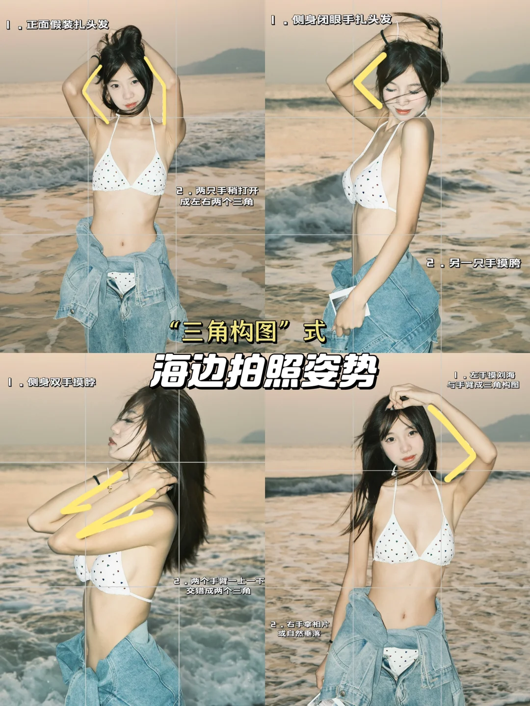 今天给老婆们分享海边度假怎么拍出这样又明媚又自由生命力感的氛围感美照!!记住这几个万能三角构图,包出片的!赶紧码住艾特你的好👭来学!!!\n(审核你好,海边正常穿搭; 创作不易,请勿误判哦)\n \n