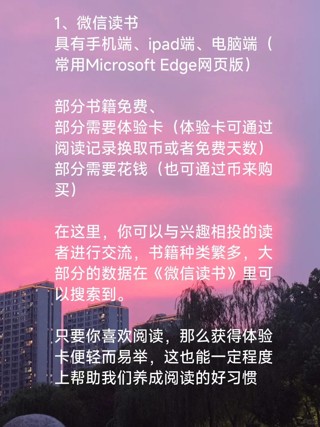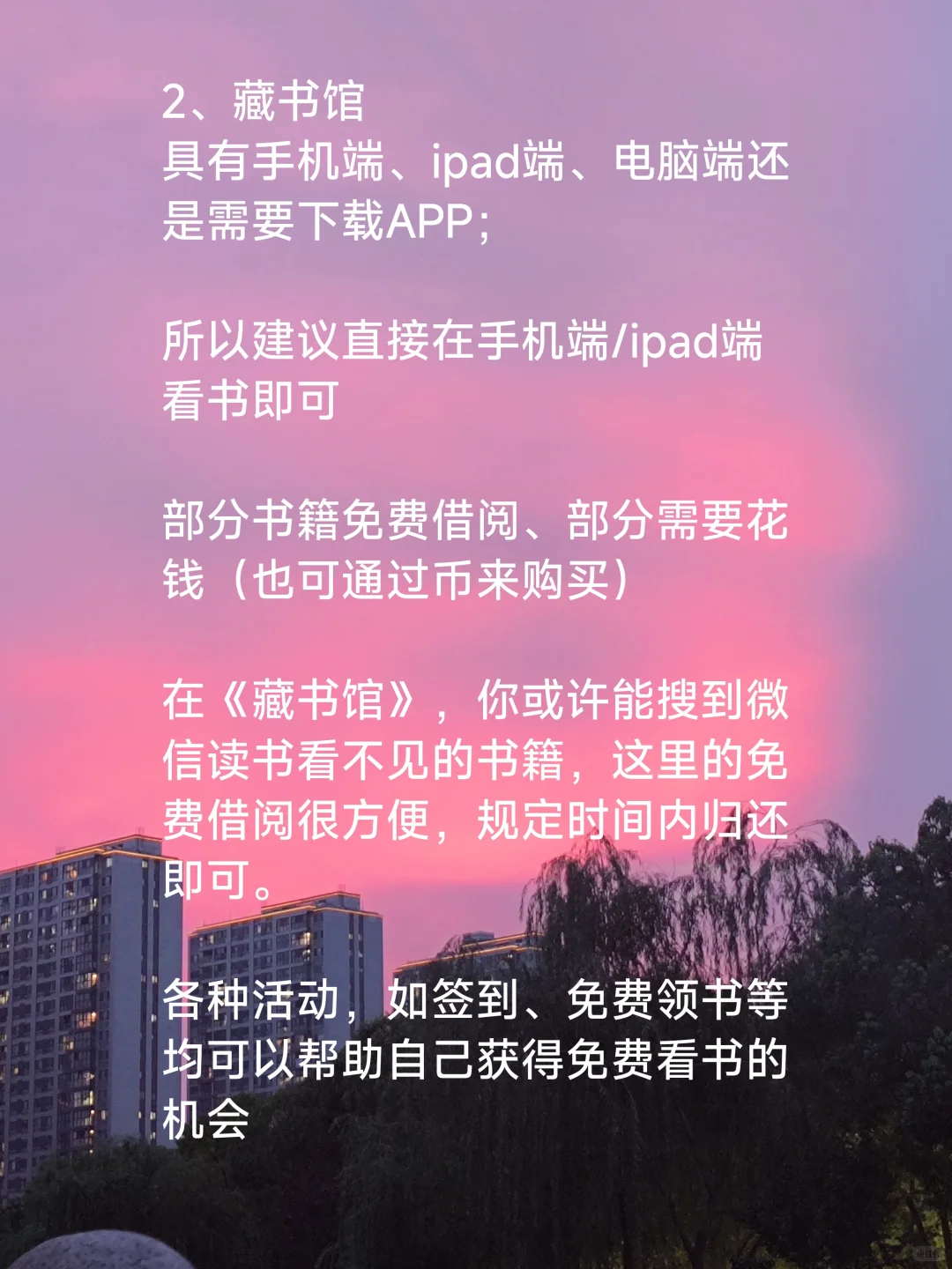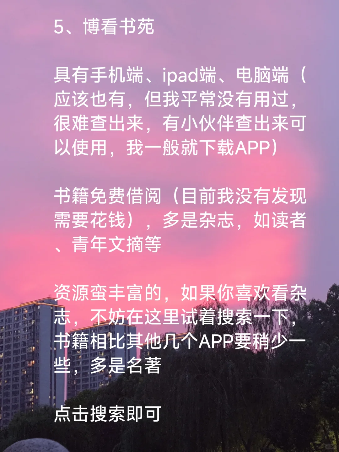 “多读书。阅读是有力量的,他会让人的心真正沉静下来。只有心灵沉静了,才会感受到真正的喜悦。”\n——《无端欢喜》余秀华\n \n阅读是一件看似简单却难以坚持的事情,“没有时间”、“没有精力”等理由似乎是阅读的阻碍。但只要你喜欢阅读,那么就能从你喜欢的书中获取到知识、能量。\n \n平常我喜欢看文学类的书籍,治愈系的漫画也是我喜欢的,但以下推荐的APP各种类型都有,无论是史学、文学、杂志等都有覆盖到。\n \n很开心今天能和大家分享我日常认为很好用的追书APP,手机端和ipad端均可实现看电子书自由!部分网页版也可以支持看书自由。\n \n一起成为读者吧!今天推荐5个APP,总有一款能满足你的看书需求,建议按照先后顺序进行搜索,更容易找到自己想要的书籍。\n \n省流版:微信读书、藏书馆、首都图书馆、国家数字图书馆、博看书苑\n \n其实除了以上5个APP,能实现看书自由的APP还有很多,如各高校图书馆、学习通等。\n \n但APP不在多,够用就行。以上是我认为覆盖面较为全面的APP。\n \n几乎所有你想看的都有,如果没有的话,就需要自行购买啦!\n \n因为看书,能让我的内心很充实,书中有些文字是真的恰好击中内心,不管是快乐的还是悲伤的,总归是有点触动。\n \n时间过得很快,看书也不能使其变慢。所以希望我们每个人都能在有限的时间里多读书,珍惜每天的时光。\n \n无论是文字还是漫画,只要是你读完看完后,内心欢喜的,或者得到了一些成长的道理、亦或者启发了你如何面对生活的困境和得意,那都是非常有意义的。\n \n如果你犹豫看不看书,那不必着急。如果你仅仅把看书看做一项任务,那么你很难获得快乐,不过没事哒,没事哒,习惯都是养成的,任何时候开始都没有问题。\n \n就像《5%的改变》中所述:所以慢慢来,软弱和犹豫没有任何问题,下决心就是需要很多时间。\n#电子书自由#快乐瞬间 #每日读书分享 #实现看书自由 #宝藏软件 #小众APP #读书推荐 #电子阅读器 #推荐看书软件 #阅读