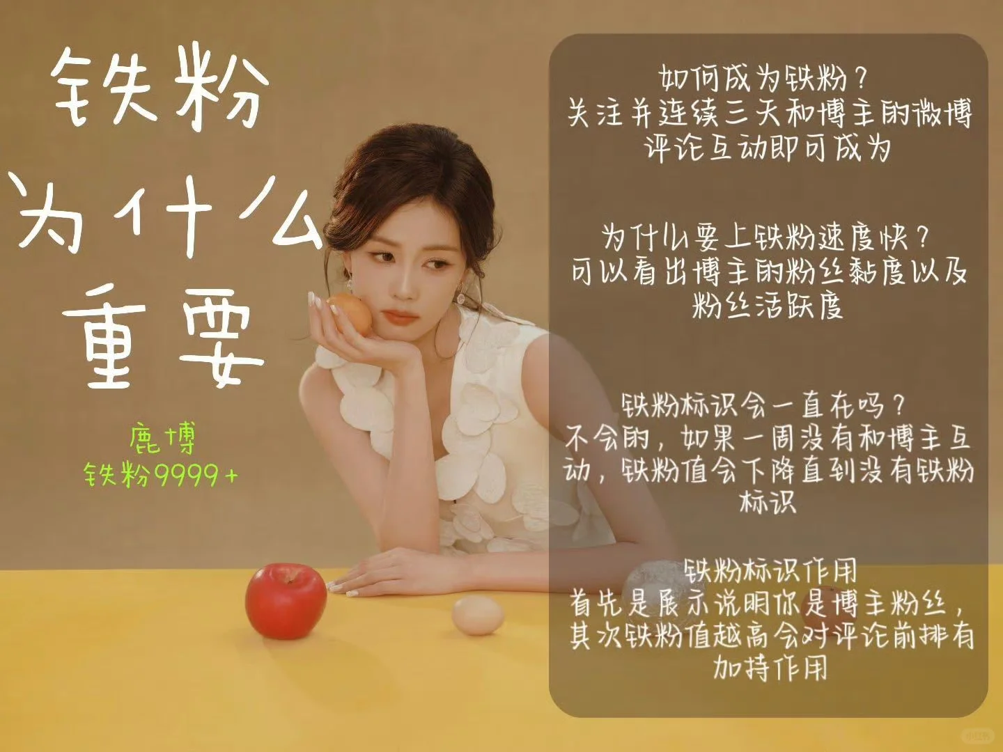 #白鹿 #微博 #软件推荐\n铁fo一定要重视👊🏻每一次自担微博都不能懈怠!\n⭐️如何成为铁fo并查看铁fo标识\n——关主并连续三天与自担微博评论和互动或者即可点亮铁fo标识;铁fo标识会出现在你评论中的昵称旁边\n👾为什么上铁fo速度要快\n——可以看出该博主的粉丝活跃度和粉丝黏度\n🤖铁粉等级标识的作用\n——铁fo等级越高说明互动越多,铁粉等级越高对评论前排有加持作用,所以不管是鹿博,剧博我们也要养铁!\n⚠️:一定要评论自担微博才能有效计入铁fo,一些重大官宣需要上铁fo速度超快!所以要从日常做起!鹿博一出zzp都要做!并且速速切耗!\n图来自:白鹿书局研究社\n \n下期预告:如何成为超like