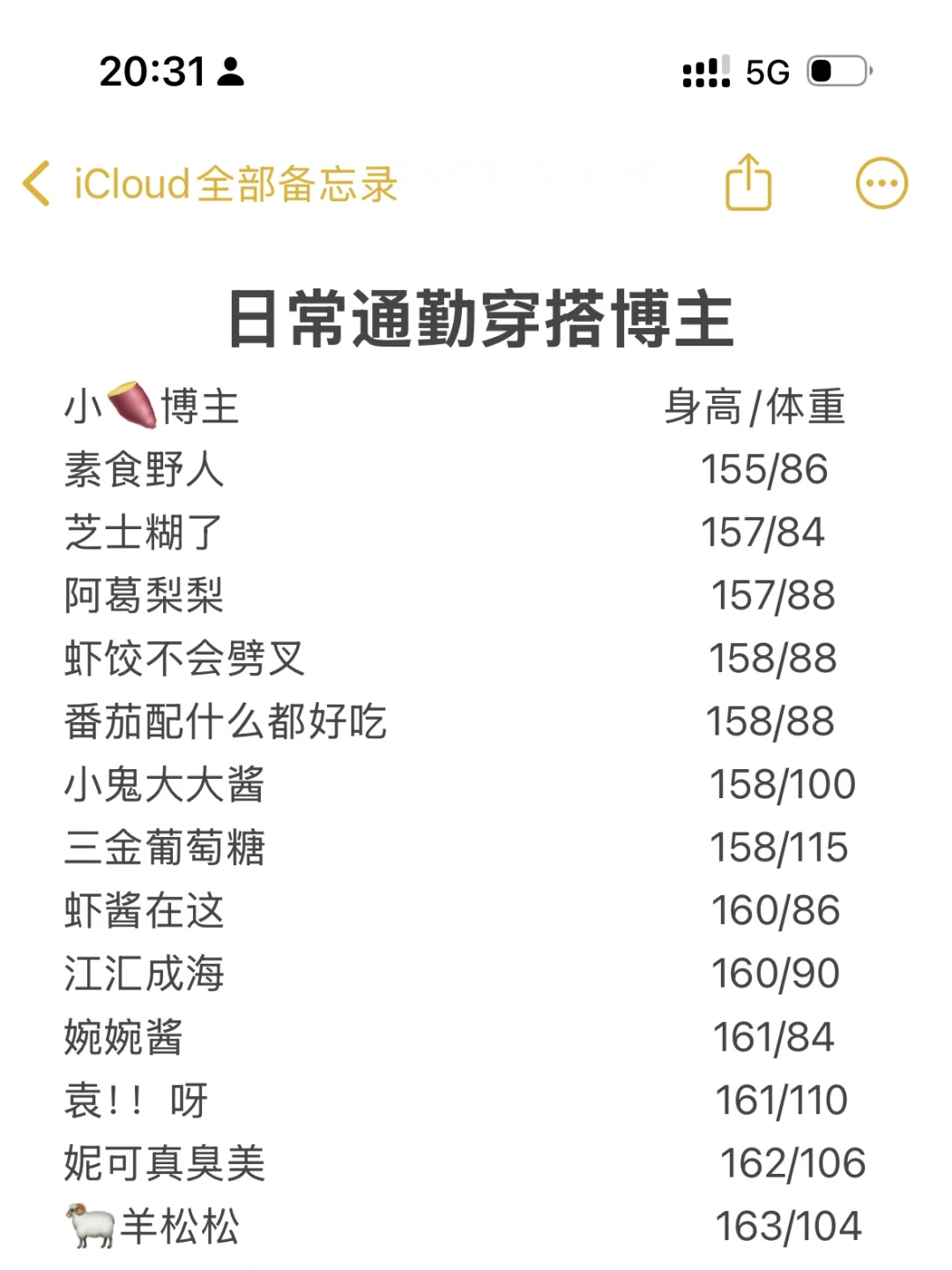 我就不信,拆解完这么多博主,竟然没有适合你的博主?!寻找适合自己的最重要!!\n1️⃣素食野人 155/86\n2️⃣芝士糊了 157/84\n3️⃣阿葛梨梨 157/88\n4️⃣虾饺不会劈叉 158/88\n5️⃣番茄配什么都好吃 158/88\n6️⃣小鬼大大酱 158/100\n7️⃣三金葡萄糖 158/115\n8️⃣虾酱在这 160/86\n9️⃣江汇成海 160/90\n1️⃣0️⃣婉婉酱 161/84\n1️⃣1️⃣袁!!呀 161/110\n1️⃣2️⃣妮可真臭美 162/106\n1️⃣3️⃣🐏羊松松 163/104\n1️⃣4️⃣丧并努力着的阿悦 164/107\n1️⃣5️⃣Riddlenana 165/100\n1️⃣6️⃣你的年年 165/102\n1️⃣7️⃣秀逗汪星人 166/102\n1️⃣8️⃣一张大不富 168/104\n1️⃣9️⃣能豆子 168/110\n2️⃣0️⃣乳糖不耐 168/未知\n2️⃣1️⃣奶酪奶酪 170/98\n2️⃣2️⃣温柔的U 170/110\n2️⃣3️⃣肥肥公主酱 170/137\n2️⃣4️⃣neeee 171/100\n2️⃣5️⃣蟹老板 172/155\n#穿搭 #适合普通人的穿搭方式 #穿搭博主 #个人穿搭风格 #博主穿搭 #穿搭干货 #跟着博主学穿搭 #博主