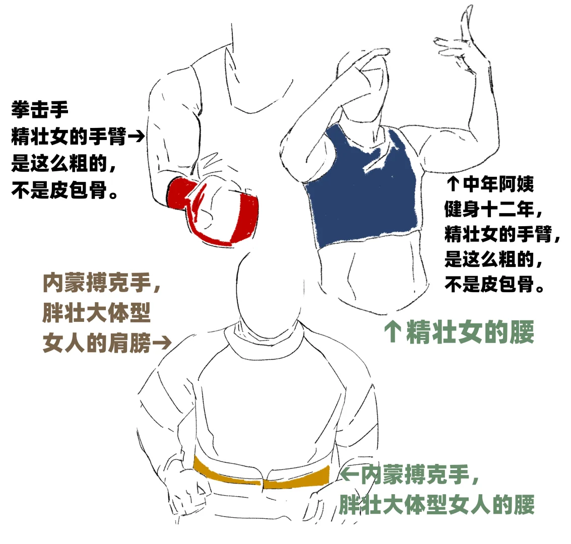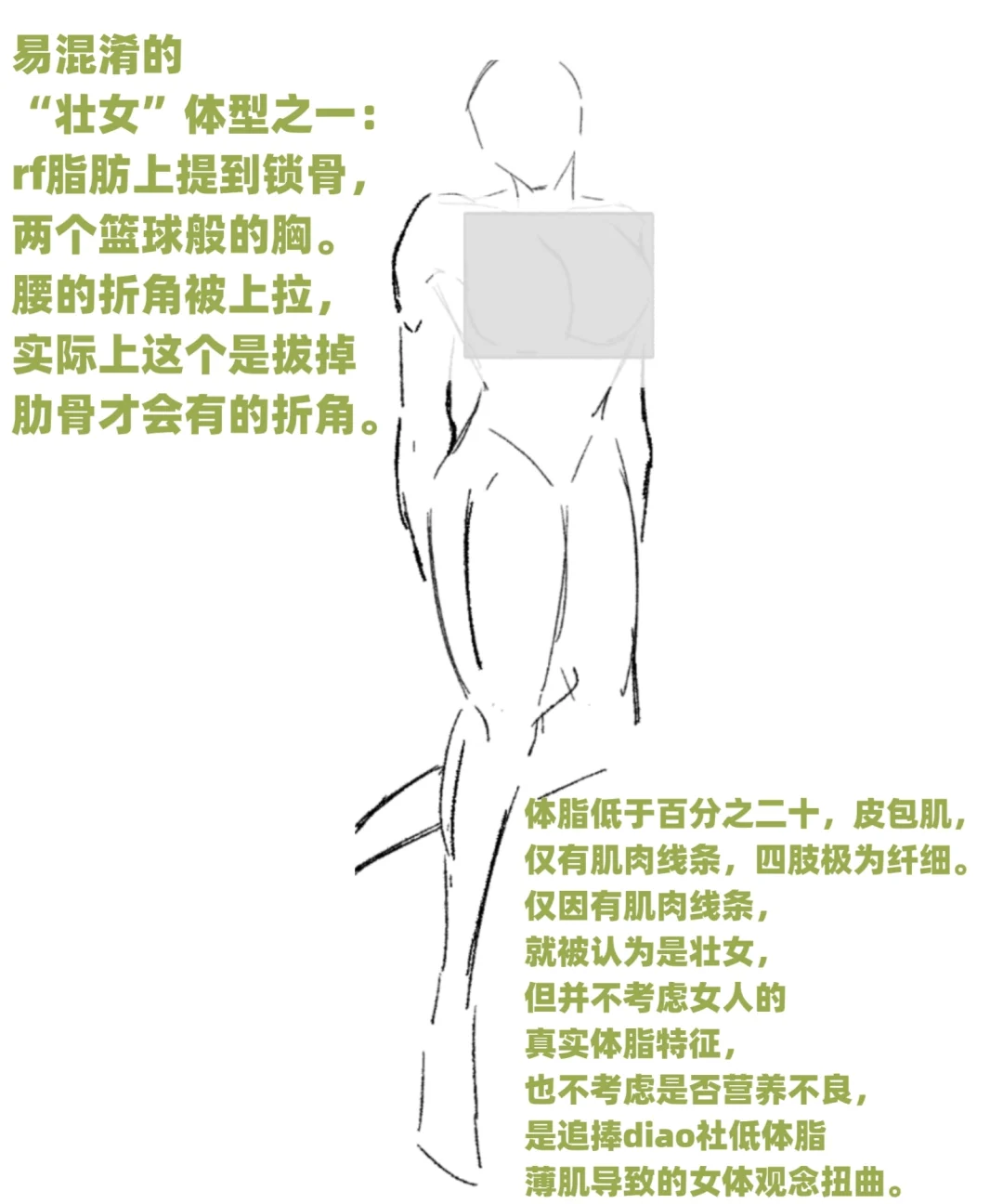 图一到图五是近期画的照片。\n图六到图九是近期我看见的有人拿出来混淆认知的图。\n \n对女人来说,肌肉线条(训练痕迹)不是最重要的,也不是有了肌肉线条就=壮。还要看体脂表现、块头大小,最重要的是肌肉功能是否强悍+是否能发挥出正常的身体功能。体脂极低的,是♂的特征,女人体脂高,不要学♂人。较高的体脂,能够支撑我们的肌肉力量。\n \n总有人说女人不像♂人xx素高,练不出来。其实锻炼肌肉最重要的是饮食、睡眠与抗阻训练。至于体内,我们靠的是女人自己的相关激素(看我主页论文)。不要信莫名其妙的天生如何论调。\n \n二编:总有人跟我说现实里也有图九那样的,她们就很健康,你为什么要这么武断。然而她们反驳我的时候会说——我也没说这种是健康的,但是我想说这里面有健康的体型,你应该再精准点。其实翻译一下就是——虽然我知道这不健康,但是既然有健康的特例那我就可以提倡鼓励这种体型,你也应该包容我们然后为我们效力。\n \n我只想说这种特例应该从另一个角度去谈及,因而我又二编了一下:\n \n像图九和一些很轻易就能把体脂维持在16的人,如果她们是故意的,前者在这种体型上维持健康,是需要苛刻、专业、不松弛的饮食和锻炼习惯的,请问是所有女人都喜欢每天过运动员一样的生活吗?吃要精准计算,多一点赘肉都需要赶紧降低,紧张又节制。而且长期维持低脂极限,本就不适合大众女人的身体天性,有损健康或生活质量,对于大众来说这并不健康并不舒适,因而并不配被正向谈论。后者,多半是某种特殊的身体特质不能代表全部,女人不应该效仿或因此焦虑,某些人也不应该让自己代表大众,引导她人觉得低脂就是很轻易,每个人都如此。\n \n另外一些人,可能会因为一些肠胃或消化问题,有了被大众称为“易瘦体质”的身体。这不应该被看成是值得羡慕的,而是至少应该关注这是否能够治愈或加强对这类人群营养摄入方式的关注,从而去开发更多能够治愈的方法又或适合她们的生活方式。这种现象,本就不应该提倡所有女人都可以这样、应该这样,而是应该关注她们的健康,且她们应该能够正常自然生活,而不是被迫陷入某种低脂崇拜里增重身体负担,或者被当成低脂崇拜的神。\n \n#绘画 #画画 #绘画学习 #绘画教程 #绘画参考