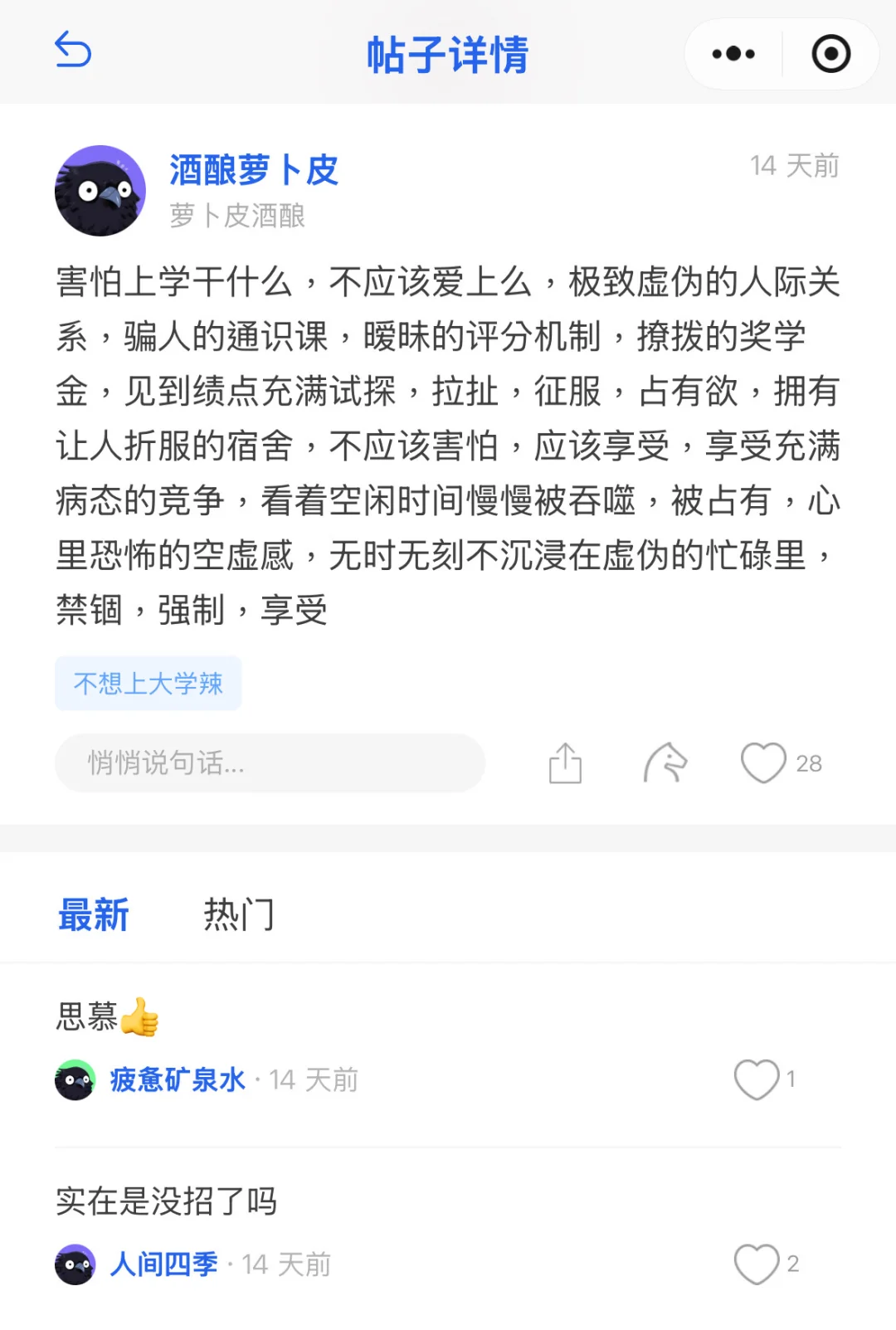 日有所思,夜有所梦。我最近一直有点纠结赤石进度是否没跟上大部队的问题,晚上还真的就梦见zjs,只不过是一个荒唐的梦:我和cls在我学校参加腰鼓表演,都穿一身活像印度纱丽的红绿配色演出服,腰上挂了个鼓。我感觉实在丢脸丢到家了,正在化妆间和cls抱怨,结果迎面就看到zjs走进来。我几乎是条件反射地缩到了墙角,尴尬地贴在墙上说了一句“嗨,zjs”。\n \n梦到这里就醒了,因为屋外的装修队实在太吵。好像相关法律规定工作日8:00-12:00和14:00-18:00时段装修都不算扰民,可是这是暑假的八点钟,怠惰的我还在睡啊……写法条的人,求求你想一想这个睡不醒的蠢蛋好吗(bushi\n \n成绩全出完了,我的绩点这下成了一坨烂牛粪。平均学分绩本来就不能看,现在被军理Python形策中教改活活又拉下去两分(当然,教统也没放过我)。我这下真的一口石也赤不下去,在屋里充满焦虑地踱步。真不敢相信将来确定保研名单的时候会把所有人的成绩实名公布,那我岂不是连遮羞布都被撕碎了吗?何不让想保研的人单独公示,其他像我一样不走这条路的就各看各的呢?这么多年被刻在骨头上的优绩主义关键词又被触发了。\n \n看《孤独摇滚》,有点喜欢凉先辈。\n \n赤石,赤石。从高中毕业一直用到现在的蓝笔没水了,我只好在家里翻箱倒柜找一支还能用的。哈哈,写了几下我就知道当年为什么没用完这支就扔家里了——实在太难写了,根本不出水,像便秘一样给我吐了点墨就完全枯竭,这笔居然还是百乐产的。\n \n我觉得我最近有点睡眠不足。赤石计划总是磨磨蹭蹭的,往往把大部分工作都拖到了半夜,早上又总是早醒,睡眠时间就这样被大幅压缩。今天亦是如此。如果zjs知道了,一定会不赞同地摇头,然后给我大讲道理。虽然我是永远不会让她知道我的某些真实状况的,不过从明天开始的确要提高点效率,不能总是熬到一点。