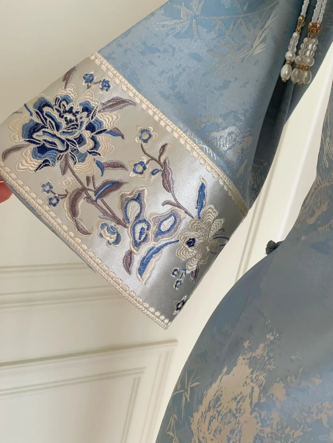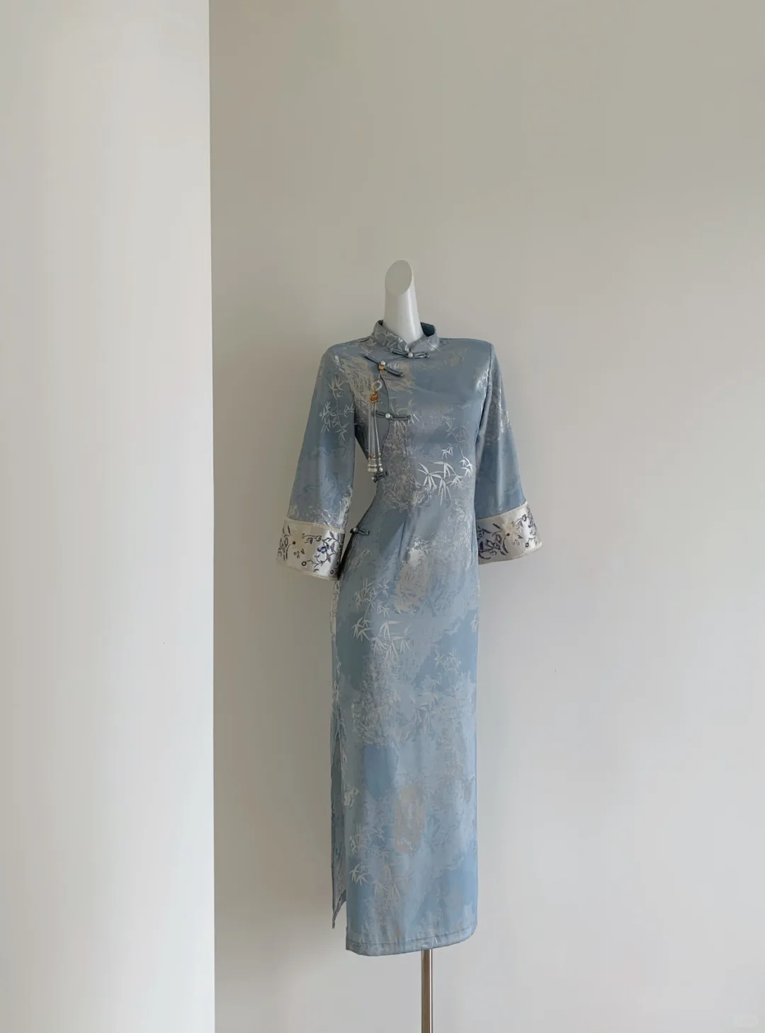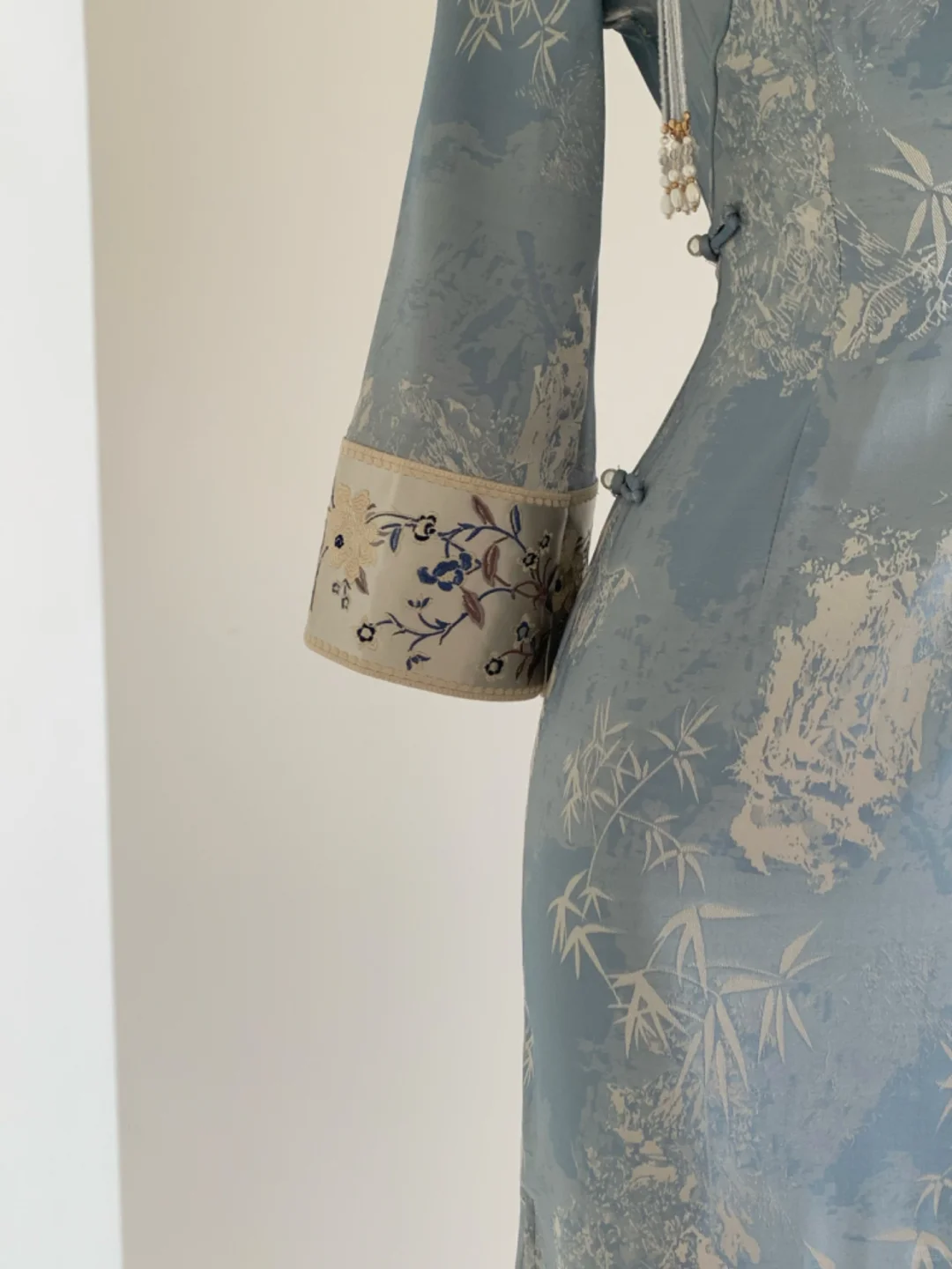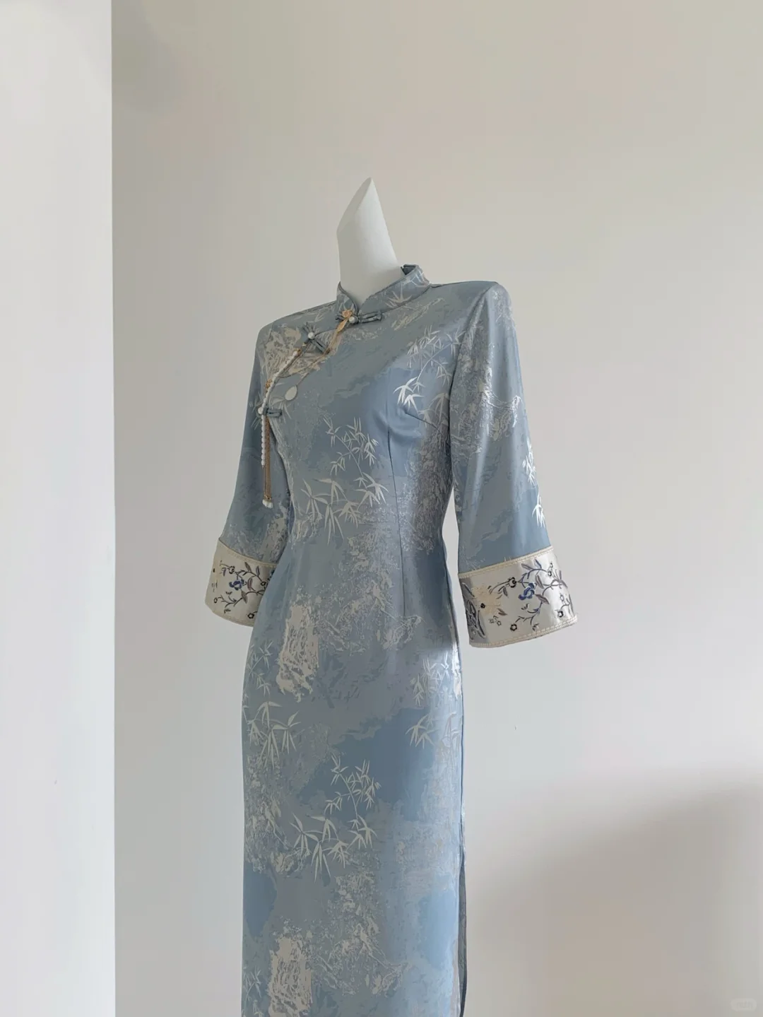 🩵蓝色+清竹搭配绝了!!\n很显白的蓝色,🩶银色竹叶印花点缀整件旗袍\n真的一眼就是小说里的清冷美人🥹\n整件是温柔又有光泽感的双面烫金提花缎🌿\n袖子全刺绣花设计,精致又显贵气✨\n单层面料不会闷汗,肤感很赞,很合适现在季节🍃\n再冷点❄️还能搭配披肩穿搭~\n去稍正式的场合/度假旅游/通勤上班都能穿✅\n趁国庆节前小补一批,每天会陆续出货,早拍收到哦~\n \n#改良旗袍 #清冷感旗袍#旗袍复古#旅行穿搭#梨形旗袍#蓝色旗袍#显白旗袍#早秋旗袍#旗袍显瘦#国风旗袍