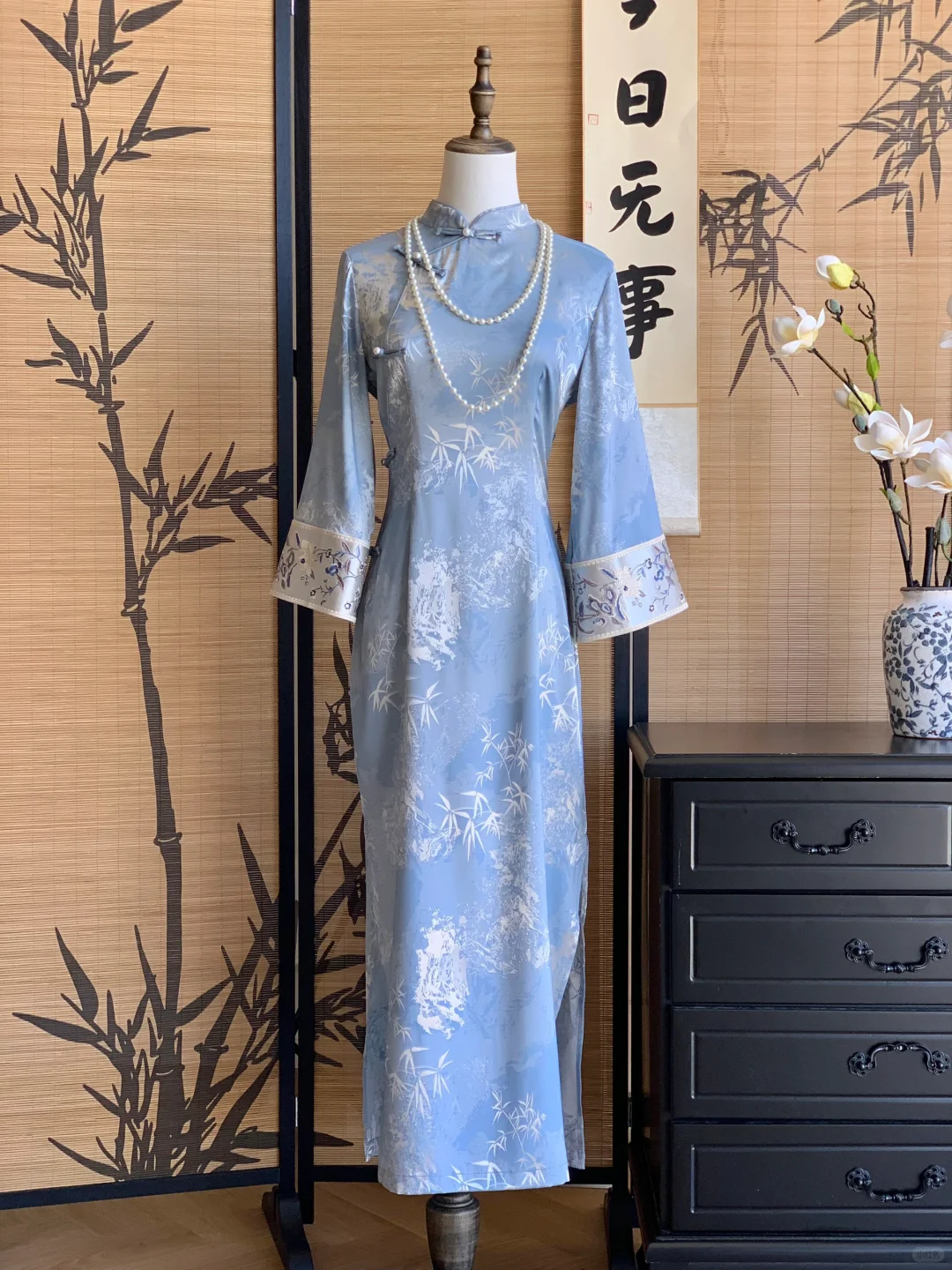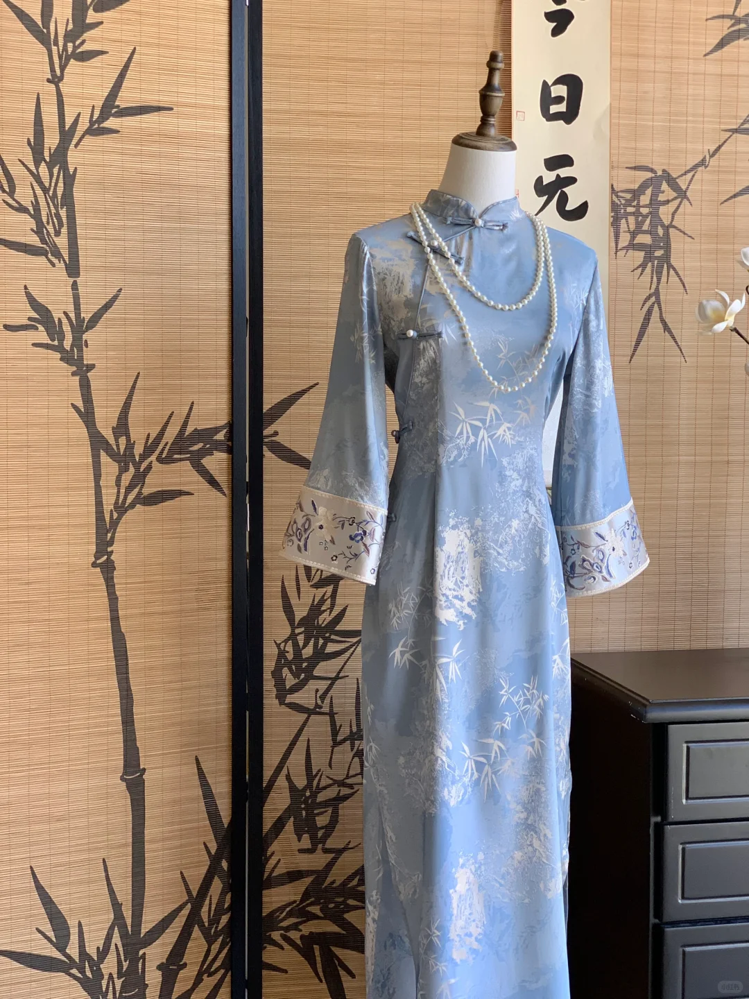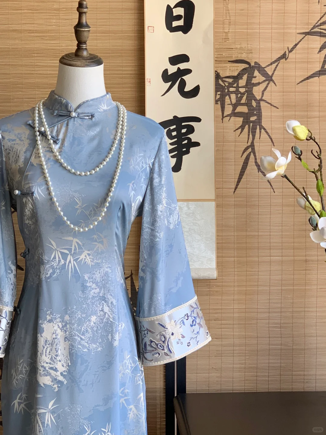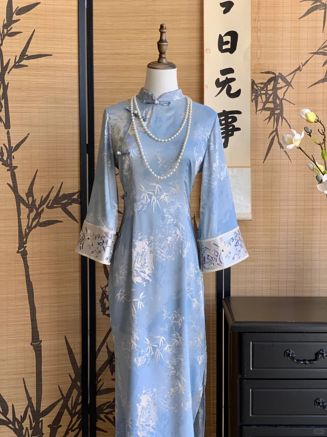 上身非常清冷大小姐的一款秋季长袖旗袍\n蓝色系真的清冷有气质,整个人书香感还很浓郁\n日常穿搭随便背个单肩包穿个小白鞋就很休闲\n拍照打卡的姐妹搭个披肩拿个小扇子又非常古典优雅感\n这个也是去年超超超热销的原创自制款,不撞衫又小众\n大家看看有没有没有买到的,再给大家补一批呢?\n