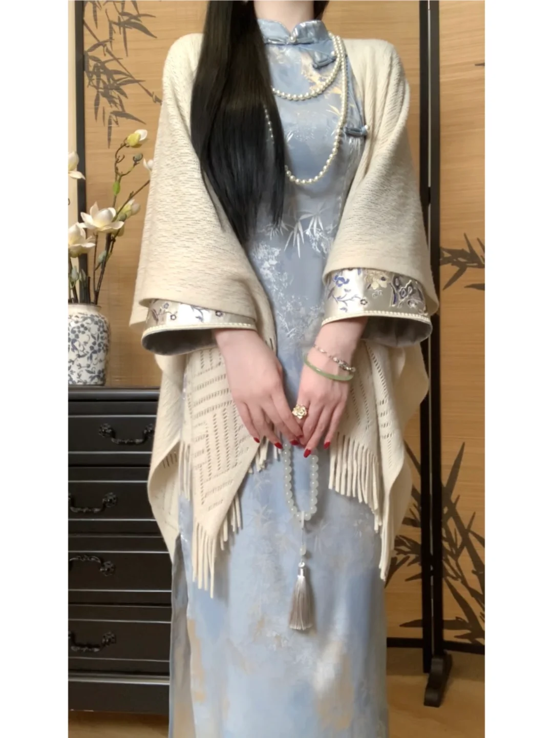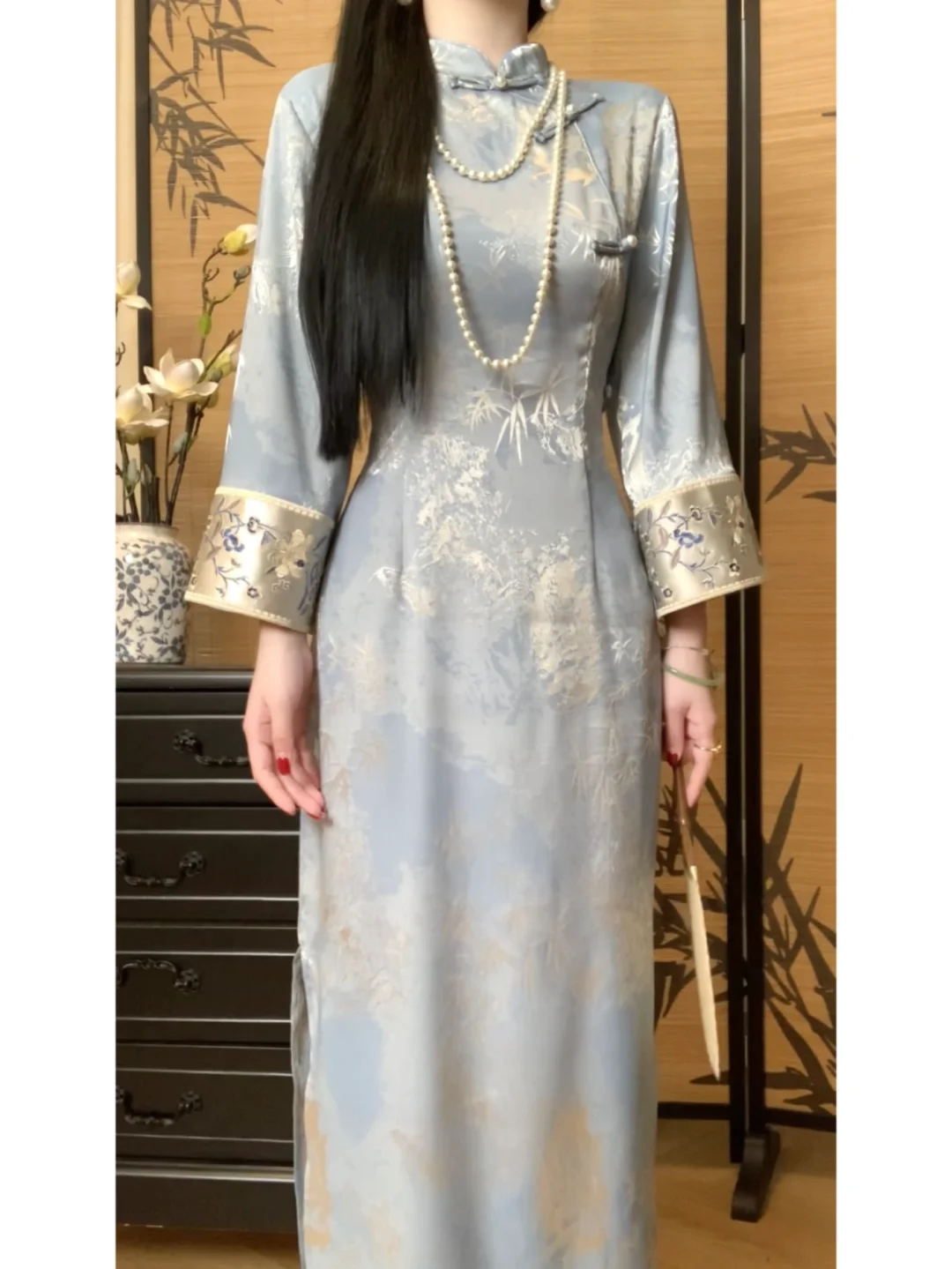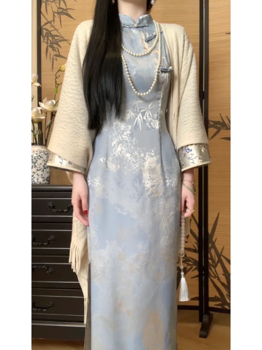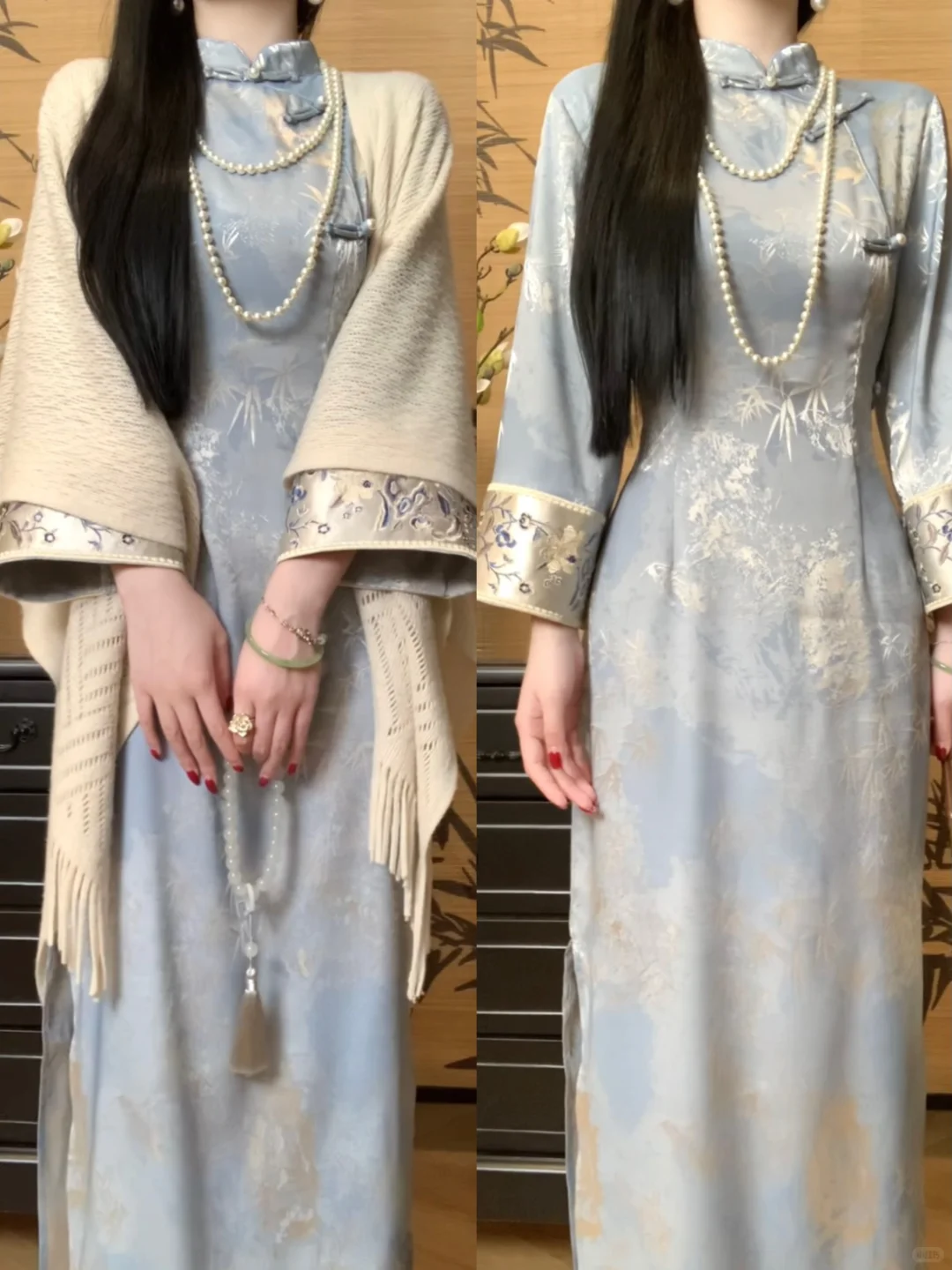 上身非常清冷大小姐的一款秋季长袖旗袍\n蓝色系真的清冷有气质,整个人书香感还很浓郁\n日常穿搭随便背个单肩包穿个小白鞋就很休闲\n拍照打卡的姐妹搭个披肩拿个小扇子又非常古典优雅感\n这个也是去年超超超热销的原创自制款,不撞衫又小众\n大家看看有没有没有买到的,再给大家补一批呢?\n