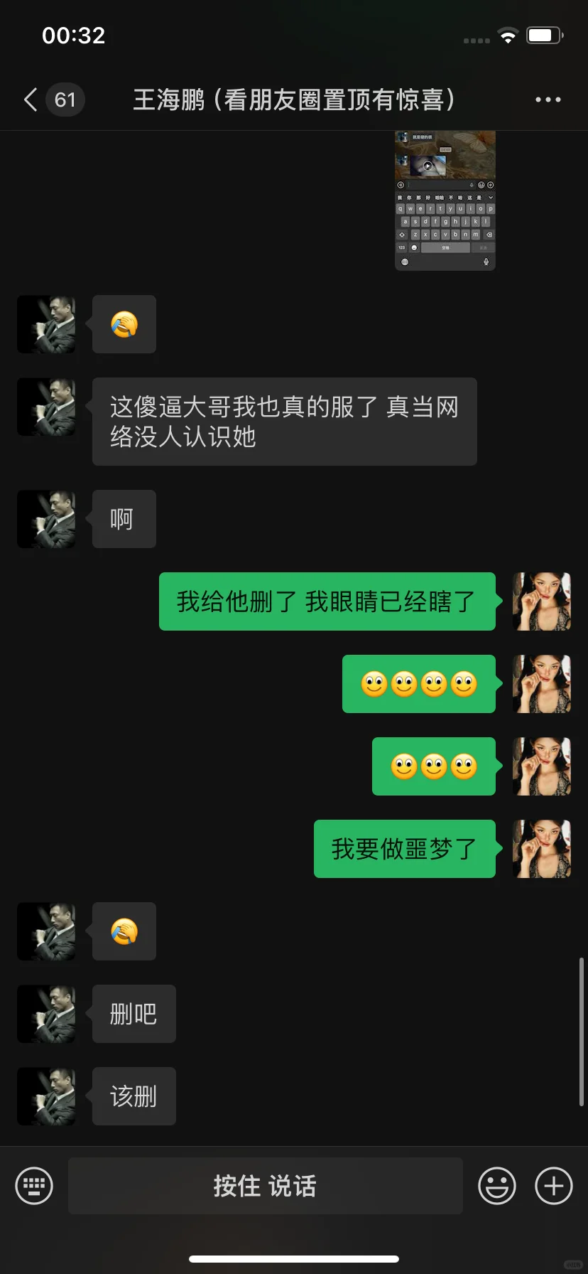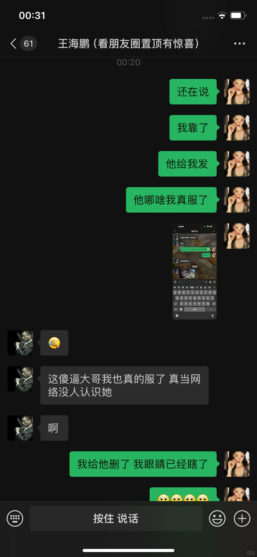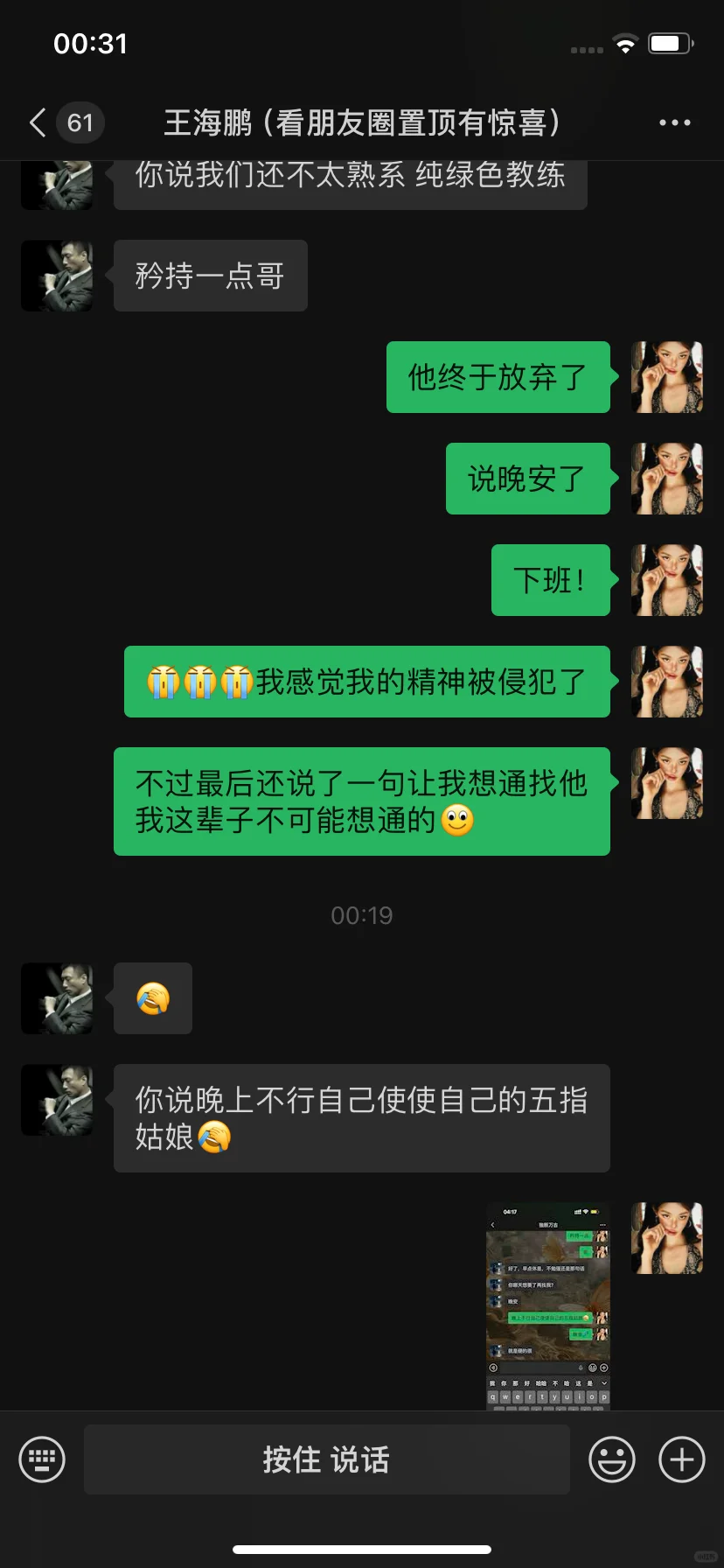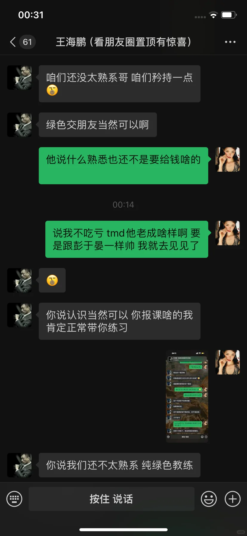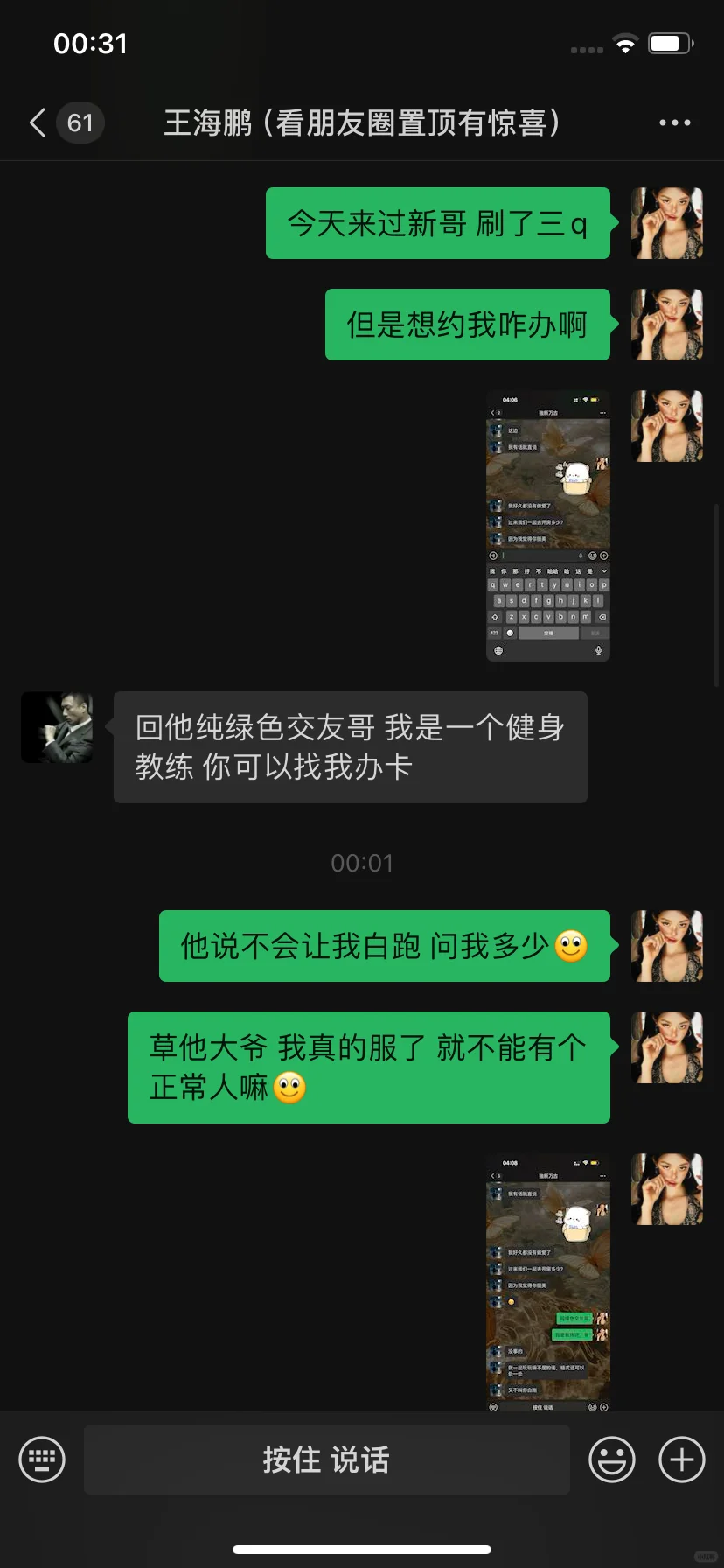 大家盲猜一张图片是啥吧 我的眼睛已经瞎了 这个大哥刷了三千 然后我主页包装的是一个健身教练 他当时在直播间聊的还好好的 我还以为我遇见聊爱情了 没想到
