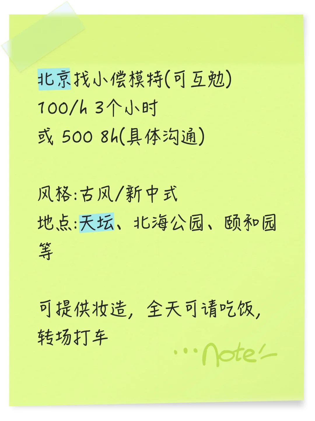 绝对颜控,唯一目标就是出片\n希望身材适合穿旗袍或者新中式\n \n别喷,价格低我知道,我甚至希望hu勉呢\n \n听我狡辩下:\n正常价格的优秀模特老师我有储备\n但这次想拍的地方多,且全天的话会转场,本来就是为爱发电,所以不想太有心理压力\n且为了更好的效果,部分场景我会提供妆造\n \n如果模特或者素人老师,有拍摄建议或者想法就更好了\n不指望这个价格能找到,最终也还是会拍,无非代价多少\n \n如有意向可发我作品/模卡、报价,不要只发你好之类的打招呼的词,直接一句或者一段话说清楚报价、你的要求或者想法就好\n感兴趣的我会回\n \nPs:合作愉快的话我会约第二天,第二天可以尝试御姐、情绪之类的,合适主题可以棚拍,也可拍外场夜景,我有好几个灯,够用\n \n#北京约拍 #北京互勉约拍 #北京互勉模特 #人像约拍 #互勉约拍 #小偿模特 #北京小偿模特 #大数据懂我 #大数据推送