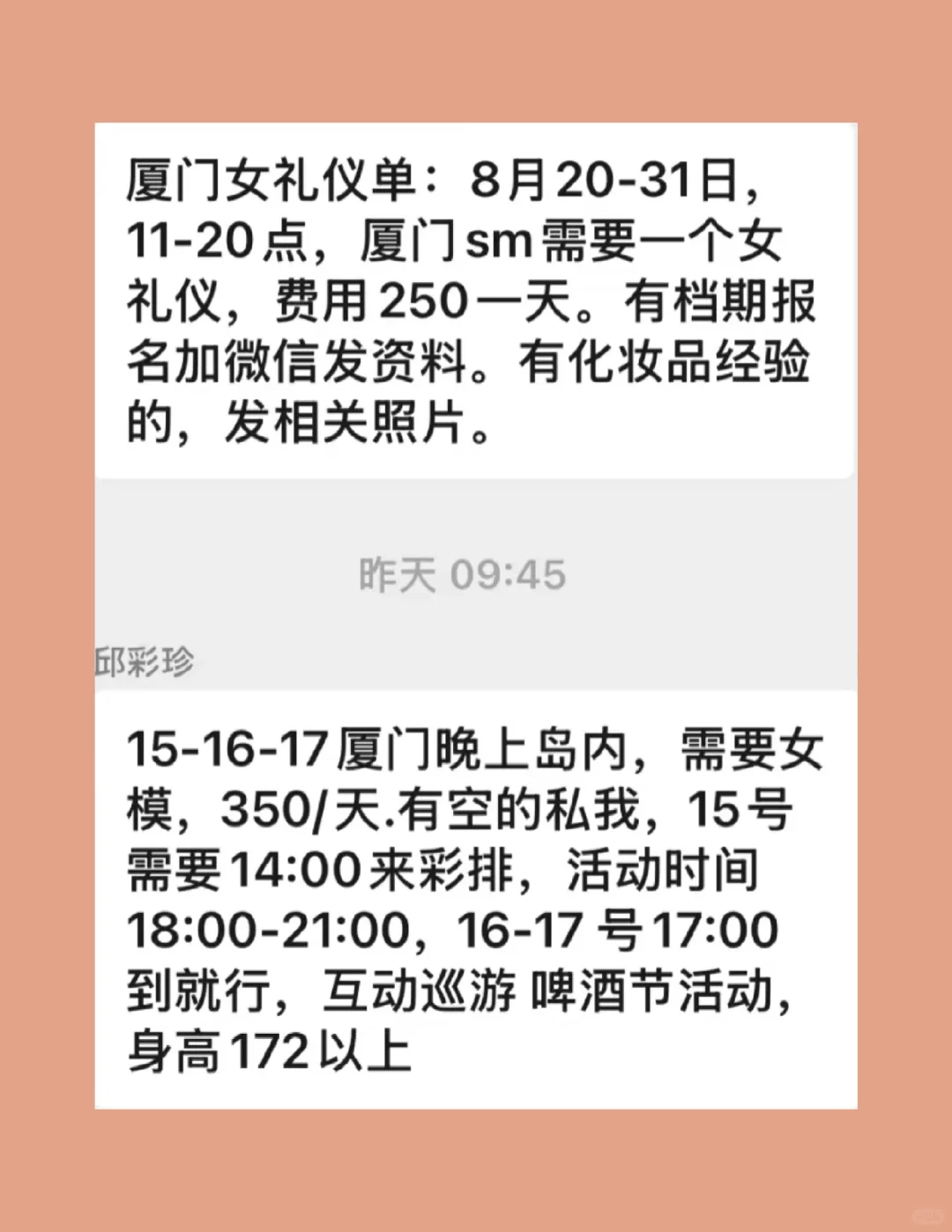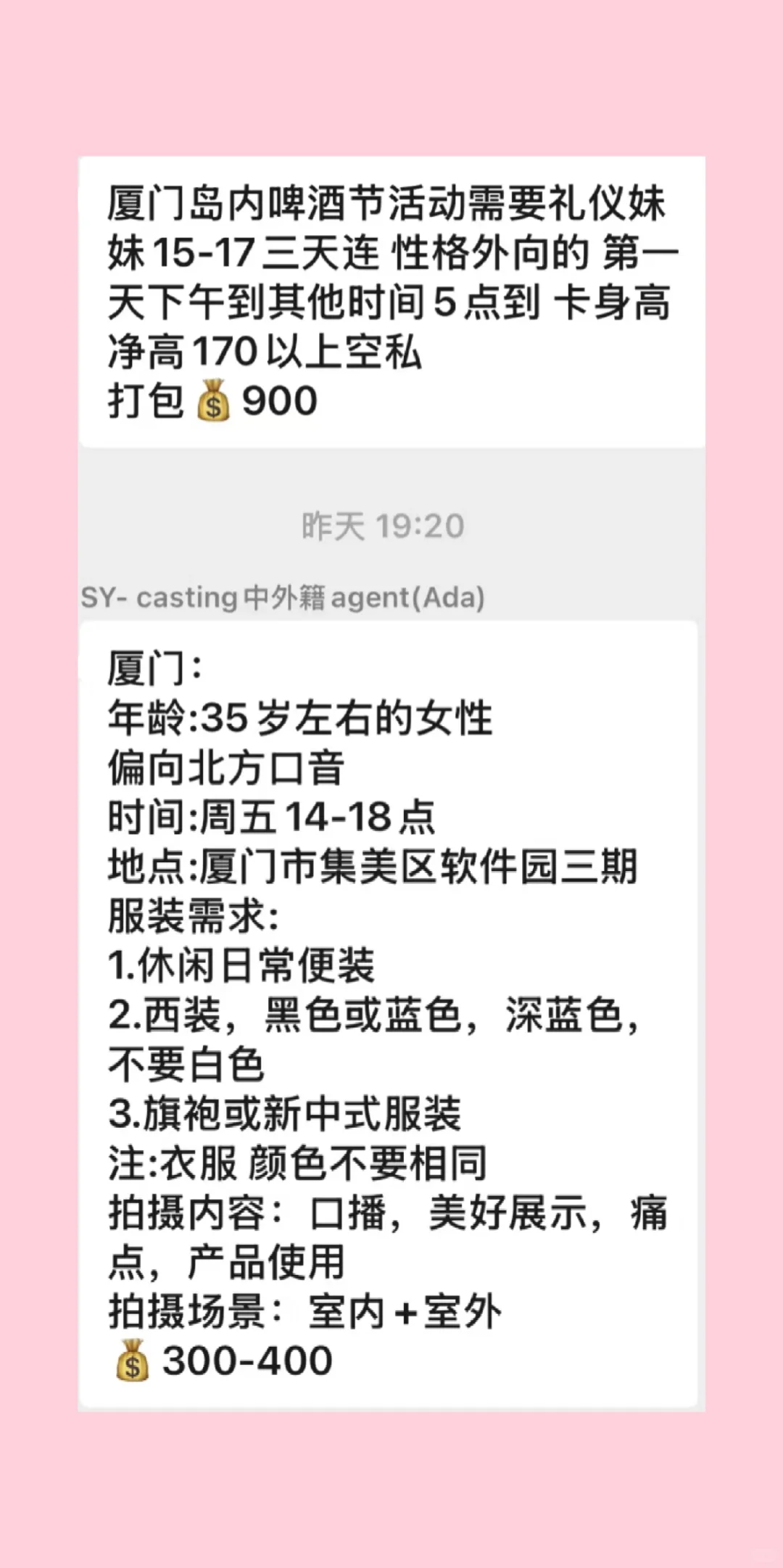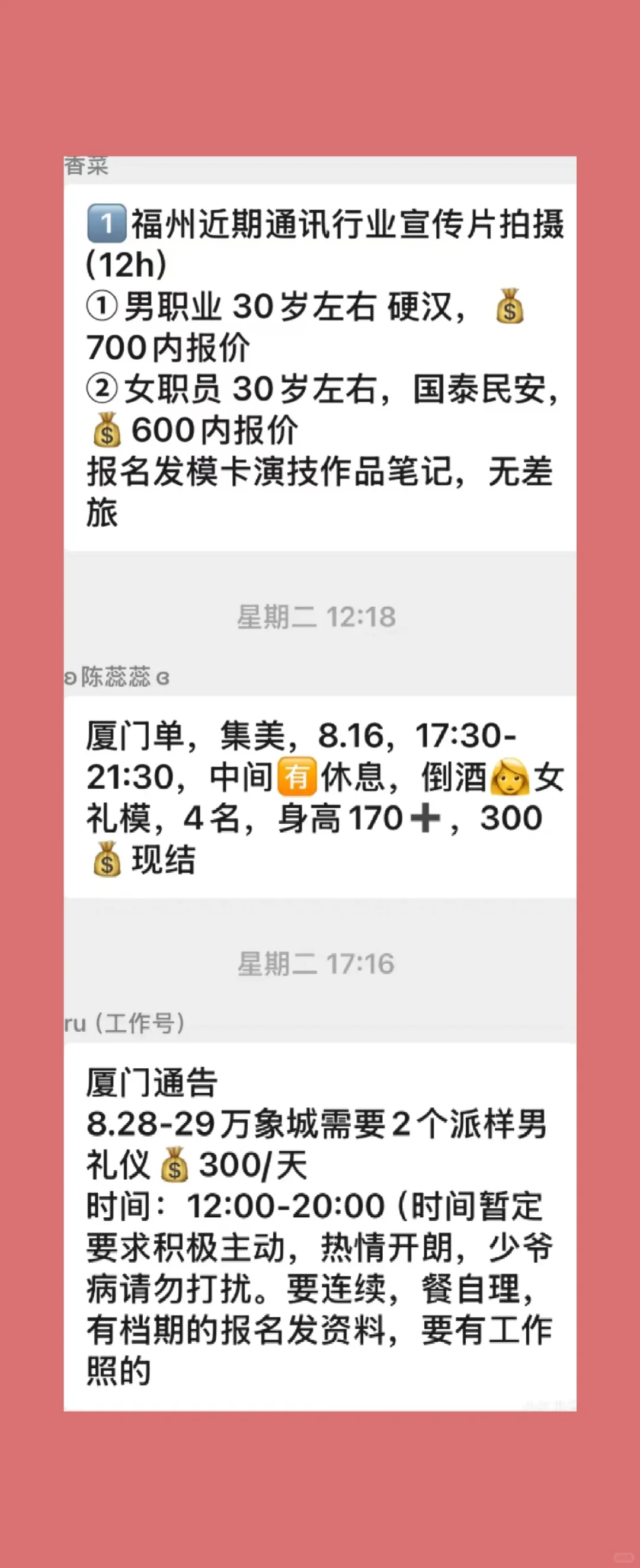 厦门模特姐妹集合!这个月爆单到连喝奶茶都要掐表⏰\n谁懂啊!作为在厦门混了3年的模特,第一次体会到“档期排到下个月”的快乐!\n月初还在担心本月KPI,现在打开工作群全是甲方爸爸的消息:“思明区下午茶拍摄缺1位”“环岛路婚纱样片需要2名气质型”“商场活动礼仪补3个名额”……从早秋服装LOOK到文旅宣传片,从直播助播到品牌静态展,厦门的拍摄需求像开了闸,我们群里20+姐妹这周基本没断过档,连新手妹妹都接到了3单优质活!\n最香的是不用跑远!思明、湖里、集美热门拍摄地基本半小时内直达,拍完还能顺路去八市炫碗沙茶面。昨天帮闺蜜代了个鼓浪屿的旅拍,客户当场加了档期,还说“厦门模特性价比高又懂镜头感”~\n想加入的厦门模特姐妹看这里!群里每天同步一手资源,会帮新人避坑,还能组队拼妆造、共享拍摄道具。现在进群说不定还能赶上月底的品牌大拍摄,手慢真的无!\n厦门模特 #厦门兼职 #模特接单 #厦门拍照 #搞钱女孩#全国礼仪模特主持演艺演员通告 #平面模特 #礼仪模特 #模特约拍 #演员通告 #模特走秀 #新人模特 #品牌方合作 #模特拍摄