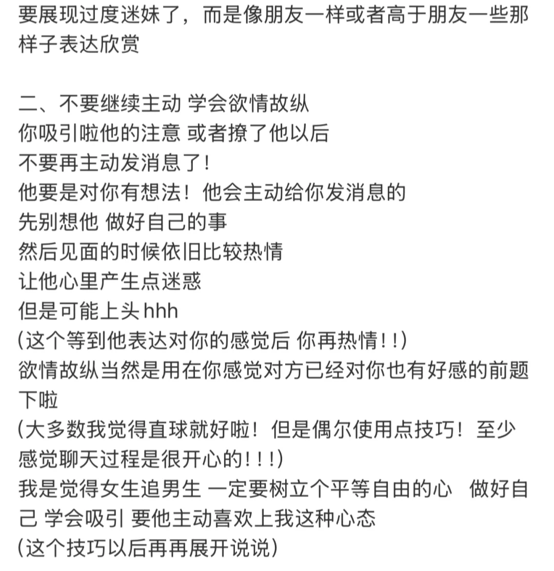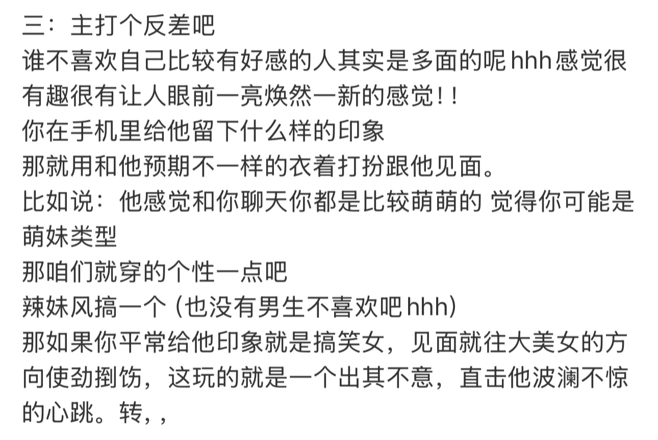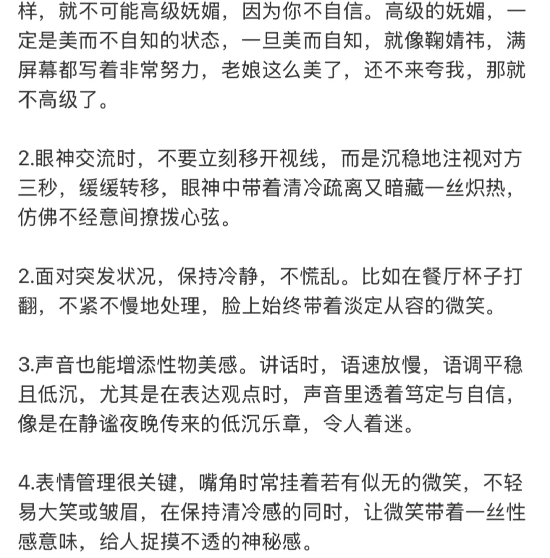 纯:洁净底色\n内在的澄澈感。眼神的干净、笑容的不设防、姿态里的自然松弛。白月光小仙女般的存在。\n媚:流动风情\n浑然天成的流露,内化的性感。它是水波的涟漪,柔和而具有穿透力,直接拨动心弦。\n烧:克制炽热\n最核心精妙的部分。引人靠近,不敢轻易触碰。在欲言又止的唇齿间,转身时若隐若现的曲线里,是一种引而不发的张力,一种让人心痒的、想要一探究竟的神秘感。是“可远观而不可亵玩”带来的极致吸引。\n \n如何打造“纯、媚、烧”的形象与人设\n形象\n清纯款式,搭配微妙性感。\n洁白的棉质连衣裙,剪裁合体,恰到好处地勾勒腰线;\n宽松的男友风衬衫,解开两颗纽扣,露出精致锁骨。\n神态:拥有好奇眼神,在理解某个笑点时,嘴角泛起一丝了然于心的、带着女人味的笑意。倾听时专注(纯),表达观点时带着温柔力量(媚)。\n语言:关键词上略有停顿,语言在唇齿间经过了温柔的斟酌,从而产生一种抓人的魅力。\n人设\n“纯”:展现对世界的好奇与善意,热爱小动物,会被简单的美好感动。\n“媚”:不经意间透露你的学识、见解和独特的爱好,让人发现你的有趣灵魂。\n“烧”:关键时刻,展现不轻易为人知的一面,酒吧里精准点评一款威士忌的专注,谈及梦想时有野心。反差是足以让人深陷其中。\n这样的女子像一座圣殿与秘园交织的城池。我们总是不可自拔地,迷恋着那介于神庙与深渊之间的、危险而圣洁的美。\n文字原创\n#女追男 #撩汉小技巧 #恋爱小技巧 #普通人的变美思路 #追男生 #撒娇 #女性成长 #女性智慧 #女性必看 #女性力量 #偷偷变美惊艳所有人#女性力量 #保持饥饿感 #变瘦变美变年轻 #理想型身材#女人保养 #女人爱自己 #美貌的尽头是养生 #发现我的女性力量 #女人爱自己从保养#水静纯pure #好嫁风 #撩汉小技巧 #普通人的变美思路 #恋爱技巧 #高情商 #撩汉话术 #绿茶#让男友瞬间上头 #亲密关系 #恋爱小技巧#撩汉 #恋爱技巧 #脱单 #我要脱单