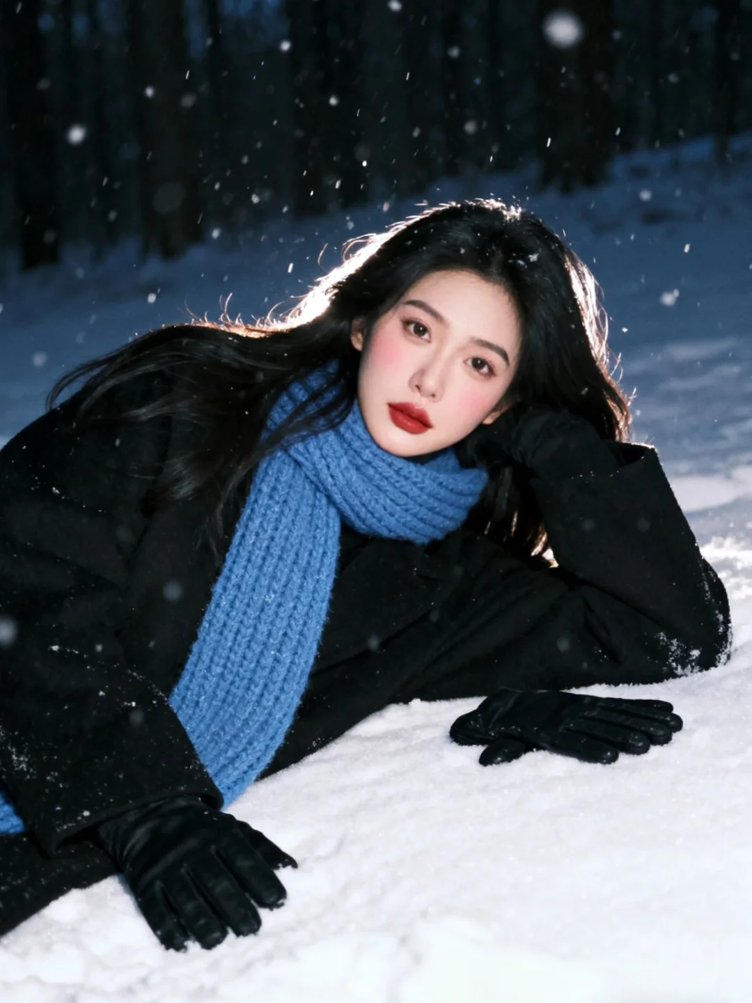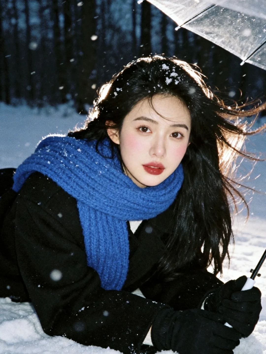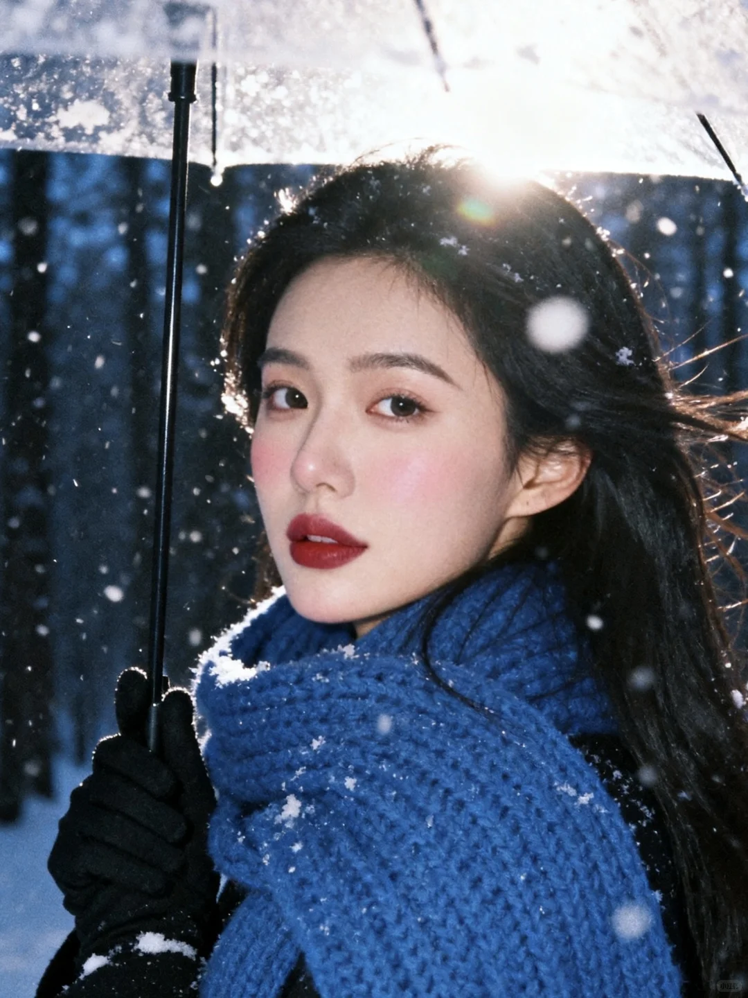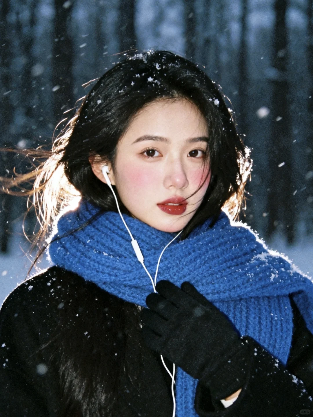 雪景不用等,0成本拥有清冷感雪景写真,教程超级简单!\n \n1️⃣打开豆bao,选取一张淡妆正面照,越正面会越像\n \n2️⃣复制口令:生成10张照片,人物表情、动作、取景、角度和场景互动丰富,保持人物长相不变,黑长发,侧面头转过来看镜头,有侧逆光打在脸上,有的光打在飘逸的头发上,蓝色粗针织大围巾,宽松黑色大衣,黑色手套,头身比例正常和谐,皮肤通透,妆容是冬日冻感纯欲风,腮红为自然淡粉色,大面积晕染在脸颊、鼻头,下巴也有腮红,营造出被冻得自然泛红,唇釉选自然清新的红棕豆沙色调,唇釉边缘模糊,呈现自然晕染的质感;晚上的雪景森林,旧胶片机闪光灯拍摄,可搭配透明雨伞和有线白色耳机,雨伞跟耳机不同时出现在画面;动作要自然灵动,包含躺雪、撑伞转头、靠树聆听、侧身站立等互动感姿势;构图涵盖脸部特写、近景、半身、全身,角度多样(仰拍、正俯、侧拍等)。雪花呈现真实飘落的虚实质感,色调以清冷暗灰色蓝调为主,带细腻胶片颗粒感,营造冬日浪漫‘易碎感’,人物表情放空或温柔直视镜头,让画面充满静谧故事性。朦胧氛围感。人物居中占比三分之一,尽量真实生动可爱。比例 3:4。\n \n3️⃣复制口令:增加10张照片,特写,人物动作、角度丰富。\n \n快试试!记得来交作业啊~😘\n \n图片随便发\n文字是up自己磨出来的,复制发帖请标注出处\n \n#雪天氛围照就这么拍 #雪天拍照 #雪景写真 #下雪天这样拍#日系雪景写真 #雪景氛围感 #下雪天氛围感#日系写真 #韩系雪景 #冬日雪景拍照