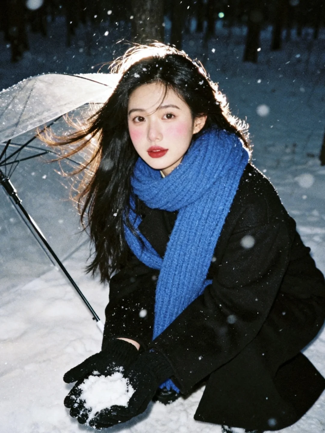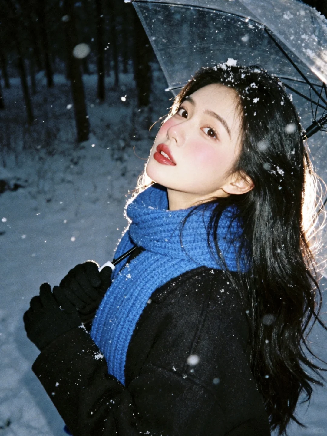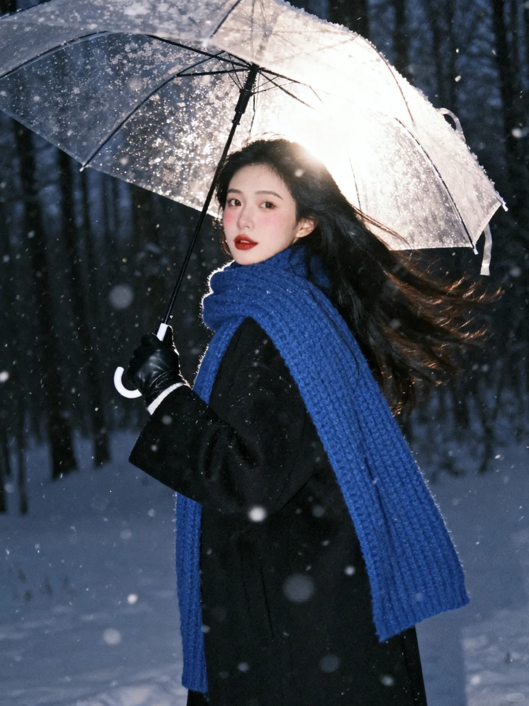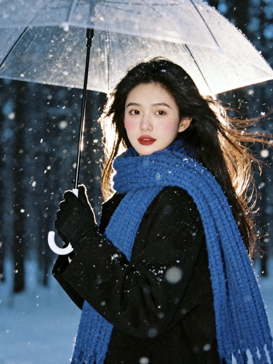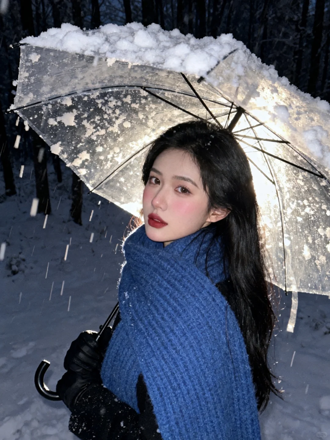 雪景不用等,0成本拥有清冷感雪景写真,教程超级简单!\n \n1️⃣打开豆bao,选取一张淡妆正面照,越正面会越像\n \n2️⃣复制口令:生成10张照片,人物表情、动作、取景、角度和场景互动丰富,保持人物长相不变,黑长发,侧面头转过来看镜头,有侧逆光打在脸上,有的光打在飘逸的头发上,蓝色粗针织大围巾,宽松黑色大衣,黑色手套,头身比例正常和谐,皮肤通透,妆容是冬日冻感纯欲风,腮红为自然淡粉色,大面积晕染在脸颊、鼻头,下巴也有腮红,营造出被冻得自然泛红,唇釉选自然清新的红棕豆沙色调,唇釉边缘模糊,呈现自然晕染的质感;晚上的雪景森林,旧胶片机闪光灯拍摄,可搭配透明雨伞和有线白色耳机,雨伞跟耳机不同时出现在画面;动作要自然灵动,包含躺雪、撑伞转头、靠树聆听、侧身站立等互动感姿势;构图涵盖脸部特写、近景、半身、全身,角度多样(仰拍、正俯、侧拍等)。雪花呈现真实飘落的虚实质感,色调以清冷暗灰色蓝调为主,带细腻胶片颗粒感,营造冬日浪漫‘易碎感’,人物表情放空或温柔直视镜头,让画面充满静谧故事性。朦胧氛围感。人物居中占比三分之一,尽量真实生动可爱。比例 3:4。\n \n3️⃣复制口令:增加10张照片,特写,人物动作、角度丰富。\n \n快试试!记得来交作业啊~😘\n \n图片随便发\n文字是up自己磨出来的,复制发帖请标注出处\n \n#雪天氛围照就这么拍 #雪天拍照 #雪景写真 #下雪天这样拍#日系雪景写真 #雪景氛围感 #下雪天氛围感#日系写真 #韩系雪景 #冬日雪景拍照