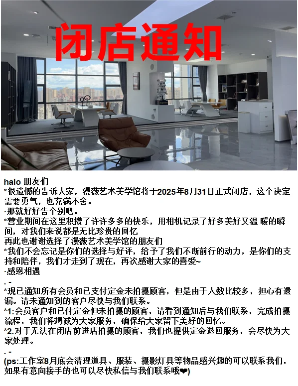 哈喽,朋友们\n由于场地租约到期\n漫薇艺术美学馆将于2025年8月31日正式闭店。\n很遗憾要和大家说再见了。\n这个决定需要勇气,也充满不舍。\n那就好好告个别吧。\n-\n营业期间\n在这里积攒了许许多多的快乐\n用相机记录了好多美好又温暖的瞬间\n对我们来说都是无比珍贵的回忆\n再此也谢谢选择了漫薇艺术美学馆的朋友们\n很感动很不舍\n我们不会忘记是你们的选择与好评\n给予了我们不断前行的动力。\n是你们的支持和陪伴,我们才走到了现在\n再次感谢大家的喜爱\n感恩相遇❤️\n-\n❗️重要提醒❗️\n现已通知所有会员和已支付定金未拍摄顾客,但是由于人数比较多,担心有遗漏。请未通知到的客户尽快与我们联系。\n1. 会员客户和已付定金但未拍摄的顾客,请看到通知后尽快与我们联系,完成拍摄流程,我们将竭诚为大家服务,确保给大家留下美好的回忆。\n2. 对于无法在闭店前进店拍摄的顾客,我们也提供定金退回服务,我们会尽快为大家处理。\n3.已拍摄完的客户我们会尽快给大家提交精修照片。\n-\n(ps:店铺转让,感兴趣的可以联系我们哦❤️)\n#赣州写真#江西写真#赣州摄影工作室#赣州店铺转让#店铺转让招租 #江西写真店铺转让 #江西摄影工作室#写真店转让#摄影工作室转让#写真馆转让