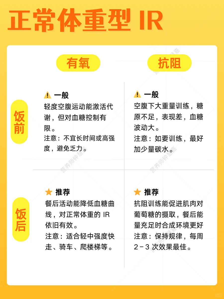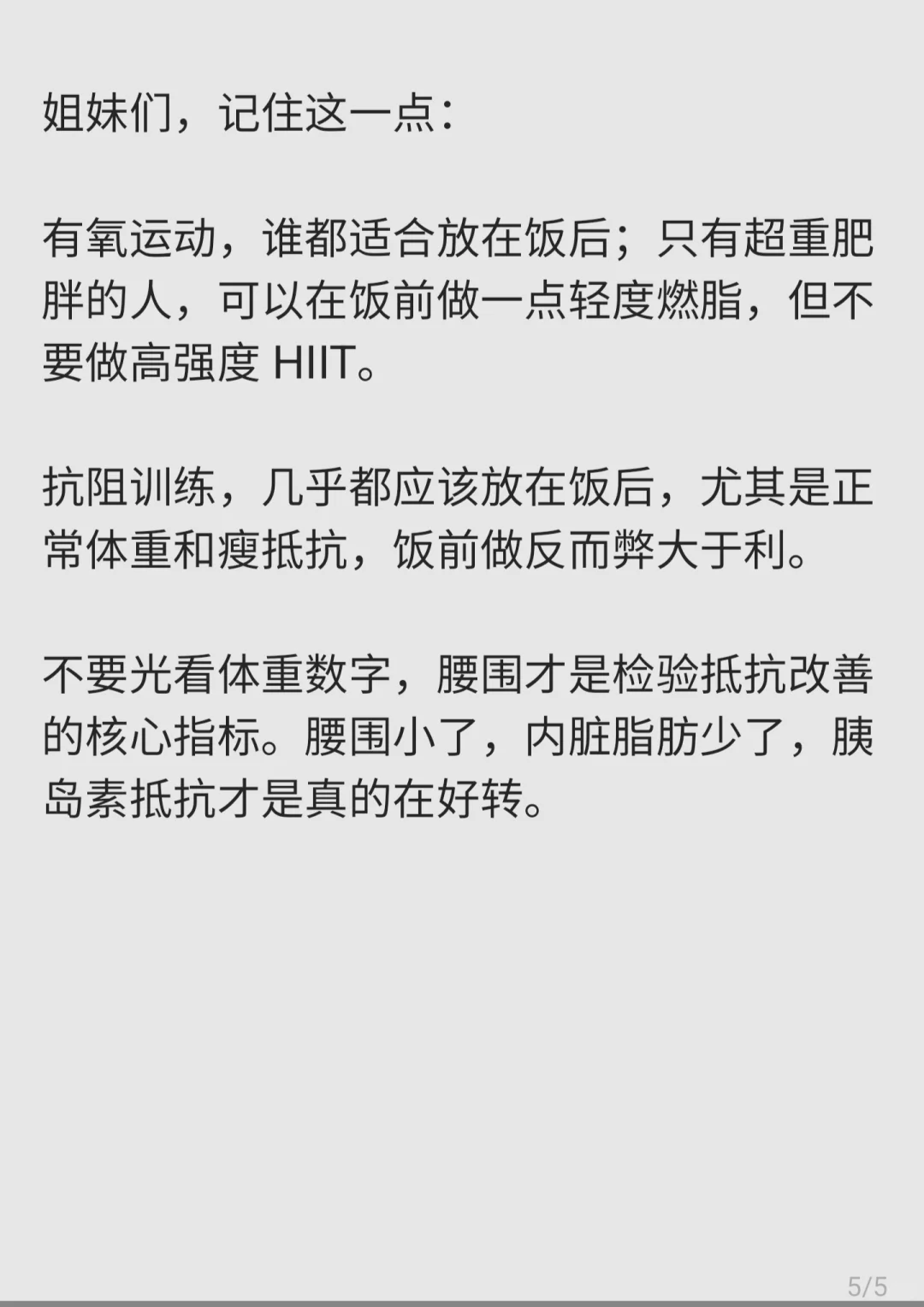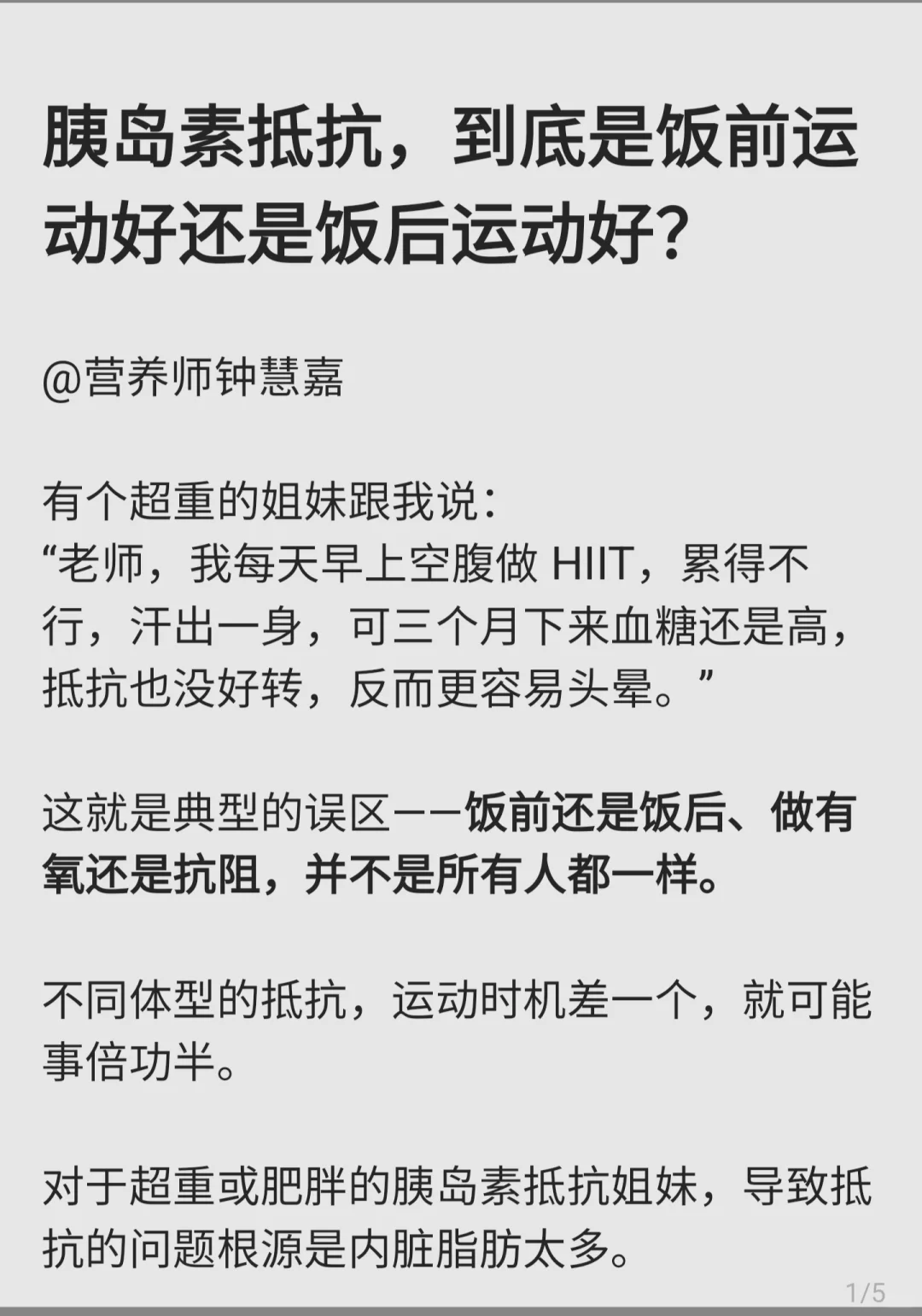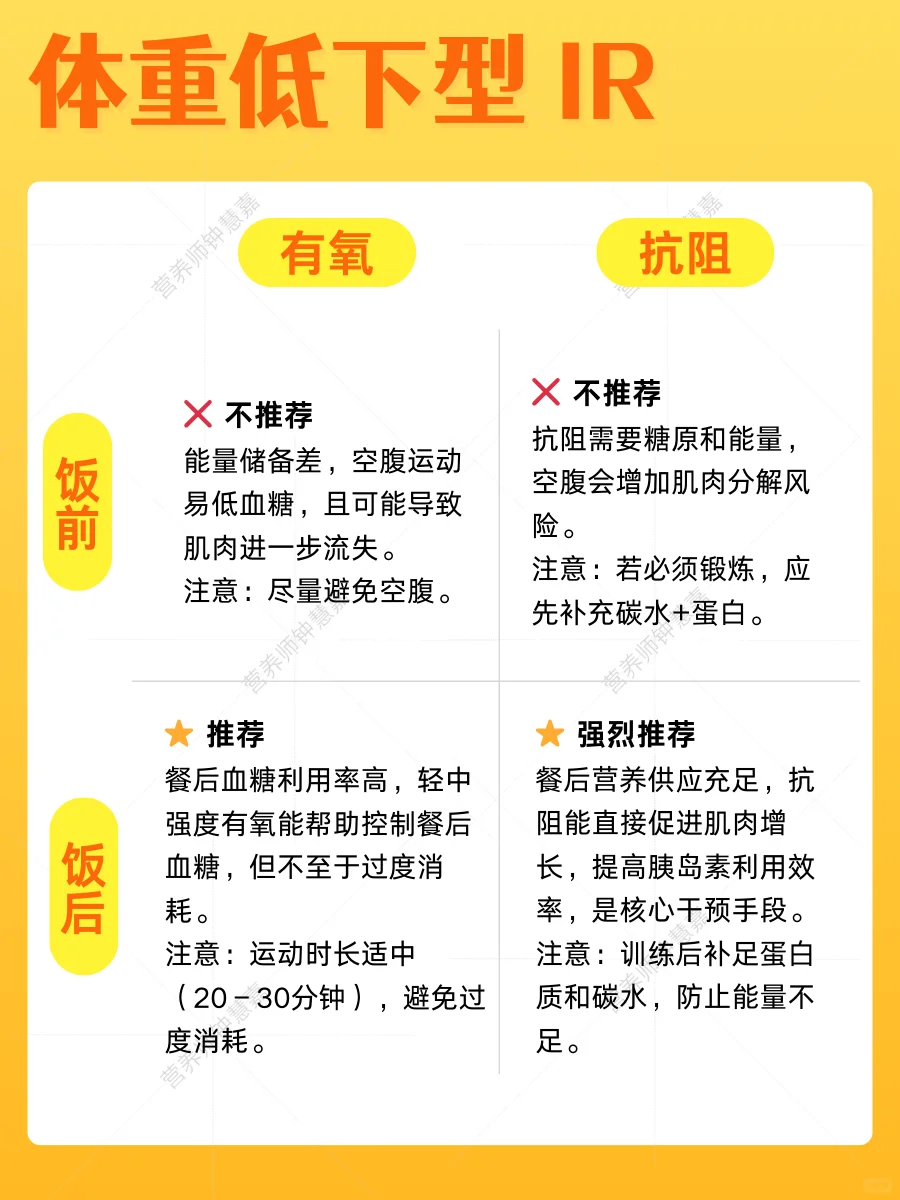 有个超重的姐妹跟我说: “老师,我每天早上空腹做 HIIT,累得不行,汗出一身,可三个月下来血糖还是高,抵抗也没好转,反而更容易头晕。”\n这就是典型的误区——饭前还是饭后、做有氧还是抗阻,并不是所有人都一样。不同体型的抵抗,运动时机差一个,就可能事倍功半。\n \n对于超重或肥胖的胰岛素抵抗姐妹,导致抵抗的问题根源是内脏脂肪太多。\n反过来,如果大基数的姐妹空腹做大重量,或者直接做高强度HIIT,就会很容易出现头晕、感觉很累,甚至低血糖,训练表现也不好。对于胖抵抗,更稳妥的方式是把强度留在饭后,把燃脂耐力交给饭前轻中强度有氧,比如拉伸、轻快走。\n所以胖抵抗的运动关键词是——饭后为主,有氧和抗阻都要结合。\n \n而正常体重的抵抗,往往是两种情况混在一起:肌肉不够,又有一点点脂肪过多。\n这些姐妹最容易犯的错,就是一边低碳忌口,一边拼命做有氧,结果体重掉了,肌肉也掉了,抵抗更严重。\n她们真的需要的,是把精制糖减掉,把快碳换成慢碳,保证蛋白质足够,再把运动重点放在抗阻。饭后去做抗阻训练,不但能消耗掉血糖,还能补上身体缺失的肌肉储备。饭后有氧当然也有效,但最好只是辅助。至于饭前,无论是有氧还是抗阻,都不太适合,拉不了热量差,腰围不减反而掉肌肉。\n所以正常体重的运动关键词是——饭后抗阻为主,有氧为辅。\n \n最后是瘦抵抗,BMI低于18.5,看起来也许很瘦,但实际上是肌肉太少了。\n这类人最怕的是空腹运动。空腹有氧,掉的是很来就不多的肌肉;空腹抗阻,更是力不从心,还可能把身体推到更差的状态,瘦抵抗姐妹的核心任务,就是“吃饱+长肉”。饭后去做抗阻训练,正好利用餐后的能量和蛋白质,肌肉合成环境最佳。饭后散步、轻快走也可以,但不能多,避免过度消耗。\n所以瘦抵抗的运动关键词是——餐后抗阻最重要,轻有氧点到即止。\n \n姐妹们,记住这一点:\n有氧运动,谁都适合放在饭后;只有超重肥胖的人,可以在饭前做一点轻度燃脂,但不要做高强度 HIIT。\n抗阻训练,几乎都应该放在饭后,尤其是正常体重和瘦抵抗,饭前做反而弊大于利。\n不要光看体重数字,腰围才是检验抵抗改善的核心指标。腰围小了,内脏脂肪少了,胰岛素抵抗才是真的在好转。\n \n我是钟慧嘉\n中山大学营养学硕士,注册营养师\n专注于30+岁慢性病指标调理\n \n#胰岛素抵抗 #饭前还是饭后运动 #胰岛素抵抗运动 #营养 #胰岛素抵抗管理方法 #瘦抵抗