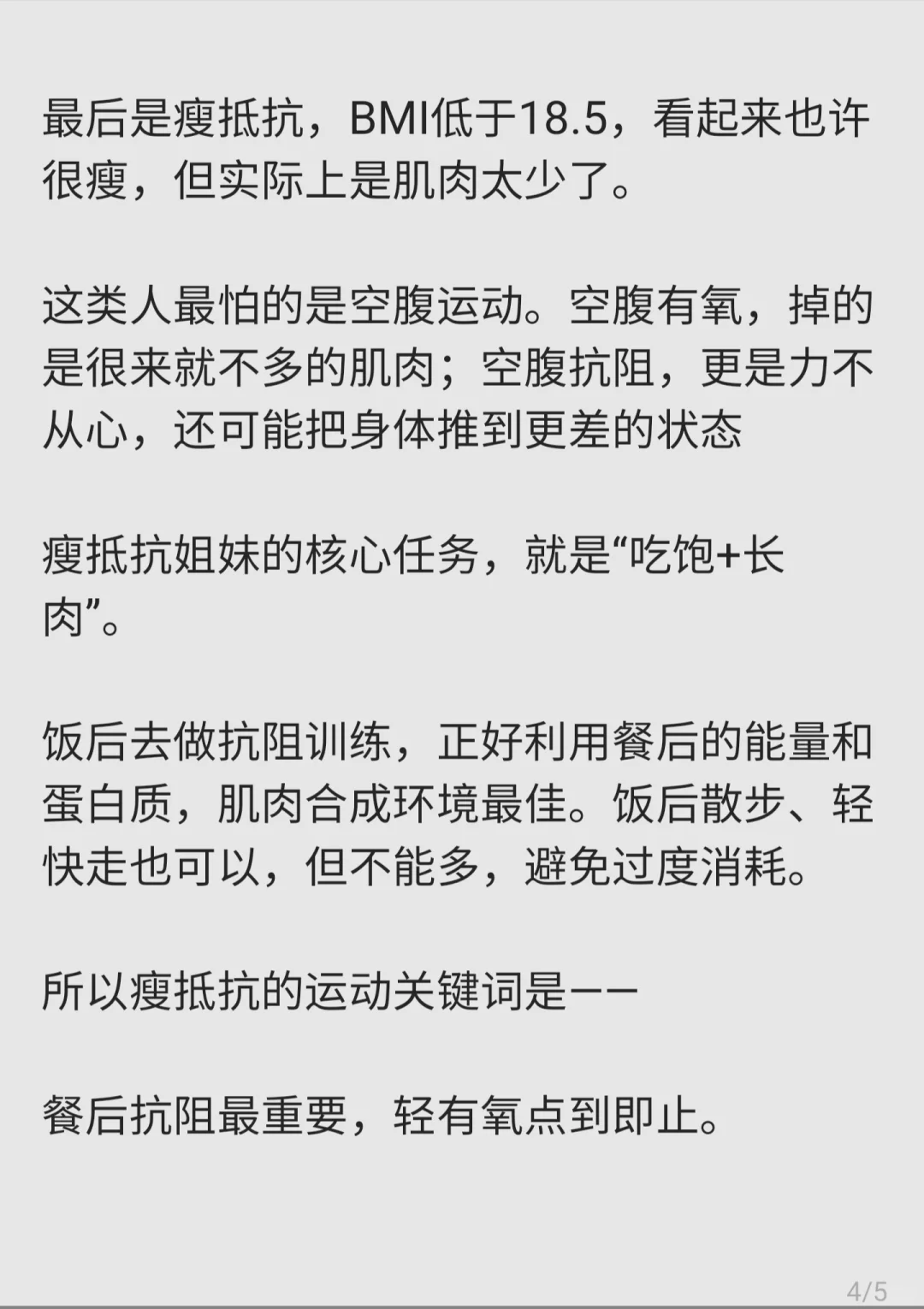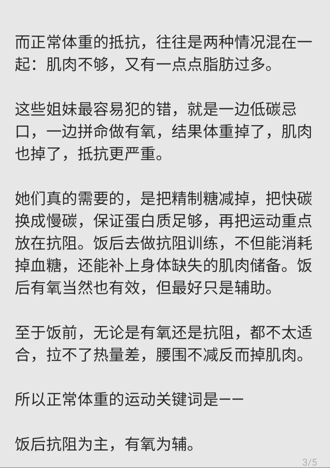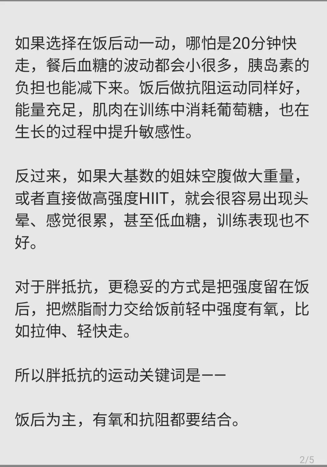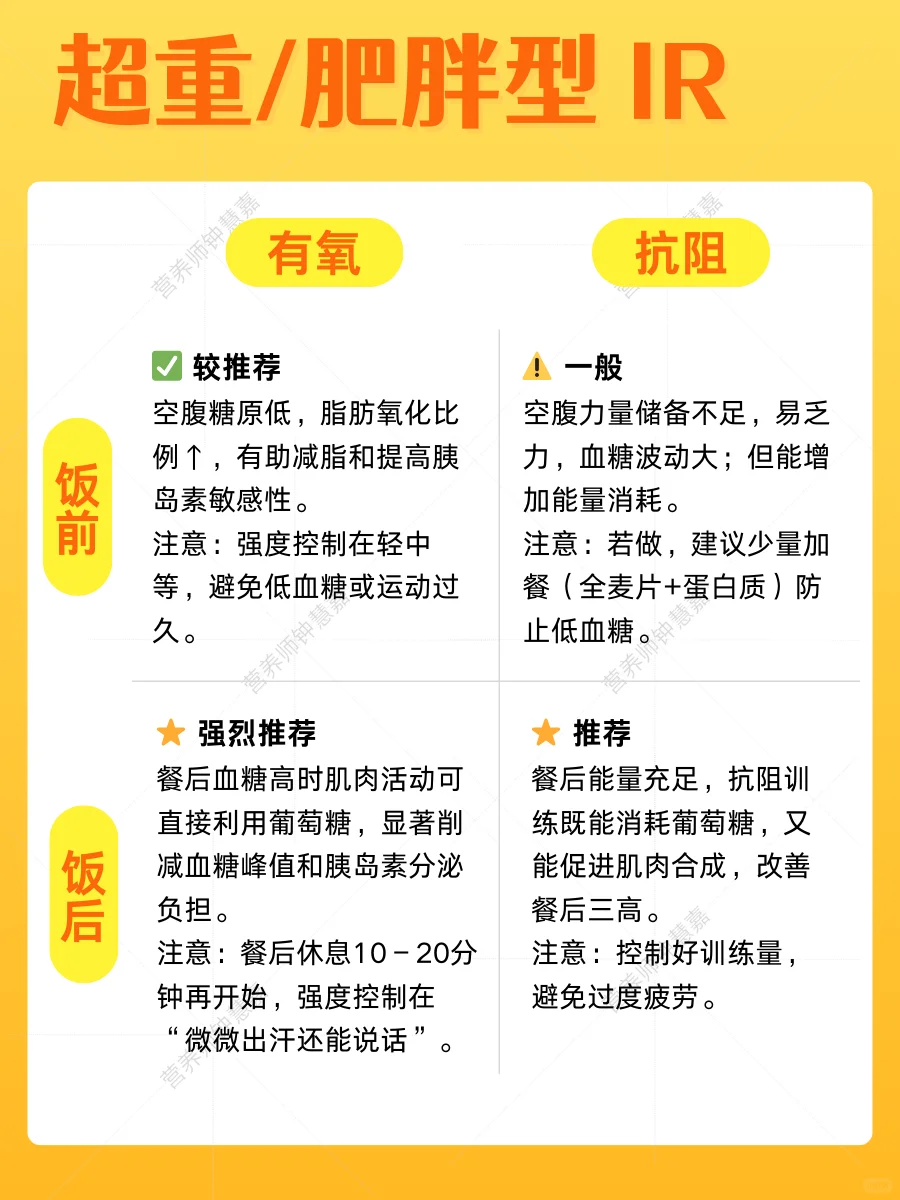 有个超重的姐妹跟我说: “老师,我每天早上空腹做 HIIT,累得不行,汗出一身,可三个月下来血糖还是高,抵抗也没好转,反而更容易头晕。”\n这就是典型的误区——饭前还是饭后、做有氧还是抗阻,并不是所有人都一样。不同体型的抵抗,运动时机差一个,就可能事倍功半。\n \n对于超重或肥胖的胰岛素抵抗姐妹,导致抵抗的问题根源是内脏脂肪太多。\n反过来,如果大基数的姐妹空腹做大重量,或者直接做高强度HIIT,就会很容易出现头晕、感觉很累,甚至低血糖,训练表现也不好。对于胖抵抗,更稳妥的方式是把强度留在饭后,把燃脂耐力交给饭前轻中强度有氧,比如拉伸、轻快走。\n所以胖抵抗的运动关键词是——饭后为主,有氧和抗阻都要结合。\n \n而正常体重的抵抗,往往是两种情况混在一起:肌肉不够,又有一点点脂肪过多。\n这些姐妹最容易犯的错,就是一边低碳忌口,一边拼命做有氧,结果体重掉了,肌肉也掉了,抵抗更严重。\n她们真的需要的,是把精制糖减掉,把快碳换成慢碳,保证蛋白质足够,再把运动重点放在抗阻。饭后去做抗阻训练,不但能消耗掉血糖,还能补上身体缺失的肌肉储备。饭后有氧当然也有效,但最好只是辅助。至于饭前,无论是有氧还是抗阻,都不太适合,拉不了热量差,腰围不减反而掉肌肉。\n所以正常体重的运动关键词是——饭后抗阻为主,有氧为辅。\n \n最后是瘦抵抗,BMI低于18.5,看起来也许很瘦,但实际上是肌肉太少了。\n这类人最怕的是空腹运动。空腹有氧,掉的是很来就不多的肌肉;空腹抗阻,更是力不从心,还可能把身体推到更差的状态,瘦抵抗姐妹的核心任务,就是“吃饱+长肉”。饭后去做抗阻训练,正好利用餐后的能量和蛋白质,肌肉合成环境最佳。饭后散步、轻快走也可以,但不能多,避免过度消耗。\n所以瘦抵抗的运动关键词是——餐后抗阻最重要,轻有氧点到即止。\n \n姐妹们,记住这一点:\n有氧运动,谁都适合放在饭后;只有超重肥胖的人,可以在饭前做一点轻度燃脂,但不要做高强度 HIIT。\n抗阻训练,几乎都应该放在饭后,尤其是正常体重和瘦抵抗,饭前做反而弊大于利。\n不要光看体重数字,腰围才是检验抵抗改善的核心指标。腰围小了,内脏脂肪少了,胰岛素抵抗才是真的在好转。\n \n我是钟慧嘉\n中山大学营养学硕士,注册营养师\n专注于30+岁慢性病指标调理\n \n#胰岛素抵抗 #饭前还是饭后运动 #胰岛素抵抗运动 #营养 #胰岛素抵抗管理方法 #瘦抵抗