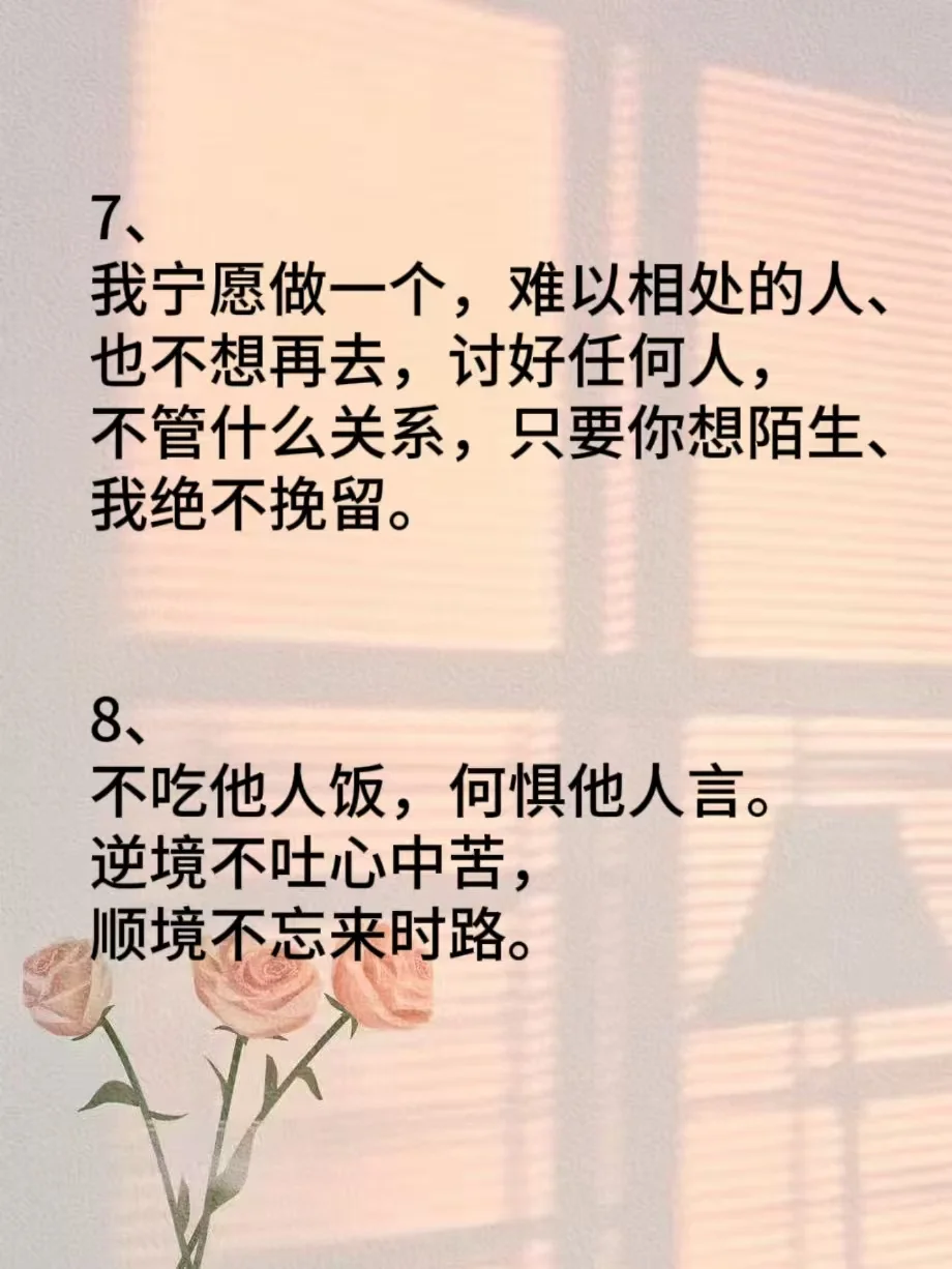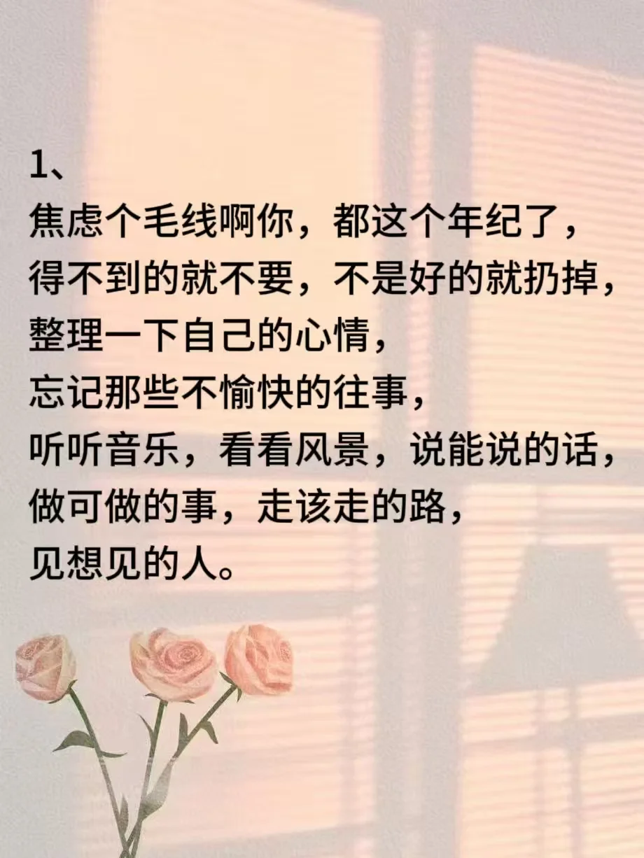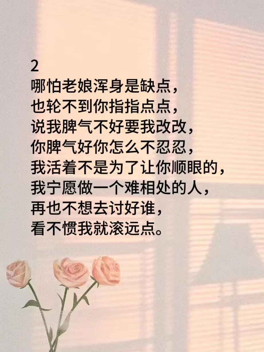 1、🍻\n焦虑个毛线啊你,都这个年纪了,得不到的就不要,不是好的就扔掉,整理一下自己的心情,忘记那些不愉快的往事,\n听听音乐,看看风景,说能说的话,做可做的事,走该走的路,见想见的人。\n2🌺\n哪怕老娘浑身是缺点,也轮不到你指指点点,说我脾气不好要我改改,你脾气好你怎么不忍忍,\n我活着不是为了让你顺眼的,我宁愿做一个难相处的人,再也不想去讨好谁,看不惯我就滚远点。\n3、❤️\n不高,不瘦,不漂亮,\n但仍然是自己喜欢的样子。生而悦己,而非困于他人。\n4\n宁做妖精,不做怨妇,\n生活虐我千万遍,我把生活当初恋,姐妹们,格局打开,该干嘛干嘛!\n5\n姐不是路边算卦的,说不出你爱听的话,\n从不活在别人的期待里,我只想成为自己,\n不是我性格不好是你驾驭不了。\n6、\n坦坦荡荡的爱钱,大大方方的物质,明明白白的现实,自此鲜花赠自己,纵马踏花向自由。\n7、\n我宁愿做一个,难以相处的人、也不想再去,讨好任何人,不管什么关系,只要你想陌生、我绝不挽留。\n8、蛋糕🍰\n不吃他人饭,何惧他人言。逆境不吐心中苦,顺境不忘来时路。\n9、\n“人与人之间的关系本就很浅薄,稍不留意就会变得可有可无”\n10、\n我的靠山,从来不是别人,而是我自己。\n那个能在风雨中为我撑伞、在困境中为我兜底的人,永远只有我自己!\n11、😊\n人不可能每一步都正确,与其重新,不如从心。\n生活终归是属于自己的一场盛宴,不拧巴,能自洽,才能更快乐。\n12 \n不以爱之名束缚任何人,一个人走或许更浪漫。留不住就扔了,爱不爱的烦死了。失去是相互的,你不怕那我怕什么。\n \n✨✨✨✨✨✨\n \n每日文案#三观超正的句子 #看淡一切且通透的文案 #写到心坎里的文字 #那些触及心里的话 #总有一句话说到你心里 #人间清醒文案