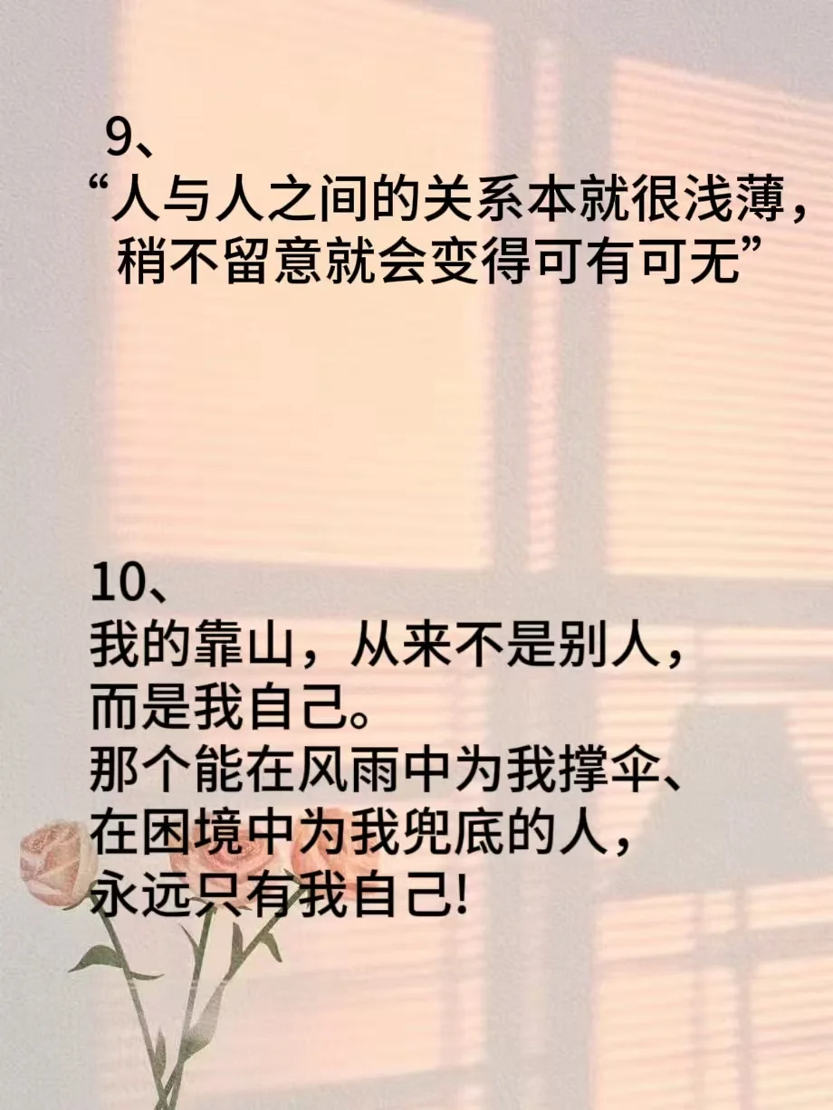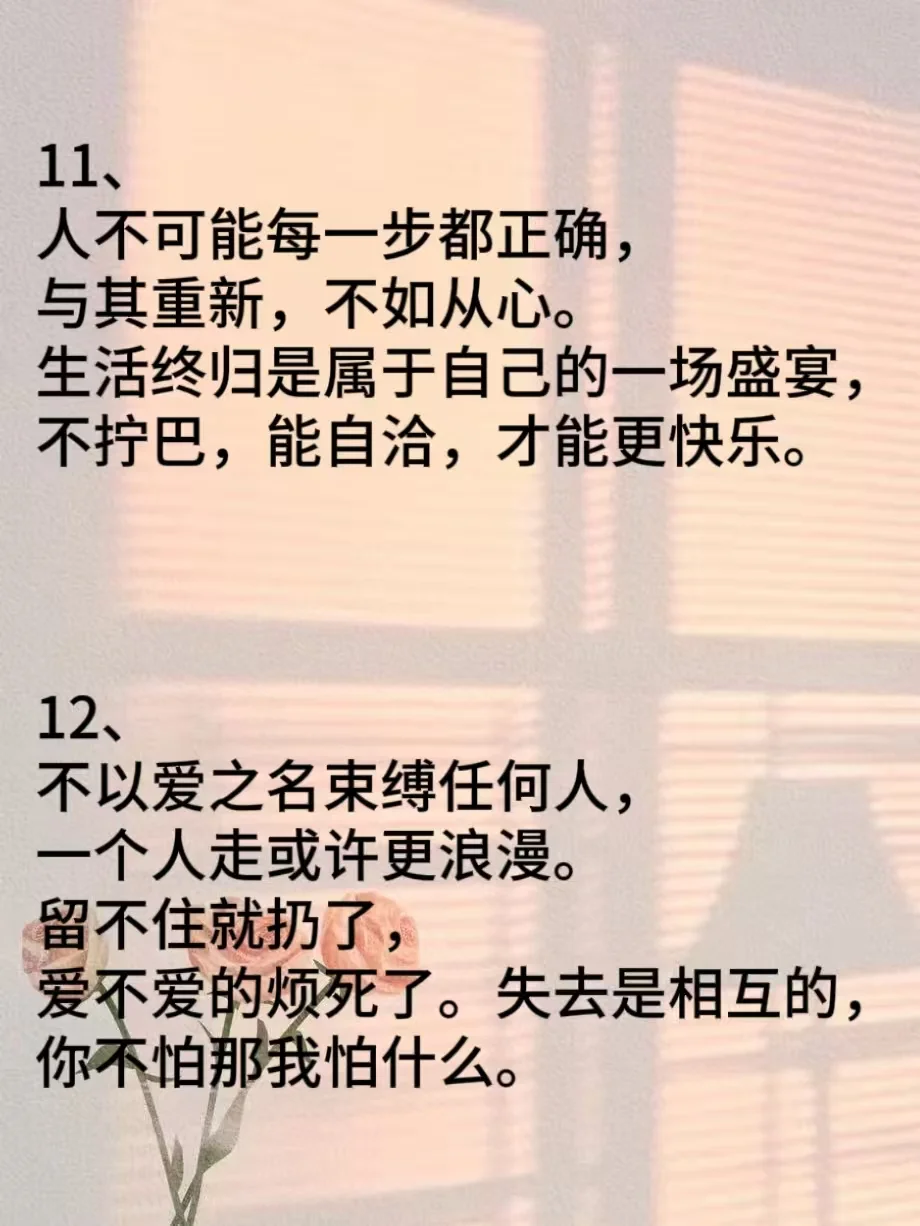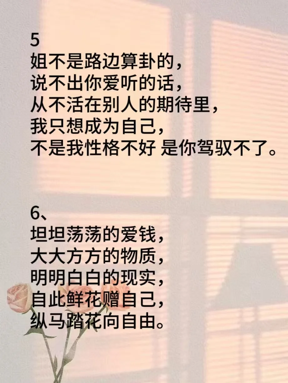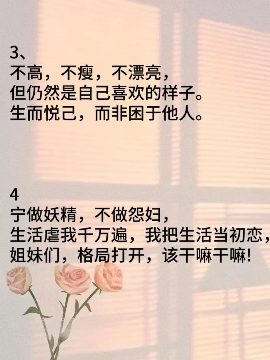1、🍻\n焦虑个毛线啊你,都这个年纪了,得不到的就不要,不是好的就扔掉,整理一下自己的心情,忘记那些不愉快的往事,\n听听音乐,看看风景,说能说的话,做可做的事,走该走的路,见想见的人。\n2🌺\n哪怕老娘浑身是缺点,也轮不到你指指点点,说我脾气不好要我改改,你脾气好你怎么不忍忍,\n我活着不是为了让你顺眼的,我宁愿做一个难相处的人,再也不想去讨好谁,看不惯我就滚远点。\n3、❤️\n不高,不瘦,不漂亮,\n但仍然是自己喜欢的样子。生而悦己,而非困于他人。\n4\n宁做妖精,不做怨妇,\n生活虐我千万遍,我把生活当初恋,姐妹们,格局打开,该干嘛干嘛!\n5\n姐不是路边算卦的,说不出你爱听的话,\n从不活在别人的期待里,我只想成为自己,\n不是我性格不好是你驾驭不了。\n6、\n坦坦荡荡的爱钱,大大方方的物质,明明白白的现实,自此鲜花赠自己,纵马踏花向自由。\n7、\n我宁愿做一个,难以相处的人、也不想再去,讨好任何人,不管什么关系,只要你想陌生、我绝不挽留。\n8、蛋糕🍰\n不吃他人饭,何惧他人言。逆境不吐心中苦,顺境不忘来时路。\n9、\n“人与人之间的关系本就很浅薄,稍不留意就会变得可有可无”\n10、\n我的靠山,从来不是别人,而是我自己。\n那个能在风雨中为我撑伞、在困境中为我兜底的人,永远只有我自己!\n11、😊\n人不可能每一步都正确,与其重新,不如从心。\n生活终归是属于自己的一场盛宴,不拧巴,能自洽,才能更快乐。\n12 \n不以爱之名束缚任何人,一个人走或许更浪漫。留不住就扔了,爱不爱的烦死了。失去是相互的,你不怕那我怕什么。\n \n✨✨✨✨✨✨\n \n每日文案#三观超正的句子 #看淡一切且通透的文案 #写到心坎里的文字 #那些触及心里的话 #总有一句话说到你心里 #人间清醒文案