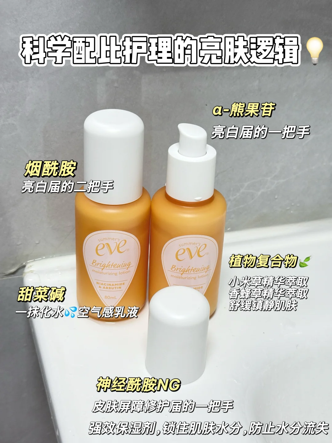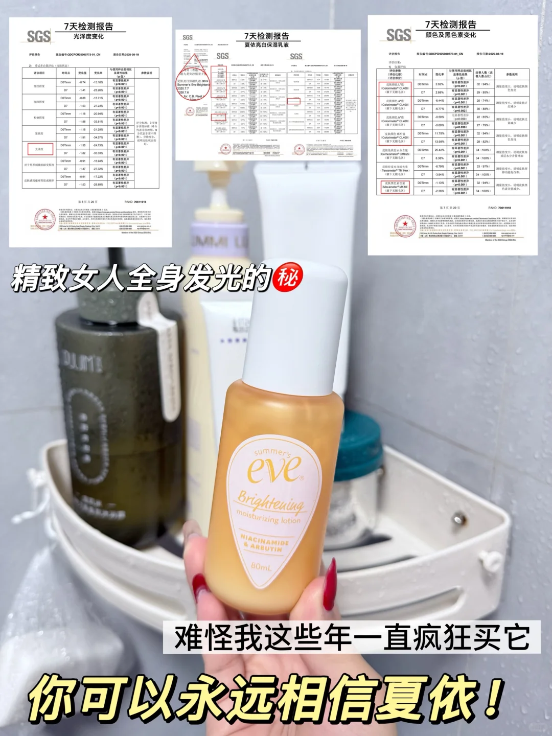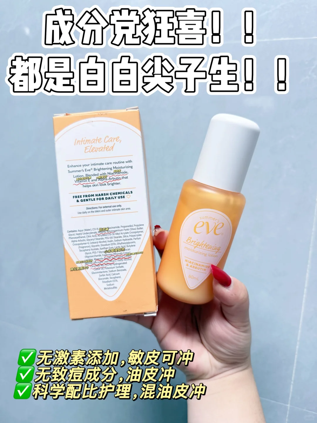 夏依是美国私护行业标杆,1972 年创立至今50多年,隶属 Prestige 上市公司,热销 75 国,专为娇嫩部位研发,比普通身体乳更懂护理需求,帮超多女生跳出护理误区,敏感肌和护理 “怕踩坑” 星人都爱它。\n✅ 采用水基乳液配方,清爽不黏腻且易吸收\n🌟含高浓度烟酰胺、α- 熊果苷(亮白届的扛把子成分)\n▫️皮肤颜色 ITA°值【7天达到13.98%的变化率】皮肤颜色有显著性差异变浅\n▫️皮肤黑色素含量【7天达到2.36%的变化率】皮肤黑色素含量有显著性差异并减少\n▫️皮肤颜色 b*值【7天达到0.6%的变化率】皮肤泛黄有显著性差异并减少\n▫️皮肤颜色 L*值【7天达到2.88%的变化率】皮肤颜色有显著性差异并变亮\n▫️皮肤光泽度【7天达到33.33%的变化率】有显著性差异变亮\n🌟神经酰胺NG,贵妇级别成分(可化作肌肤的“紧致密封水泥墙”达到巩固亮白成分的吸收并修复来自于外界刺激引发的泛红敏感问题,让肌肤细胞更有“蓬蓬感”)\n▫️皮肤颜色 a*值【7天达到6.77%的变化率】皮肤泛红有显著性差异并减少\n▫️皮肤紧致度【7天达到33.51%的变化率】有显著性差异改善\n🌟甜菜碱,补水小能手\n▫️皮肤角质层水分含量【7天达到8.38%的变化率】皮肤角质层水分含量有显著性差异并增加\n🌟植萃精华:小米草、香蜂草、木兰(自然科学配方有助于舒缓镇静肌肤)\n▫️皮肤对外界刺激的耐受程度【7天达到27.32%的变化率】有显著性差异改善,泛红减少\n▫️皮肤经皮水分流失率【7天达到3.94%的变化率】皮肤屏障功能有显著性差异并改善\n✅ 温和配方,敏感肌亲测无负担\n🌟 0酒精、0防腐剂\n🌟0三氯生(抗菌剂)\n🌟0硫酸盐(强清洁刺激表面活性剂)\n🧴科学护理更健康\n睡前睡后涂乳晕、大腿根等暗沉处\n清洁后取少量乳液,薄涂即可\n轻打圈按摩,促成分吸收\n每天 1-2 次,温和改善不激进\n⚠️:若肌肤过敏甚重者,可先做耳后测试避免过敏源\n万幸遇见它,专业SGS报告看得见,用得也很放心,更是效果看得见❗️\n“走了那么多弯路,终于找到安全有效的❗️”\n@薯队长#夏依亮白保湿乳液 #夏依蜜桃瓶#褪黑色素#私密护理#精致女人 #吊带裙自由 #秋冬养白 #女性护理 #亮白 #双十一必备