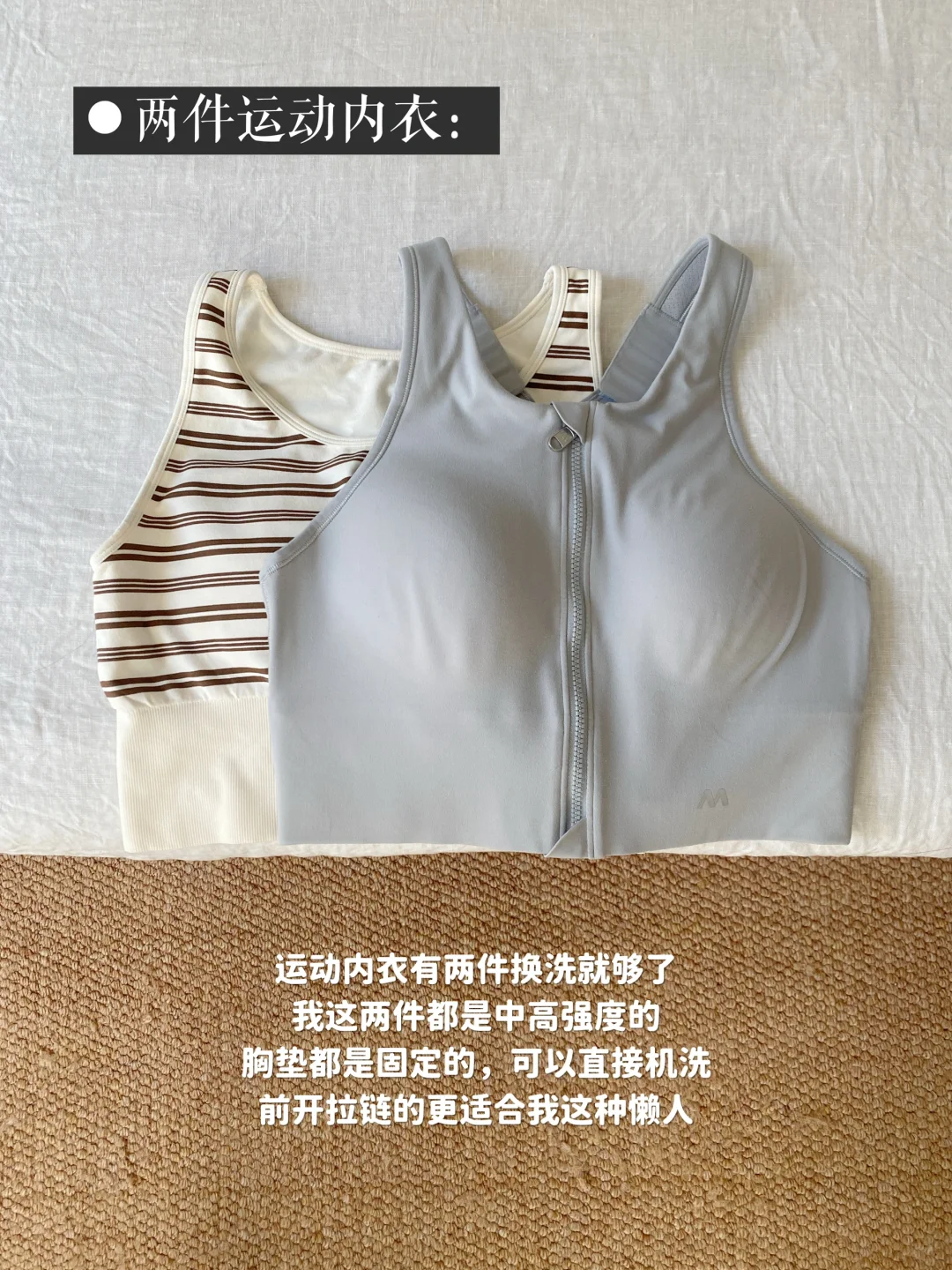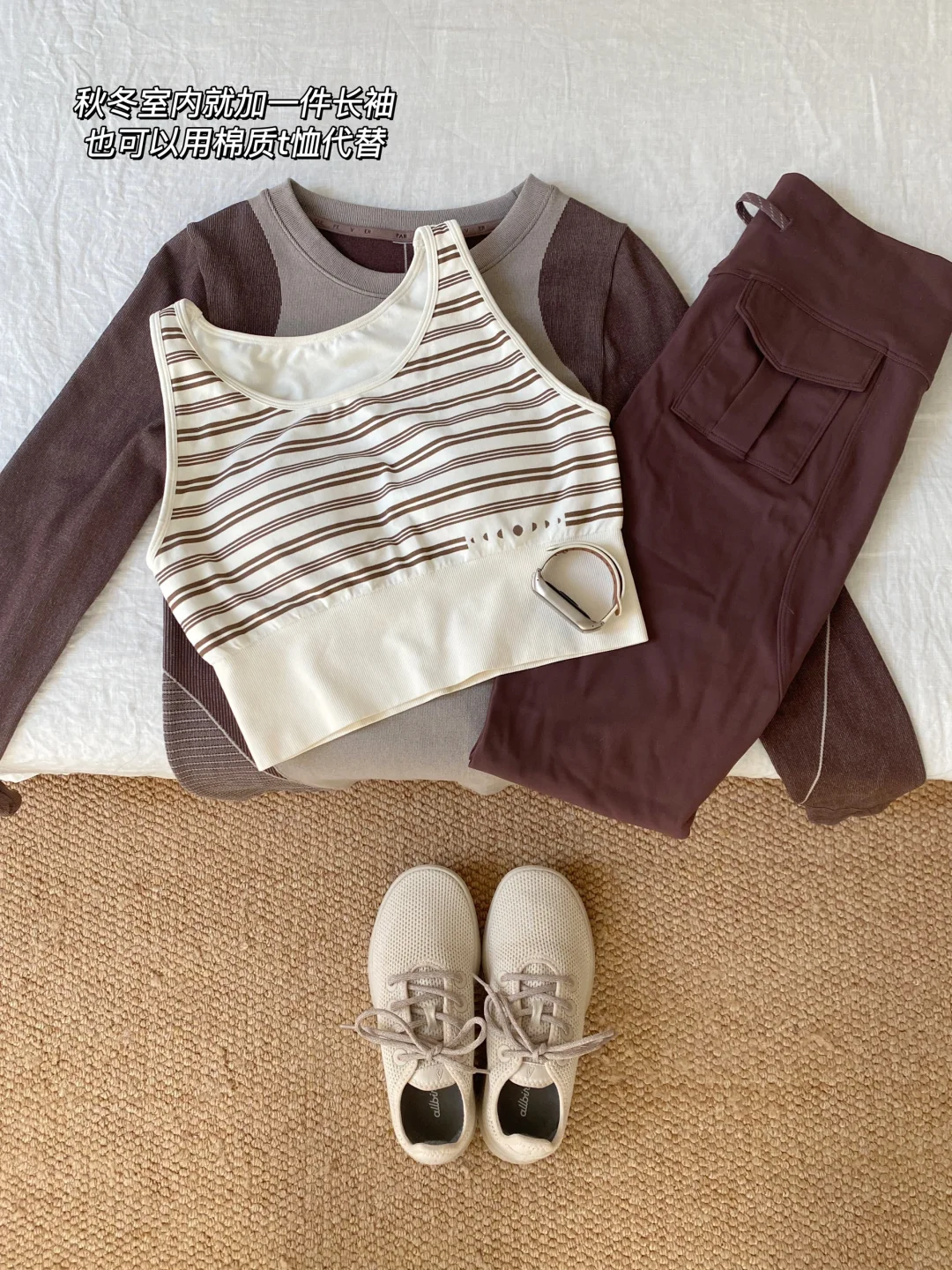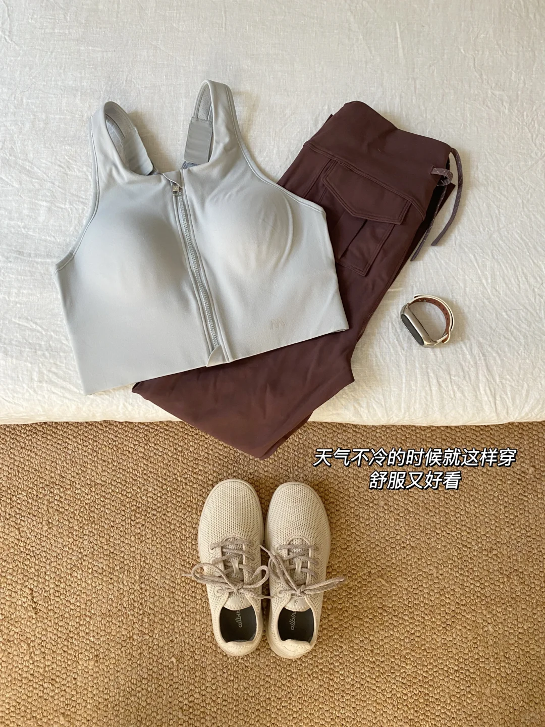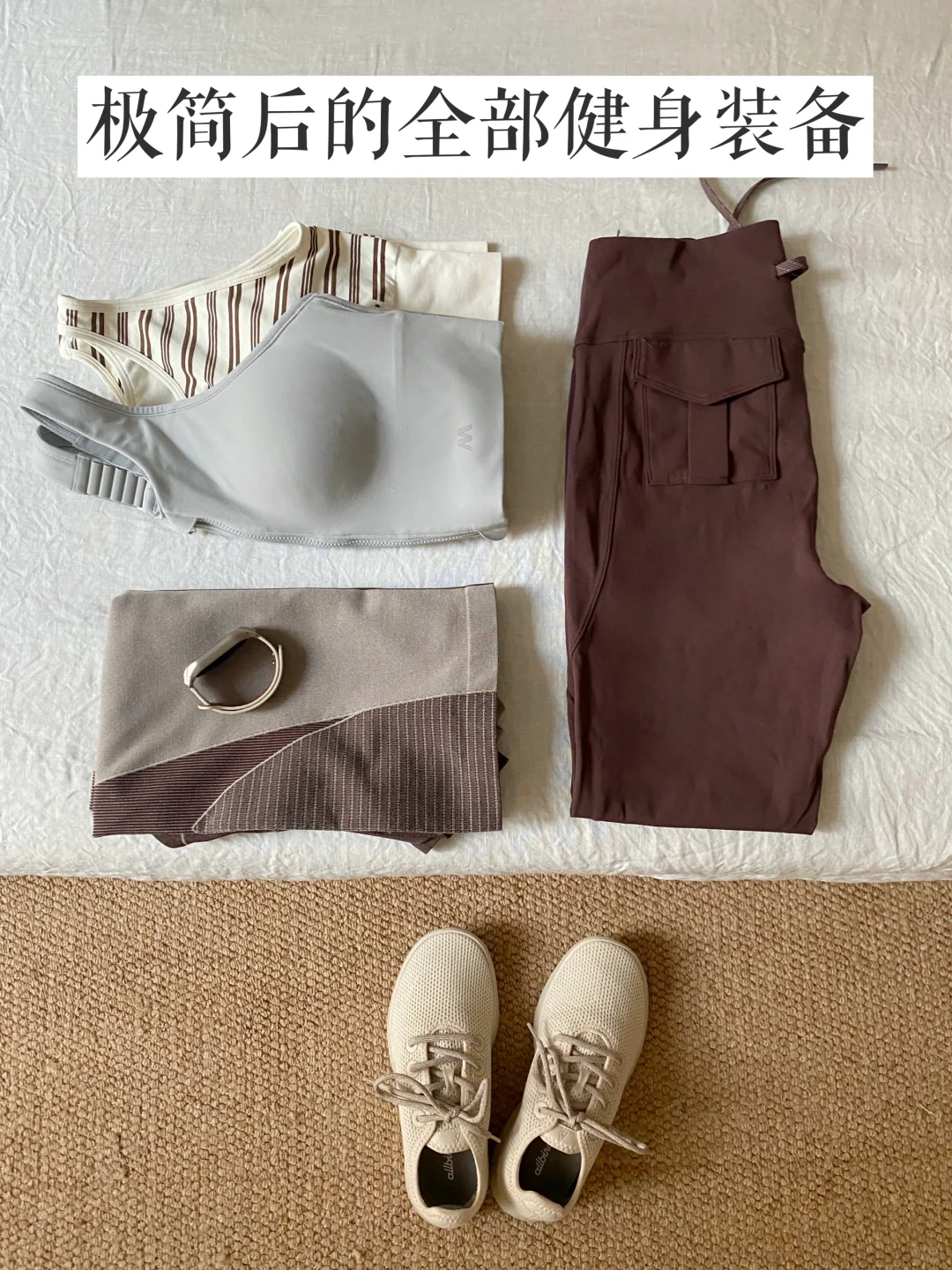 我的运动装备应该算很少了,没有瑜伽垫也没有各种健身器材,一周三四次的简单运动,这些衣物对我来说就足够了\n.\n🔘一双运动休闲鞋\n这双鞋脚感超级舒服,几乎没什么重量\n鞋面是有呼吸感的天丝网面,透气不闷\n包裹性和回弹性也很好,不需要磨合\n除了运动健身,日常通勤逛街也可以穿\n.\n🔘两件运动内衣\n运动内衣有两件换洗就够了\n我这两件都是中高强度的\n胸垫都是固定的,可以直接机洗\n前开拉链的更适合我这种懒人\n.\n🔘一件长袖\n长袖其实不是必需品,可替代性太强了\n不经常运动的话可以用棉质t恤代替\n冬天室内运动穿这一件就够了\n平时也可以当打底穿,物尽其用\n.\n🔘一条健身裤\n以前其实不喜欢健身穿紧身裤\n但这件是真舒服,跑跳蹲下都没压力\n包裹性也很好,还很显腿细\n夏天打算再购入一条运动短裤\n.\n🔘一个手表\n我对于运动手表没有很大的需求\n这种基础功能的手表就能满足\niWatch对我来说就有点功能过剩了\n这个手表还是几年前买的\n.\n比起健身装备的多少,行动起来更重要\n先养成运动的习惯再慢慢添置装备\n把行动提前,把花钱置后\n#精简生活 #我的运动装备 #运动穿搭 #运动也要穿好看 #健身穿搭 #运动内衣#运动休闲鞋#休闲鞋女推荐#休闲鞋穿搭#瑜伽裤