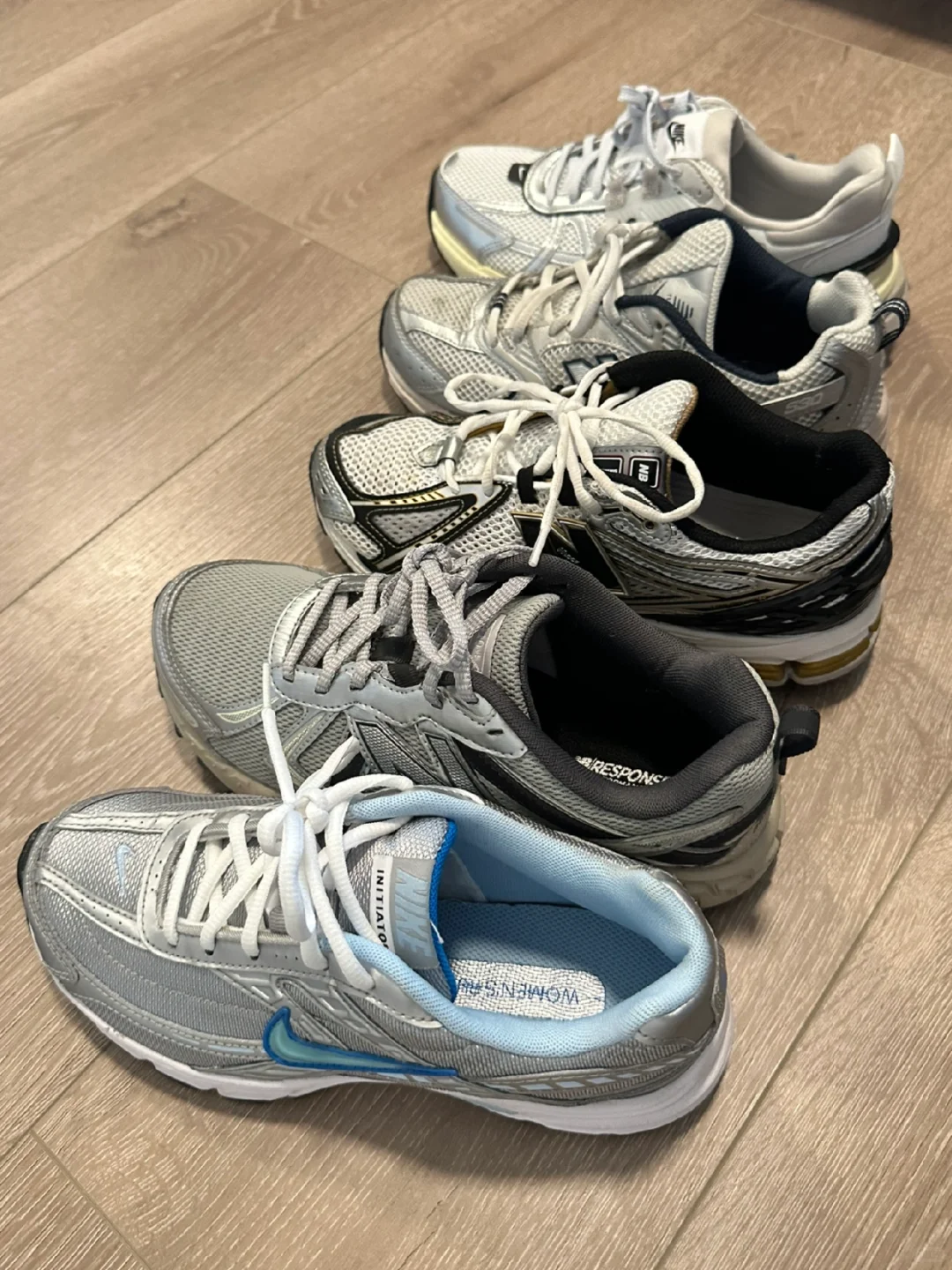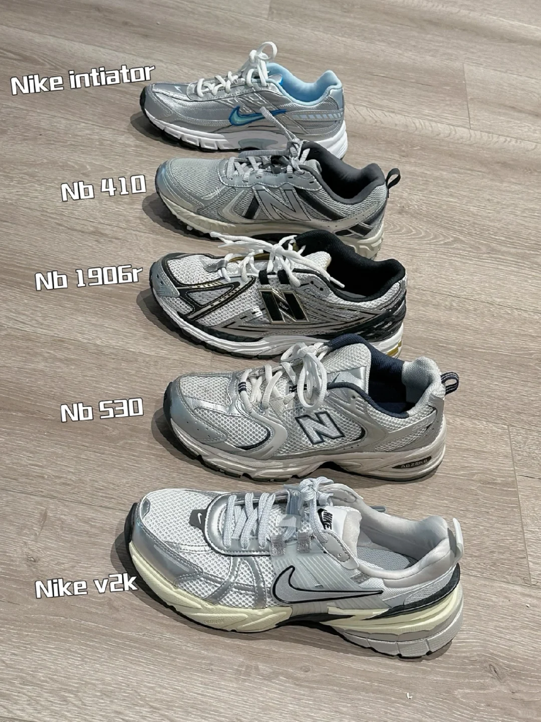 银色老爹鞋真的百搭!这几双是我日常经常穿的,脚长240cm,平常匡威37.5码,dunk38.5码,其他鞋基本38码,这几双附鞋码推荐。\nNb530银灰色,这是我笔记里的常客了,无敌百搭加好穿,人手必备一双!鞋码38码\n \nNb1906r,白银金属色,其实颜色应该是黑金才对。这双更酷一些,增高效果更明显,个人日常经常穿的一款,鞋码38.5码\n \nNb410银色,这双上脚还可以,但是整体外形质感没有其他两双好,毕竟价格摆在那里,鞋码38.5码\n耐克v2k,和530有点双胞胎的感觉,但是外形比530大一号,厚重感更强烈些,更适合搭配宽腿牛仔裤,最近的新宠。鞋码38.5\nNike initiator,纯银色运动鞋,这双更适合夏天光腿穿或者穿鲨鱼裤穿。搭配阔腿裤不好看,非常机械风,38号挤脚,推荐38.5码\n如果只能买一双,推荐nb530,具体细节可以看我置顶笔记,有钱的话,真的再强烈推荐下1906r,增高效果很好,而且相当百搭!\n#最百搭的鞋 #百搭老爹鞋 #鞋控的日常 #增高厚底鞋 #new b#Newbalance #新百伦 #运动鞋 #球鞋分享 #nike #耐克 #银色鞋