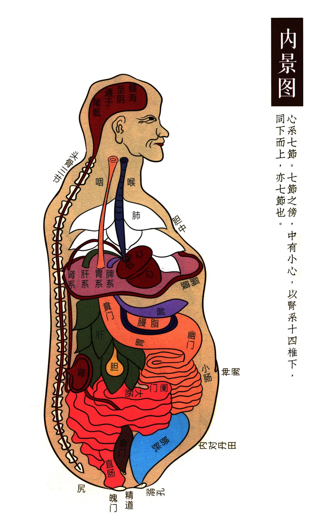 心系七節。七節之傍,中有小心,以腎系十四椎下, 同下而上,亦七節也。\n源自于《类经图翼》作者为明代的张介宾,\n \n《内景赋》:\n \n尝计夫人生根本兮,由乎元气。\n表里阴阳兮,升降沉浮。\n出入运行兮,周而复始。\n神机气立兮,生化无休。\n经络兮行乎肌表,脏腑兮通于咽喉。\n喉在前,其形坚健。\n咽在后,其质和柔。\n喉通呼吸之气,气行五脏。\n咽为饮食之道,六腑源头。\n气食兮何能不乱?主宰者会厌分流。\n从此兮下咽入膈,脏腑兮阴阳不侔。\n五脏者,肺为华盖,而上连喉管。\n肺之下,心包所护,而君主可求。\n此即膻中,宗气所从。\n膈膜周蔽,清虚上宫。\n脾居膈下,中州胃同。\n膜联胃左,运化乃功。\n肝叶障于脾后,胆腑附于叶东。\n两肾又居脊下,腰间有脉相通。\n主闭蛰封藏之本,为二阴天一之宗。\n此属喉之前窍,精神须赖气充。\n又如六腑,阳明胃先。\n熟腐水谷,胃脘通咽。\n上口称为贲门,谷气从而散宣。\n输脾经而达肺,诚脏腑之大源。\n历幽门之下口,联小肠而盘旋。\n再小肠之下际,有阑门者在焉。\n此泌别之关隘,分清浊于后前。\n大肠接其右,导渣秽于大便。\n膀胱无上窍,由渗泄而通泉。\n羡二阴之和畅,皆气化之自然。\n再详夫脏腑略备,三焦未言。\n号孤独之腑,擅总司之权。\n体三才而定位,法六合而象天。\n上焦如雾兮,霭氤氲之天气。\n中焦如沤兮,化营血之新鲜。\n下焦如渎兮,主宣通乎雍滞。\n此所以上焦主内而不出,下焦主出而如川。\n又总诸脏之所居,隔高低之非类。\n求脉气之往来,果何如而相济?\n以心主之为君,朝诸经之维系。\n是故怒动于心,肝从而炽。\n欲念方萌,肾经精沸。\n构难释之苦思,枯脾中之生意。\n肺脉涩而气沉,为悲忧于心内。\n惟脉络有以相通,故气得从心而至。\n虽诸脏之归心,实上系之联肺。\n肺气何生?根从脾胃。\n赖水谷于敖仓,化精微而为气。\n气旺则精盈,精盈则气盛。\n此是化源根,坎里藏真命。\n虽内景之缘由,尚根苗之当究。\n既云两肾之前,又曰膀胱之后。\n出大肠之上左,居小肠之下右。\n其中果何所藏?蓄坎离之交姤。\n为生气之海,为元阳之窦。\n辟精血于子宫,司人生之夭寿。\n称命门者是也,号天根者非谬。\n使能知地下有雷声,方悟得春光弥宇宙。