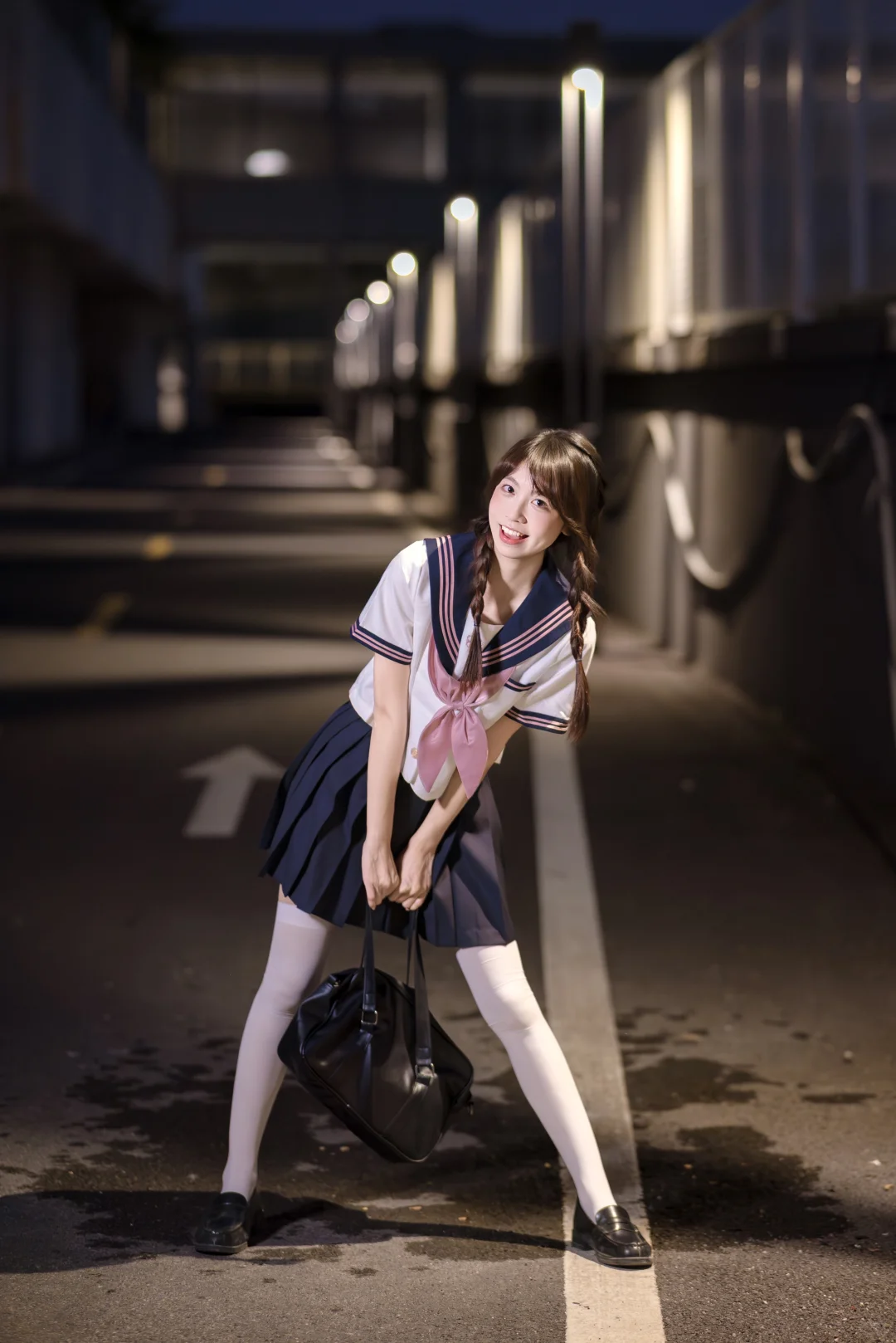 • 引导线构图:借助道路标线、路灯排列形成的线条,引导观众视线向人物延伸,增强画面纵深感。