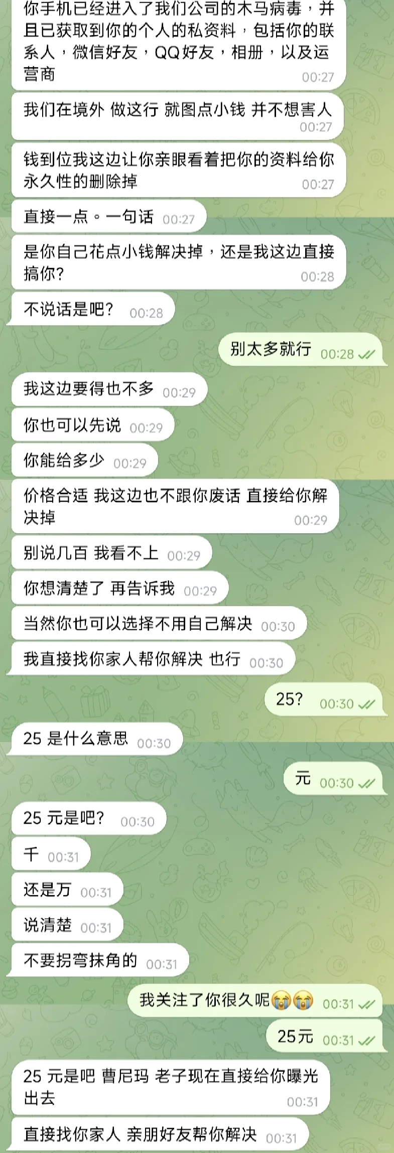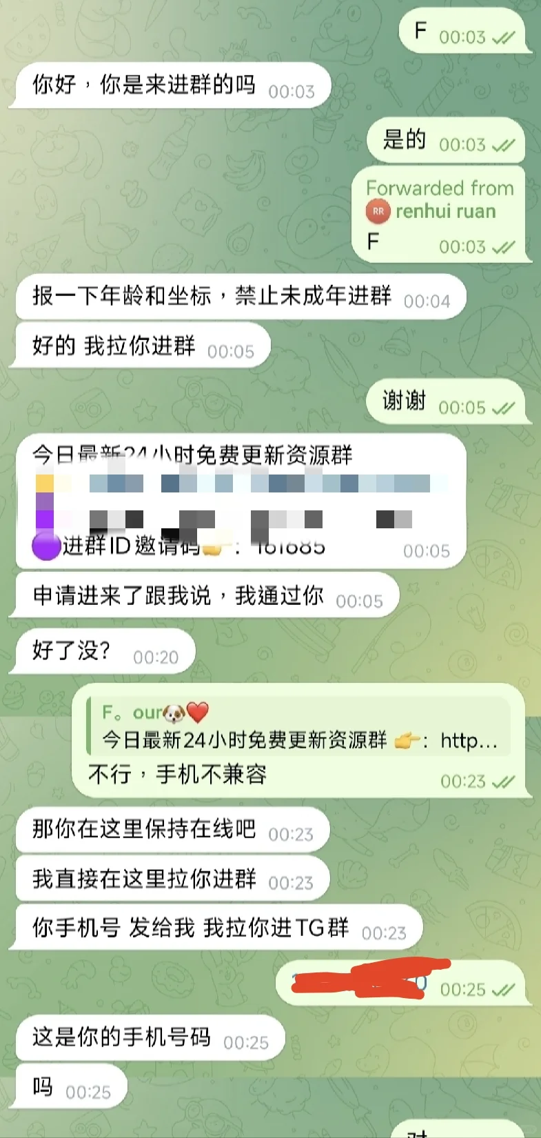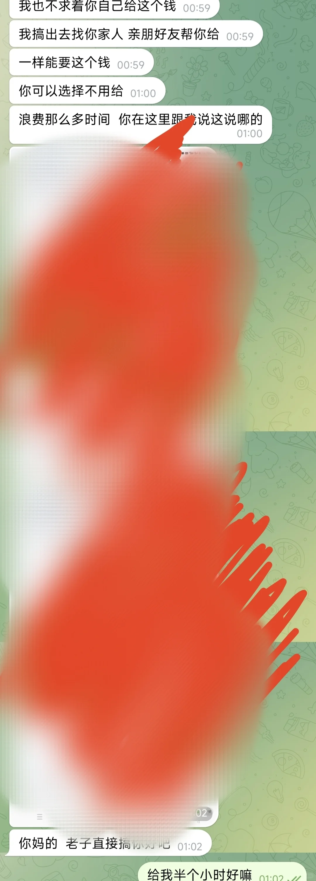 我是从抖音那里看到一个博主说有资源可以免费给,他就把我引诱到了电报群,他先是让我下载一个app,我下载好了 ,但是打不开,然后他就直接说让我发号码给他拉我进群,我就发了个号码,然后他就知道了我相册的所有照片,还有通讯录联系人,其实我通讯录联系人没几个,但是我的图库里面有我的身份证,营业执照还有驾照什么的,我就慌了,我就慌了,我一边和他拖延信息,一边打电话报警,不过报警卵用没有还要我三更半夜去派出所,他那边一直给我通讯录联系人发色擎内容然后联系我家人,要他们收到骚扰信息的话不要理,还有验证码轰炸了半个小时,都是一些贷款平台的验证码,有几百条,我当时真的很害怕,价格也从3800讲到300,不过我连300都拿不出来。接着他知道要不到钱就不理我了,不过我的手机隐私都被知道了。好吧人都是要吃饭要花钱💸的,以后不随便相信网上的那些信息了,世界上还是坏人比较多。小红书不要限我流量让更多人看到。#谨防上当受骗 #防骗 #外网诈骗 #tg #TG电报
