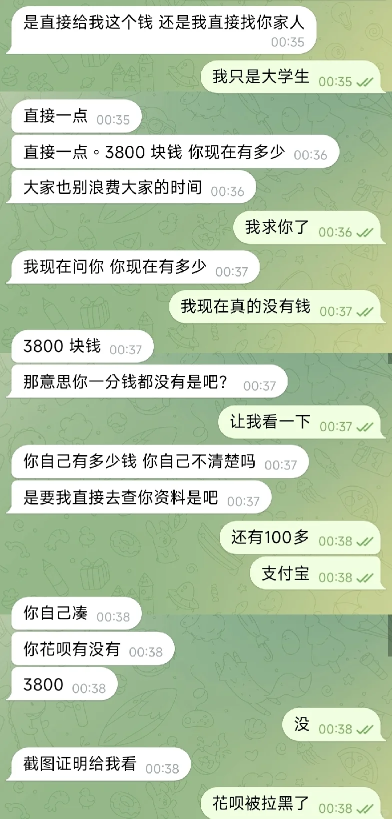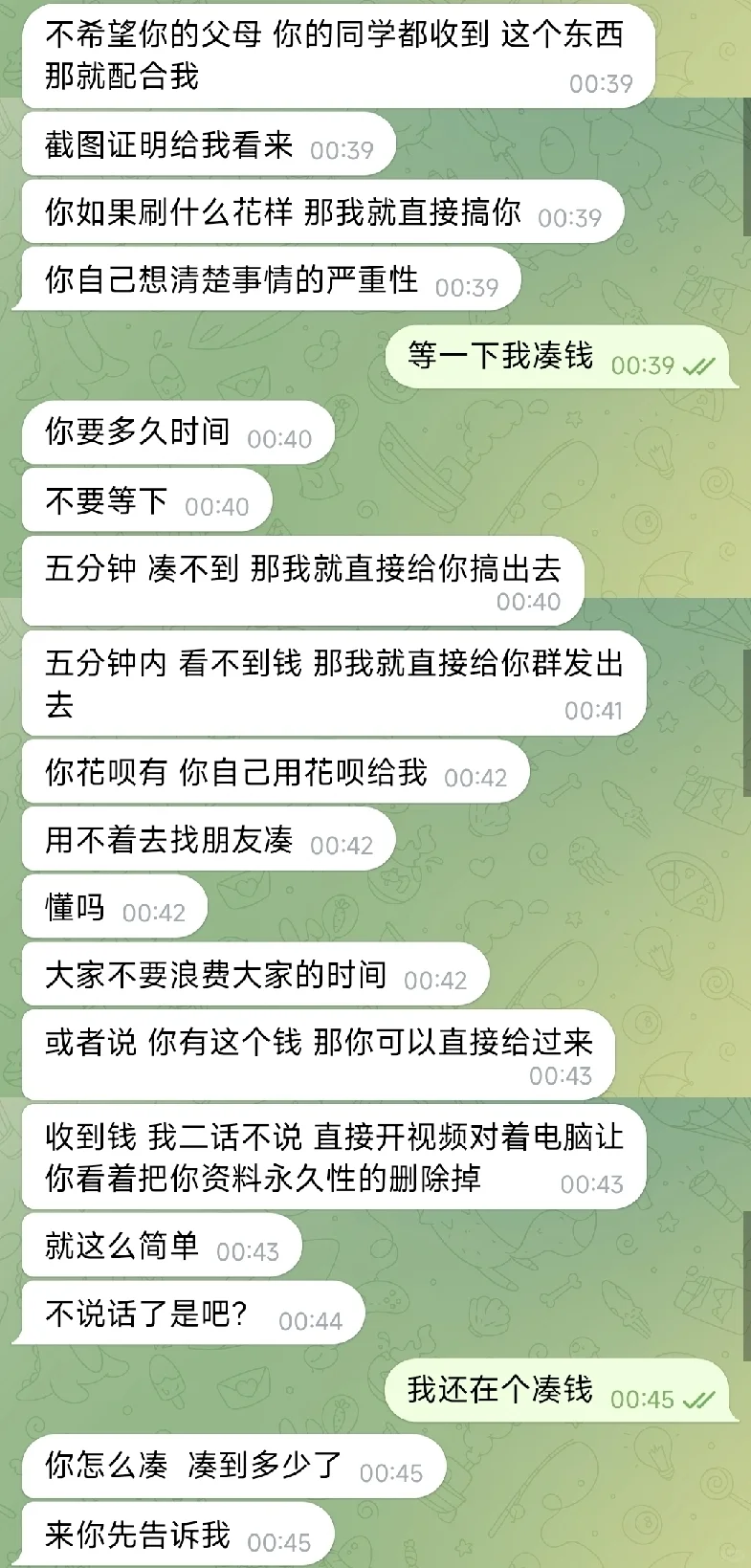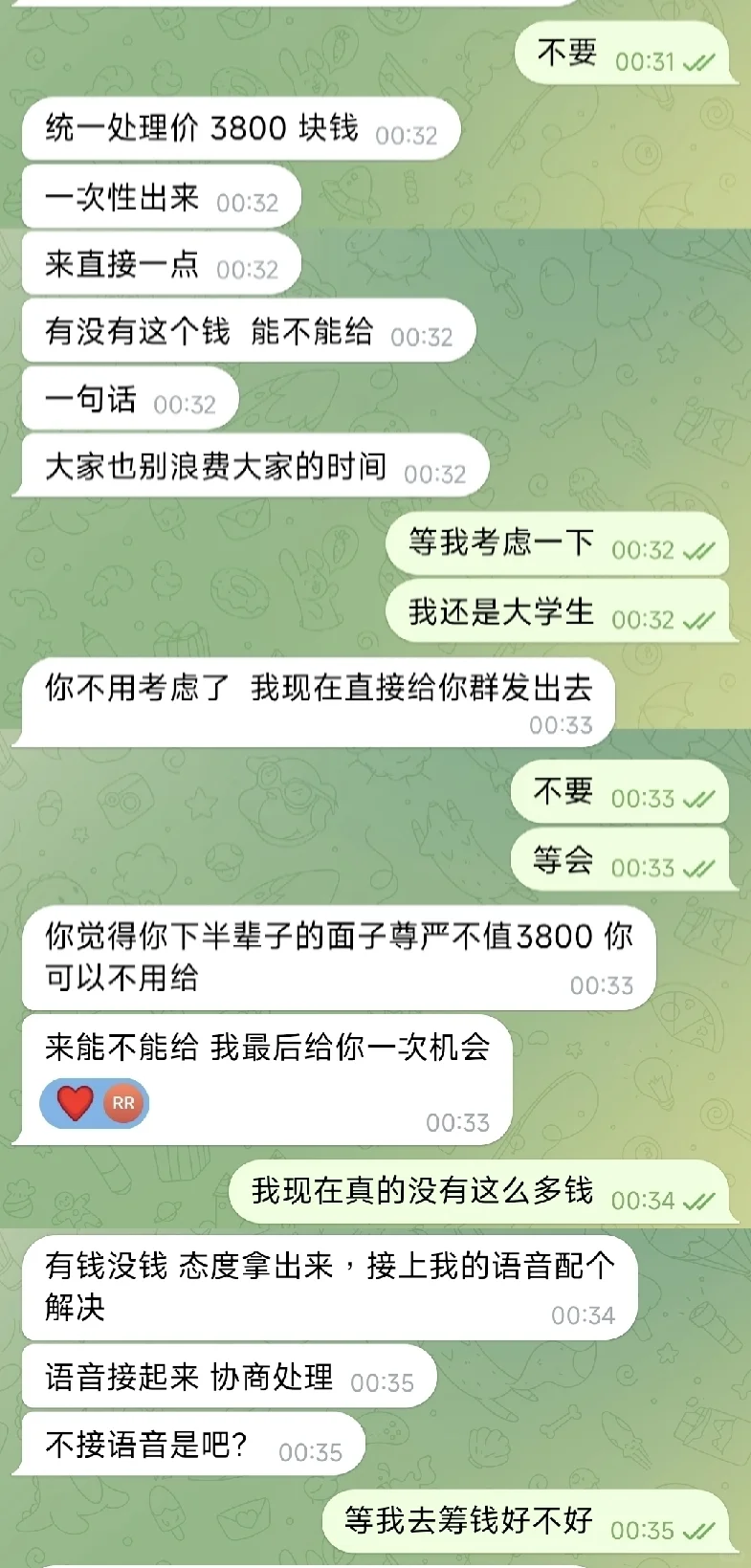 我是从抖音那里看到一个博主说有资源可以免费给,他就把我引诱到了电报群,他先是让我下载一个app,我下载好了 ,但是打不开,然后他就直接说让我发号码给他拉我进群,我就发了个号码,然后他就知道了我相册的所有照片,还有通讯录联系人,其实我通讯录联系人没几个,但是我的图库里面有我的身份证,营业执照还有驾照什么的,我就慌了,我就慌了,我一边和他拖延信息,一边打电话报警,不过报警卵用没有还要我三更半夜去派出所,他那边一直给我通讯录联系人发色擎内容然后联系我家人,要他们收到骚扰信息的话不要理,还有验证码轰炸了半个小时,都是一些贷款平台的验证码,有几百条,我当时真的很害怕,价格也从3800讲到300,不过我连300都拿不出来。接着他知道要不到钱就不理我了,不过我的手机隐私都被知道了。好吧人都是要吃饭要花钱💸的,以后不随便相信网上的那些信息了,世界上还是坏人比较多。小红书不要限我流量让更多人看到。#谨防上当受骗 #防骗 #外网诈骗 #tg #TG电报