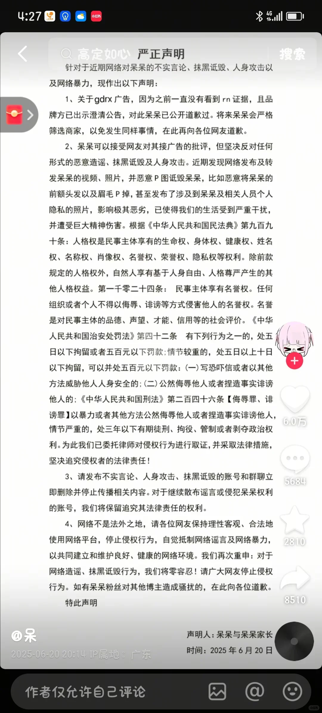 关于呆呆做个声明请大家不要网暴她了