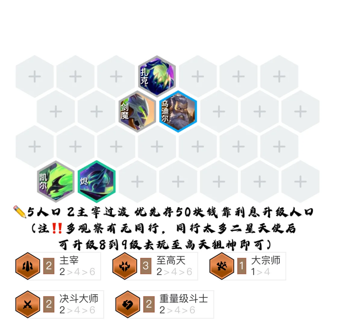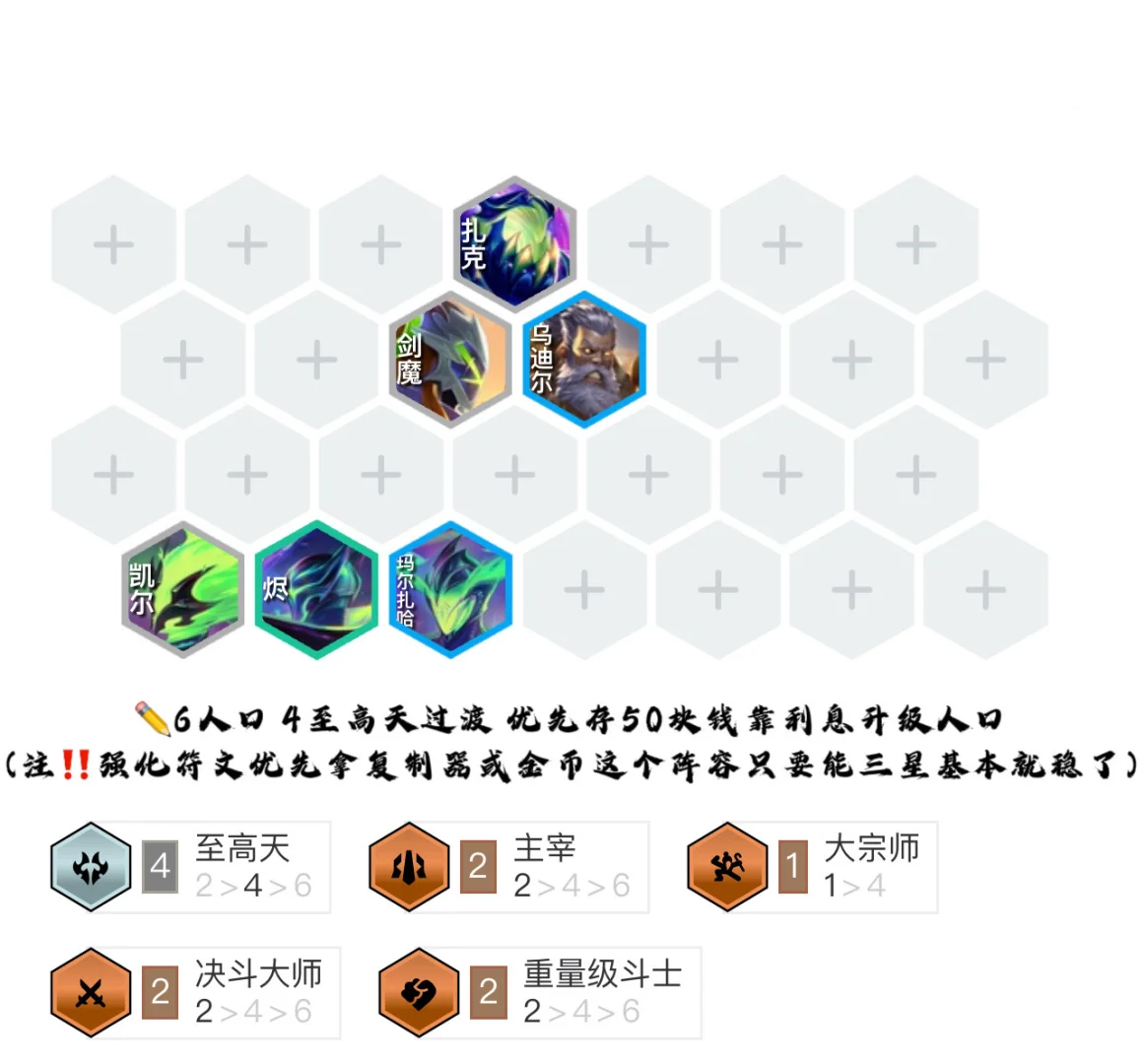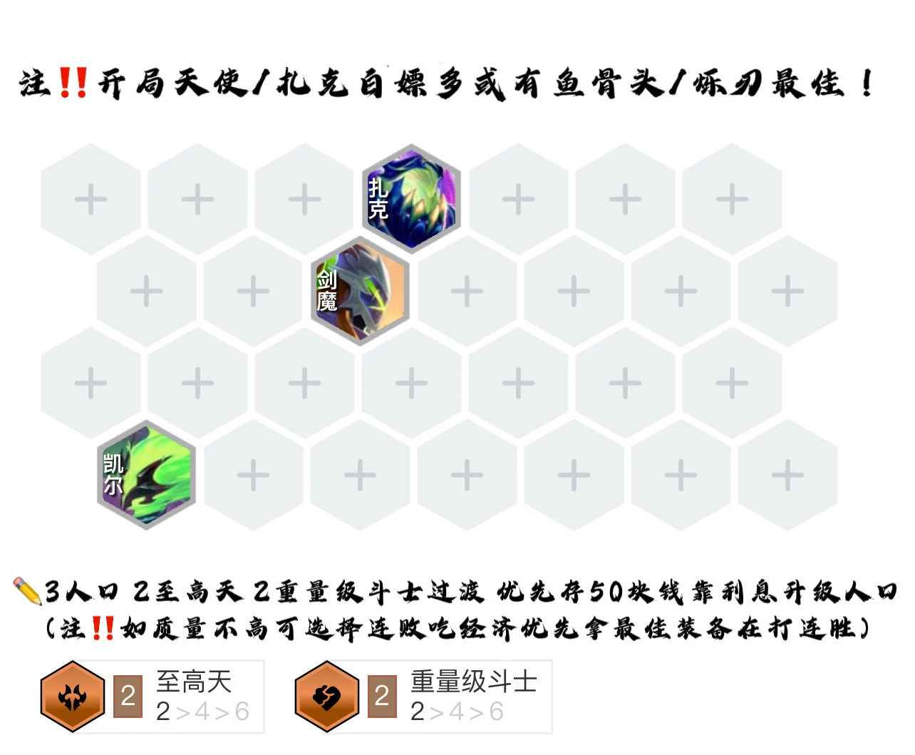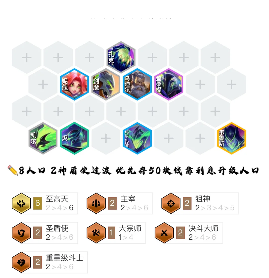 🌟阵容强度推荐:铲铲(S) 云顶(A)\n \n🌟海克斯推荐: 休眠锻炉 团队建设 无序进化 至高天之徽 暗影渐浓 黑暗其内 天生二星 寻宝 月光 棘刺镀板铠甲 英勇福袋\n \n🌟奥恩神器推荐:烁刃/鱼骨头/狙击手(天使必备)\n \n🌟强化果实推荐:\n✏️主C天使:英雄弧光/战力超过9000/双重打击\n✏️主T扎克:最大活力/抵抗/二周目/孤身战场\n \n🌟运营思路教学:\n注‼️开局天使/扎克白嫖多或有鱼骨头/烁刃最佳!\n✏️3人口 2至高天 2重量级斗士过渡 优先存50块钱靠利息升级人口(注‼️如质量不高可选择连败吃经济优先拿最佳装备在打连胜)\n \n✏️4人口 2决斗大师过渡 优先存50块钱靠利息升级人口(注‼️ 第一个强化果实给扎克:最大活力或奇点成长血量过渡)(注‼️存够50正常3阶段开始D可以卡10块钱利息D出扎克/天使三星即可升级人口)\n \n✏️5人口 2主宰过渡 优先存50块钱靠利息升级人口(注‼️多观察有无同行,同行太多二星天使后可升级8到9级去玩至高天狙神即可)\n \n✏️6人口 4至高天过渡 优先存50块钱靠利息升级人口(注‼️强化符文优先拿复制器或金币这个阵容只要能三星基本就稳了)\n \n✏️7人口 2狙神过渡 优先存50块钱靠利息升级人口\n \n✏️8人口 2神盾使过渡 优先存50块钱靠利息升级人口\n \n✏️9人口 启动D出体系高费卡抽二星即可阵容大成(注‼️需注意外面4费卡情况选择卡牌和自身D出3星4费稳定吃鸡)\n \n这是一套运营过渡高费的体系阵容,希望能帮助各位姐妹和宝子,祝各位上分大吉\n#女铲 #金铲铲推荐 #金铲铲之战教学 #金铲铲S15 #金铲铲天下无双格斗大会