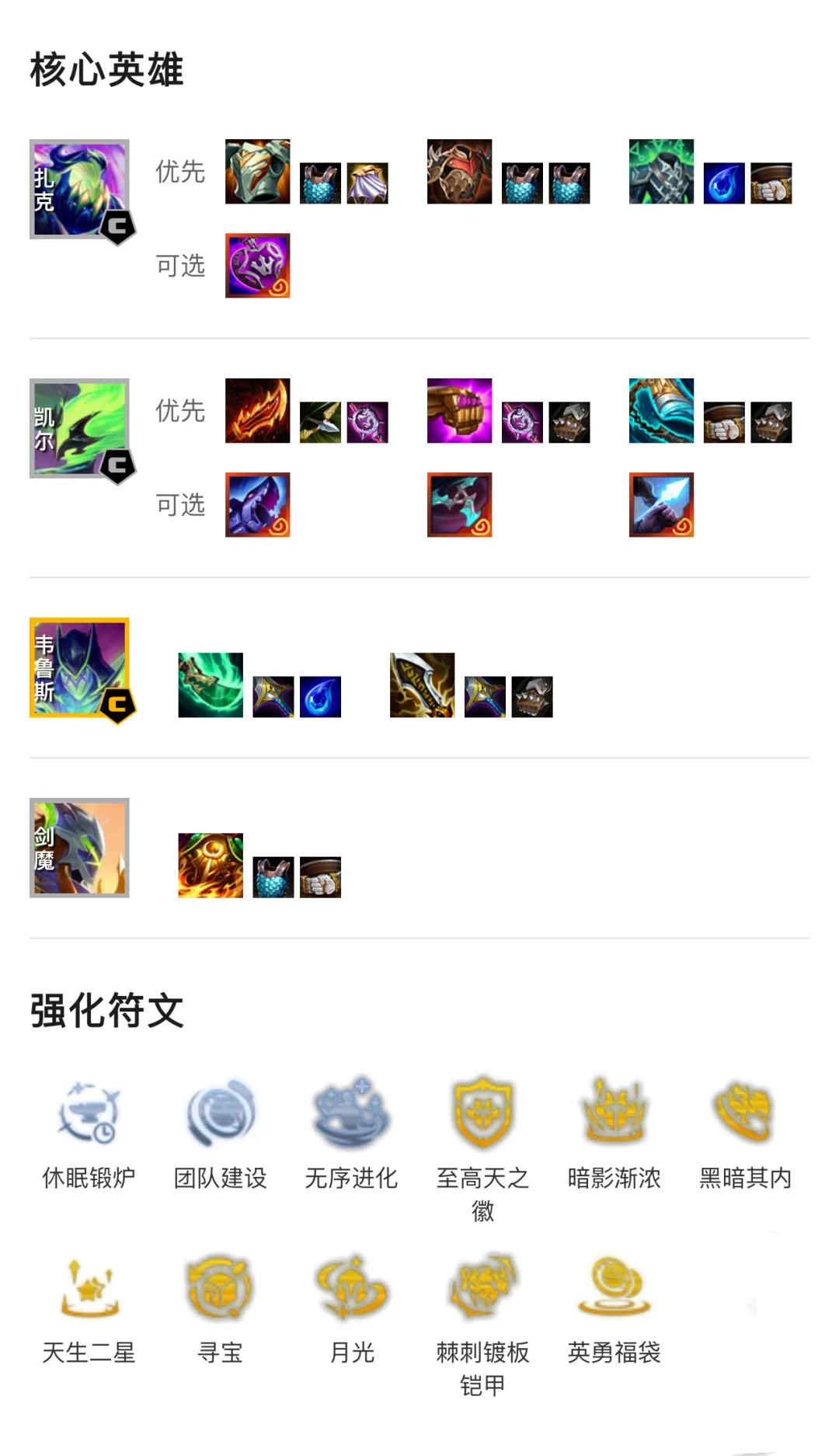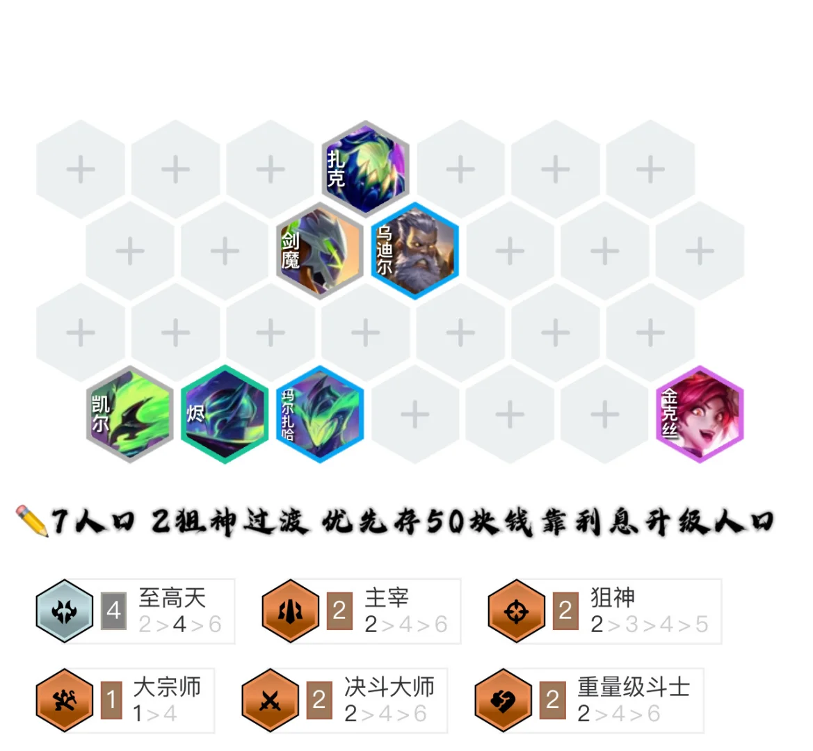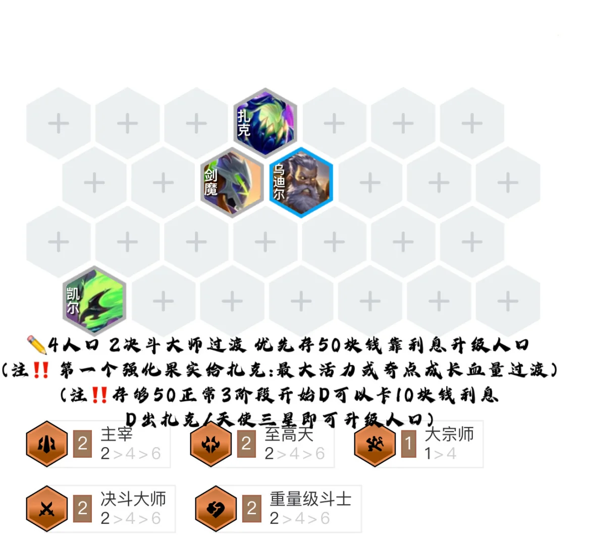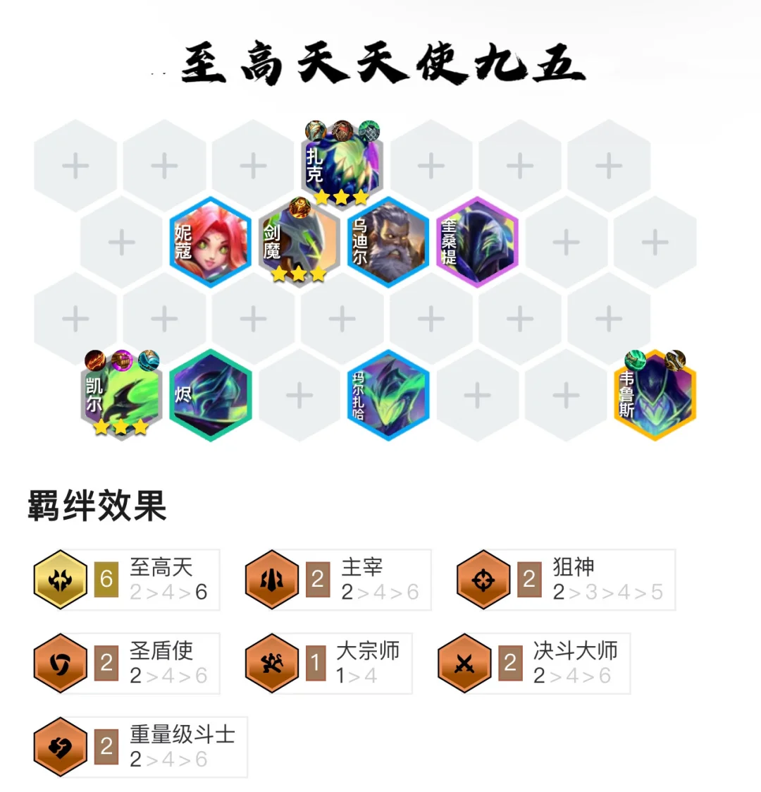 🌟阵容强度推荐:铲铲(S) 云顶(A)\n \n🌟海克斯推荐: 休眠锻炉 团队建设 无序进化 至高天之徽 暗影渐浓 黑暗其内 天生二星 寻宝 月光 棘刺镀板铠甲 英勇福袋\n \n🌟奥恩神器推荐:烁刃/鱼骨头/狙击手(天使必备)\n \n🌟强化果实推荐:\n✏️主C天使:英雄弧光/战力超过9000/双重打击\n✏️主T扎克:最大活力/抵抗/二周目/孤身战场\n \n🌟运营思路教学:\n注‼️开局天使/扎克白嫖多或有鱼骨头/烁刃最佳!\n✏️3人口 2至高天 2重量级斗士过渡 优先存50块钱靠利息升级人口(注‼️如质量不高可选择连败吃经济优先拿最佳装备在打连胜)\n \n✏️4人口 2决斗大师过渡 优先存50块钱靠利息升级人口(注‼️ 第一个强化果实给扎克:最大活力或奇点成长血量过渡)(注‼️存够50正常3阶段开始D可以卡10块钱利息D出扎克/天使三星即可升级人口)\n \n✏️5人口 2主宰过渡 优先存50块钱靠利息升级人口(注‼️多观察有无同行,同行太多二星天使后可升级8到9级去玩至高天狙神即可)\n \n✏️6人口 4至高天过渡 优先存50块钱靠利息升级人口(注‼️强化符文优先拿复制器或金币这个阵容只要能三星基本就稳了)\n \n✏️7人口 2狙神过渡 优先存50块钱靠利息升级人口\n \n✏️8人口 2神盾使过渡 优先存50块钱靠利息升级人口\n \n✏️9人口 启动D出体系高费卡抽二星即可阵容大成(注‼️需注意外面4费卡情况选择卡牌和自身D出3星4费稳定吃鸡)\n \n这是一套运营过渡高费的体系阵容,希望能帮助各位姐妹和宝子,祝各位上分大吉\n#女铲 #金铲铲推荐 #金铲铲之战教学 #金铲铲S15 #金铲铲天下无双格斗大会