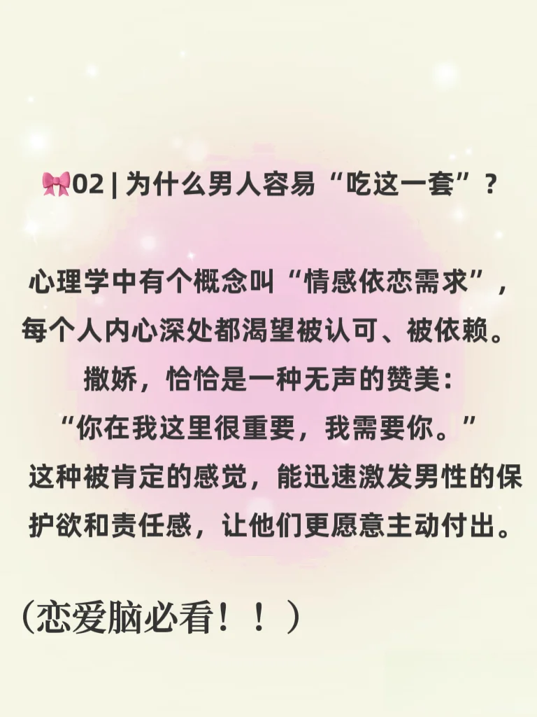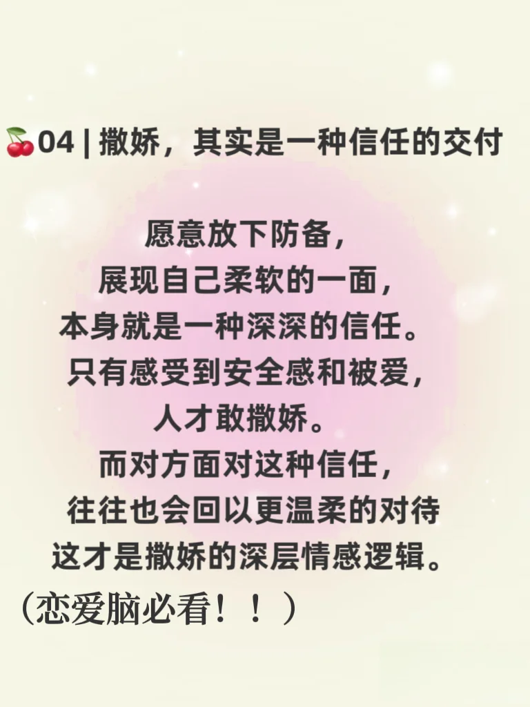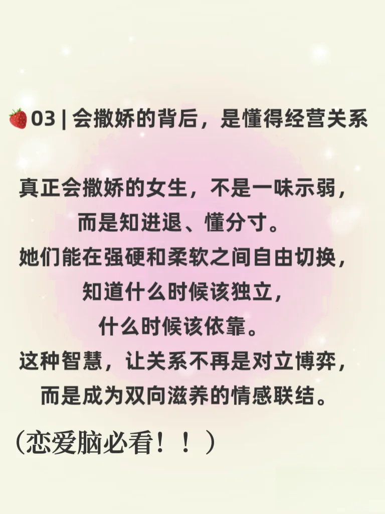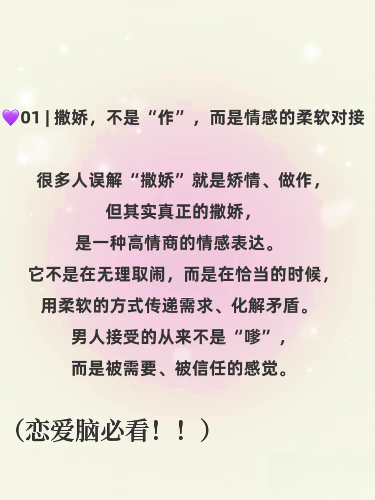 《男人真的很吃狐媚子?撒娇背后的情感密码,其实比想象中更动人》😍😍一定要点赞收藏哦\n \n💜💜不知道你有没有发现:\n生活中那些看起来“冷硬”的男人,遇到会撒娇、懂示弱的女生,常常瞬间没脾气。明明刚才还皱着眉一脸严肃,对方一句软软糯糯的“拜托嘛~”,他的嘴角就不自觉地上扬; 明明刚才还在坚持原则、毫不退让,对方轻轻拉一拉他的衣角,眼神一软,他就忍不住让步。有人说这是“狐媚子”,是“撒娇女人最好命”,但真相,真的只是表面这么简单吗?\n💕撒娇不是技巧,而是一种自然流露的情感语言。 💕\n它让爱不再是冰冷的道理博弈,而是温暖的感受流动。\n真正聪明的女人,不是学会怎么“媚”,而是懂得如何爱\n既能自信独立,也能安心依赖; 既能讲道理,也会谈感情。而真正爱你的男人,从来不是因为你多“会撒娇”才选择让步,而是因为那个人是你,他愿意用温柔回应温柔。\n所以啊,男人不是真的吃“狐媚子”那一套,他们吃的,始终是那一份独属于彼此的情感默契与真心相待。\n爱不是谁征服谁,而是我在你这里,可以安心做回小孩。💜❤️💜💕💗🩵#亲密关系 #怎样让男人更爱你 #让男生偷偷喜欢上你 #让男人上头 #什么样的女人吸引男人#高情商女人 #恋爱指南 #让男人离不开你 #让男人喜欢你 #女人会撒娇