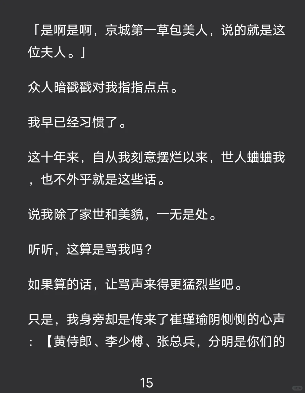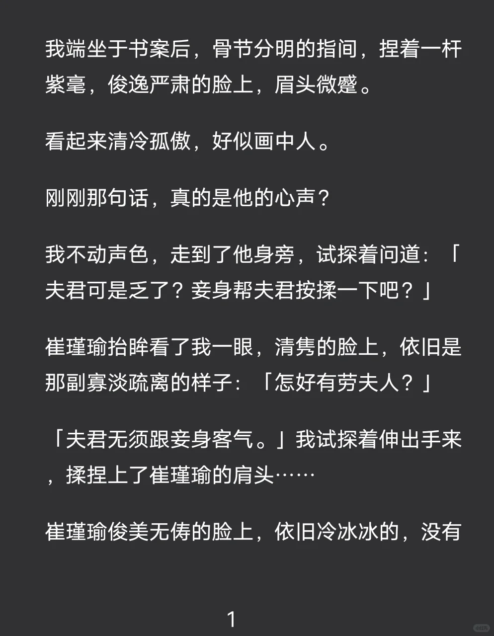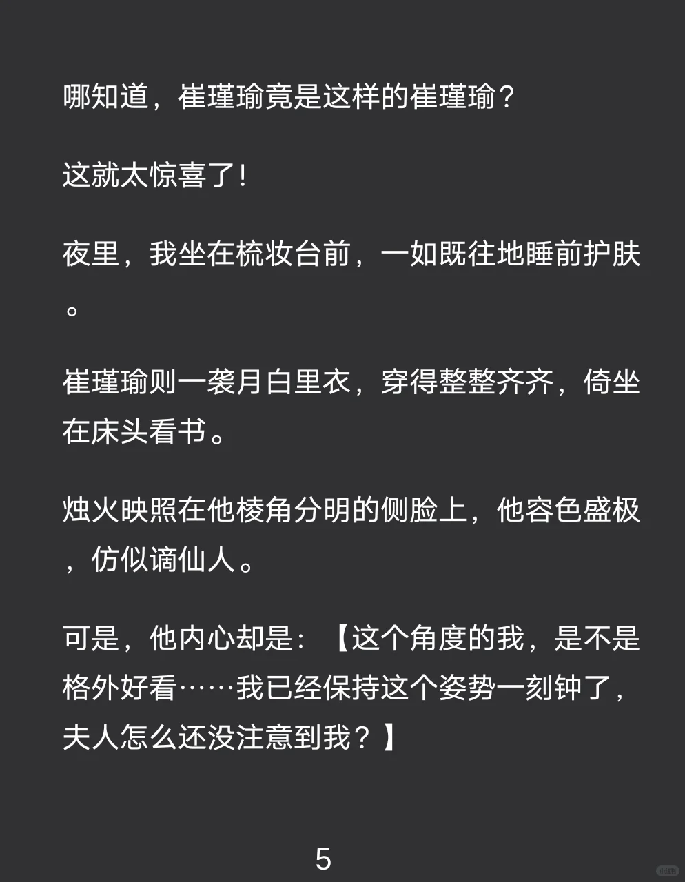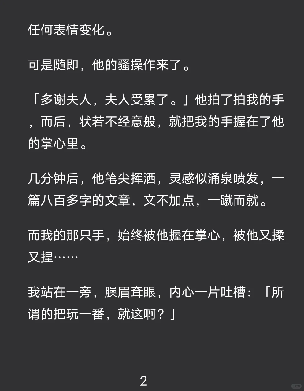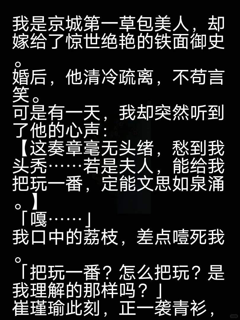 我是京城第一草包美人,却嫁给了惊世绝艳的铁面御史。\n婚后,他清冷疏离,不苟言笑。\n可是有一天,我却突然听到了他的心声:\n【这奏章毫无头绪,愁到我头秃……若是夫人,能给我把玩一番,定能文思如泉涌。】\n「嘎……」\n我口中的荔枝,差点噎死我。\n「把玩一番?怎么把玩?是我理解的那样吗……《伊人魅惑》