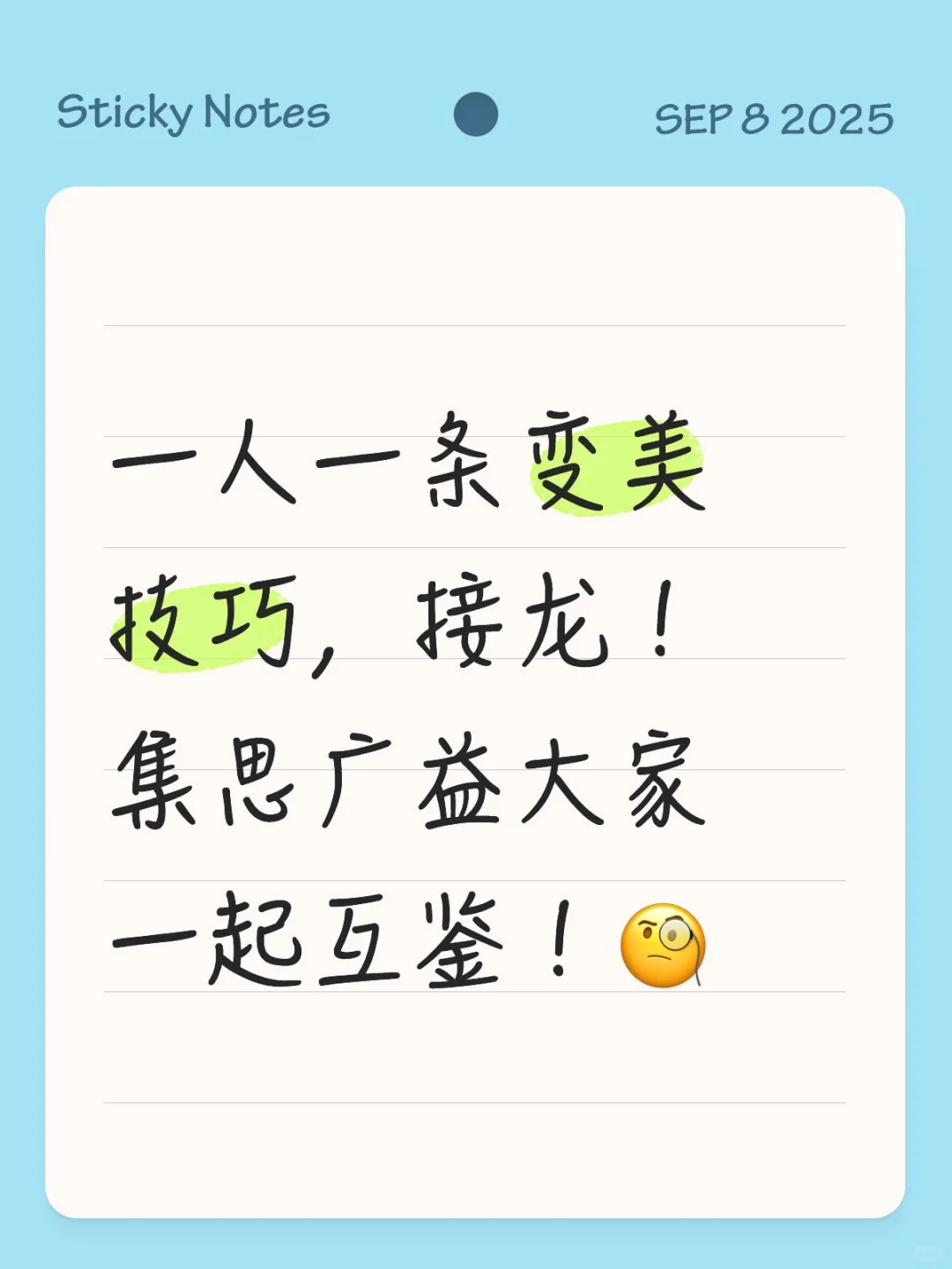 从我开始,1.大家常出现喜欢吃零食 皮肤不好等情况 多喝水每天八杯水少量多次,时间表可以去网上搜!我认为人总是想着吃吃吃最好解决办法就是水!!!当你水喝够了就不会有余地吃,这也是为什么饭前一杯水容易不长胖!\n2.练b站苏苏的瘦双下巴加dy周六野七日塑形课,为什么我推荐周六野?因为她强度比较小适合女孩子而且性价比很高,最适合新手。\n3.防晒遵循abc原则,体育课我都不去上的直接走,那些抹防晒的也不见得比我白,大家别学我。。\n4.规范坐姿 不要二郎腿。练腿,假胯宽很丑\n5.多观察别人,少去评价。你不要看着一个人总去说啊啊啊她美她丑,你要去想为什么她美又为什么另一个丑,发型皮肤妆容身材穿搭习惯,有哪些通过观察你能去学习,那些变丑的习惯哪些你沾染了你要避免预防透过别人看自己去警醒。\n评论区可以说说自己变美的所有东西 包括妆容的新发现 发型等等 一切关于美的都行。#变美新思路 #想要变好看\n也谢谢大家的观看 希望能启发大家