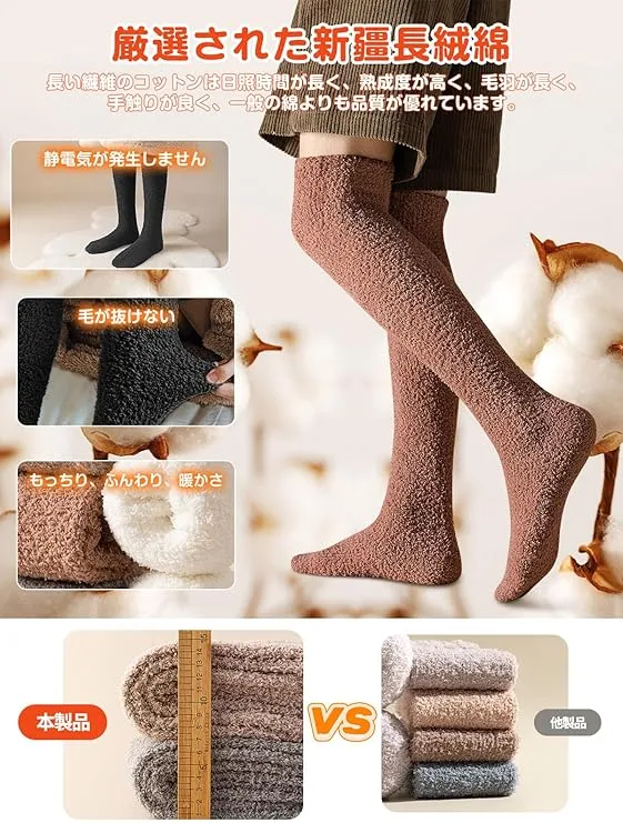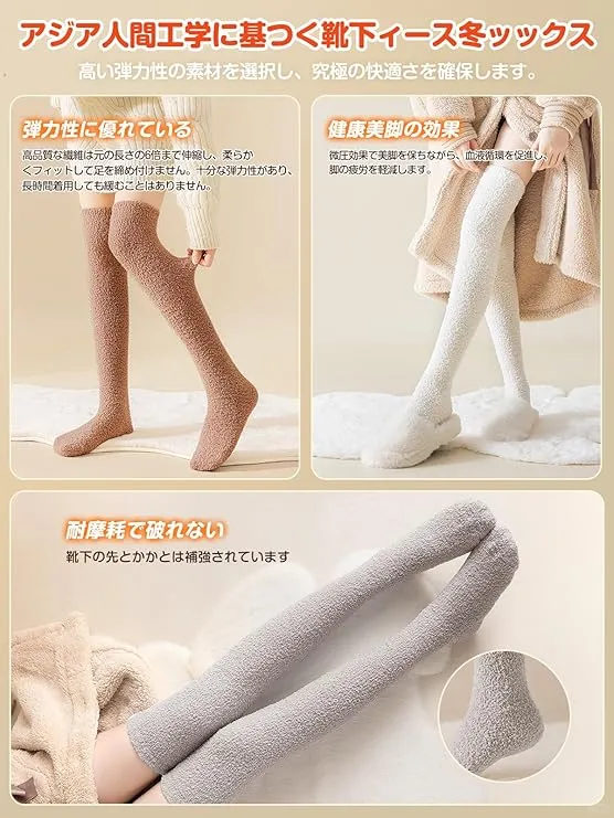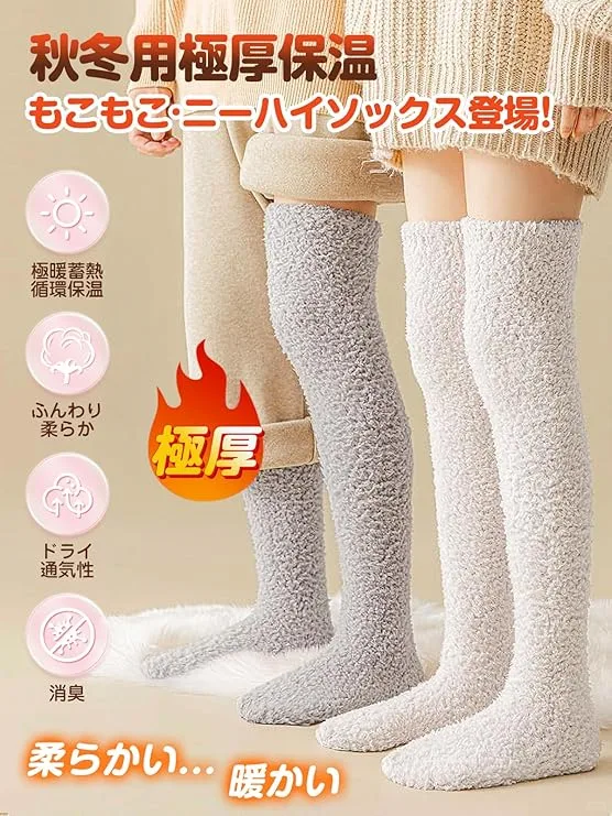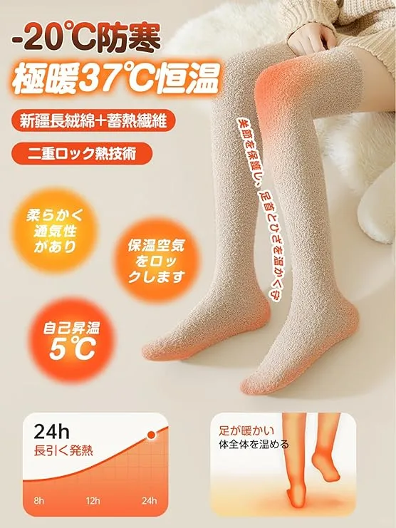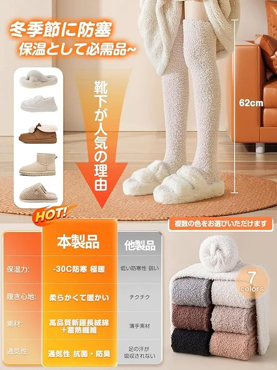 【极寒应对冬季最佳加厚袜子女士冬菇】这款尼高袜使用高品质的新疆长毛绒棉和蓄热纤维,采用双层锁热技术,确保出色的保温性和舒适性。 防寒性、耐寒性、除臭抗菌性、通气性、舒适性、柔软性等这些特性为冬季提供了最佳的使用体验。 毛毛袜子非常厚,保温性是普通短袜的4-5倍,温暖地包裹脚。 保护关节,温暖保护脚踝和膝盖。 这个长袜的材料,就像云一样柔软透气,给人一种温柔包裹的温和触感。\n【美腿效果】尺寸: 62cm。 这个蝙蝠袜子,使用了有伸缩性的素材,实现了出色的穿着舒适度。 高质量的纤维伸缩到原来长度的6倍,柔软合身,不扎脚。 长时间佩戴也不会松弛。 衬托出美腿效果,牢牢地复盖着大腿和小腿。 膝袜与裤袜和低跟袜的搭配也很出色,鞋口周围用橡胶不会滑落。 男女兼用,作为秋冬内裤类型的贴身内衣使用,实现保温效果。\n【抗菌袜透气性、高弹性、高精度的匠技】这款尼高袜是基于亚洲人体工程学,根据脚的形状正确缝制的防寒袜。 即使长时间穿也不会对脚感到束缚感。 袜子口的加强处理,弹性正好,寒风难以进入,脚趾和脚后跟也进行了加强处理,比普通的袜子更耐用。 这是一种吸湿性优异,具有强大抗菌除臭效果的冬季袜子,能迅速吸收汗水和湿气,抑制滑动和潮湿,消除脚臭,保持脚干燥舒适。 多亏了发热的保温羊毛材料,保温袜子特别适合怕冷的男女。\n【双足袜/三双足袜男女兼用的短袜】这个章鱼高统袜共有5种颜色,可以选择不同颜色组合的套装。 无论是舒适还是时尚,都能提供惊喜和满足! 容易搭配衣服,男女兼用。 蓬松、柔软、温暖、不掉毛,不会产生静电。 睡觉、产后护理、户外活动、通勤,可在不同场合使用,温暖保护脚。 作为礼物,也推荐这双时尚防寒加厚袜!\n【冬天穿上了温暖的礼物,很暖和】推荐给正在找能很好地遮住大腿和小腿的短袜的人。 是冬季必需品之一,可舒适地用于工作、学校、睡觉、跑步、露营、郊游、滑雪、登山等。 室内外都可以使用,非常方便。 给朋友和家人的礼物:无论是情侣、父母、祖父母、亲密的朋友,还是任何你想传递温暖的人,都是完美的一双。 生日、喜事、节日、纪念日等,这个桃子高统袜可以作为礼物送给你。\n#好物推荐 #日本 #日本生活 #温暖从脚下开始 #冬日时尚必备 #冬季保暖袜 #冬季防寒防冻 #长筒袜 #过膝袜 #在日华人